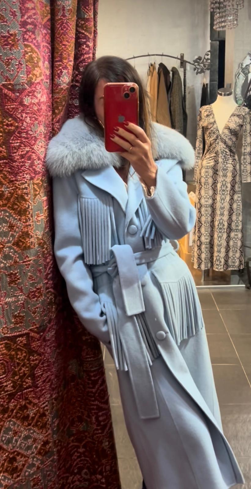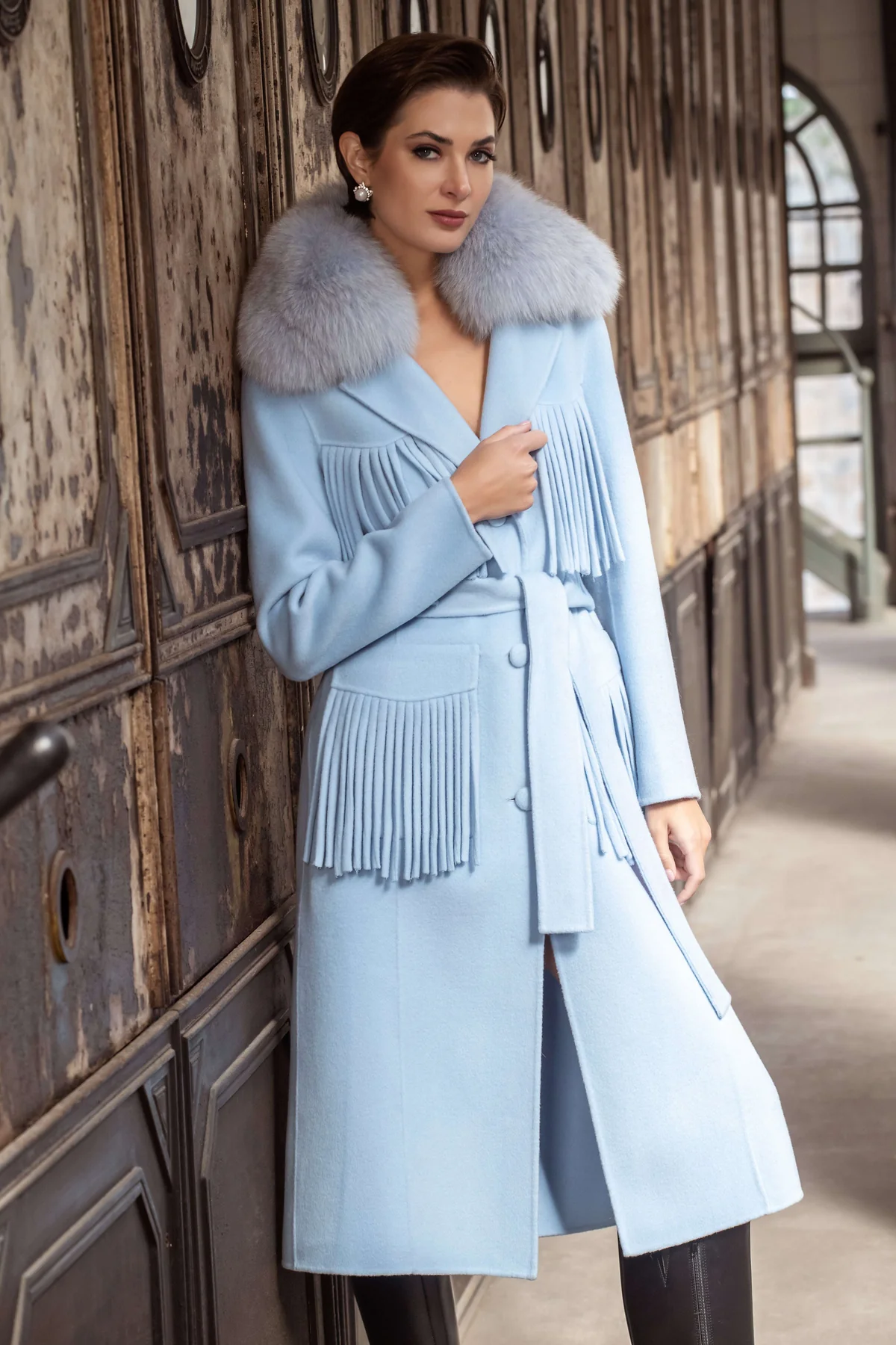 Abrigo azul suave de 100% lana virgen con cuello de piel de zorro azul. Sin forro, ligero y elegante, con cinturón ajustable para un ajuste perfecto. Los flecos en la parte delantera le dan un toque moderno.