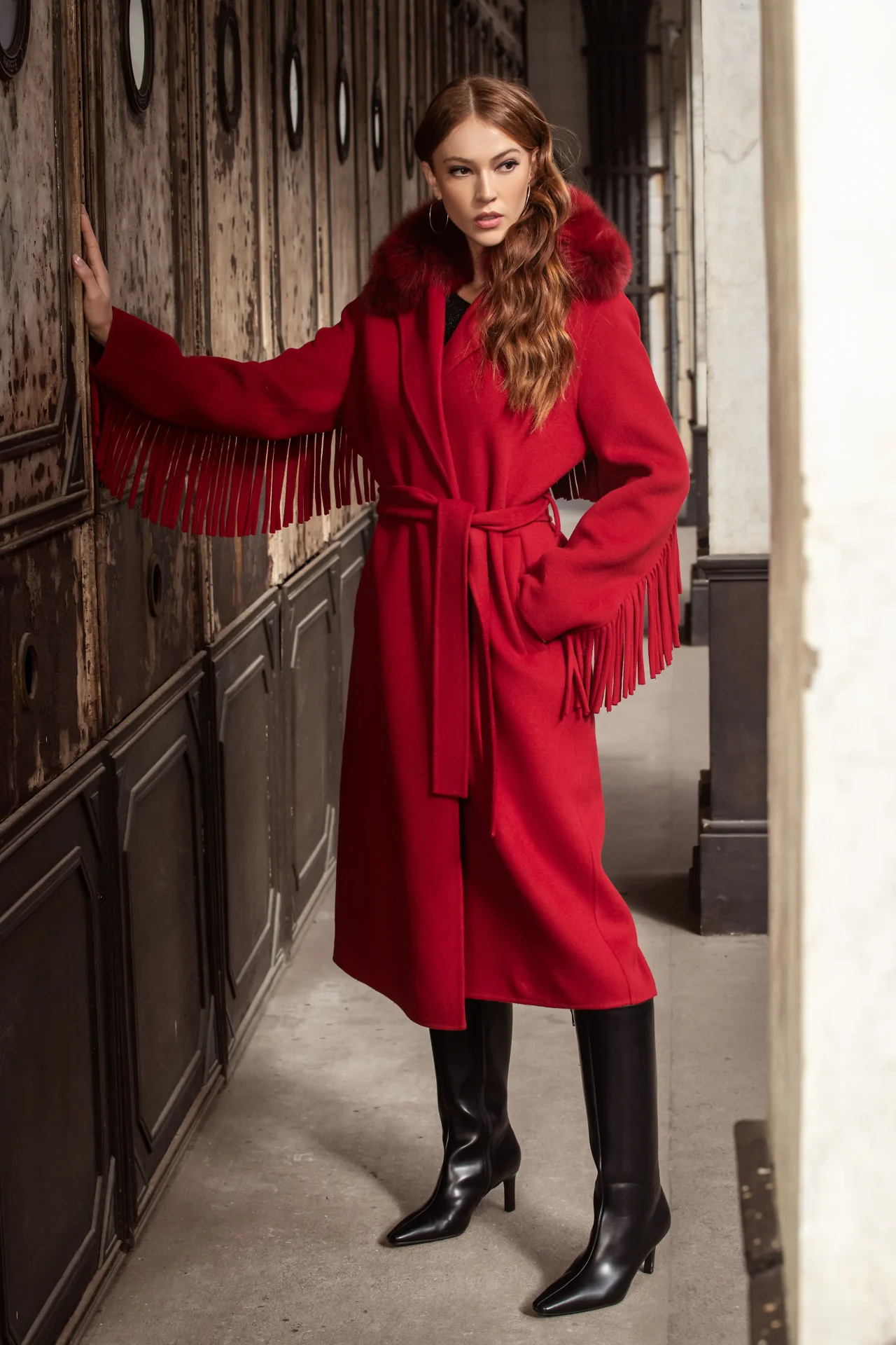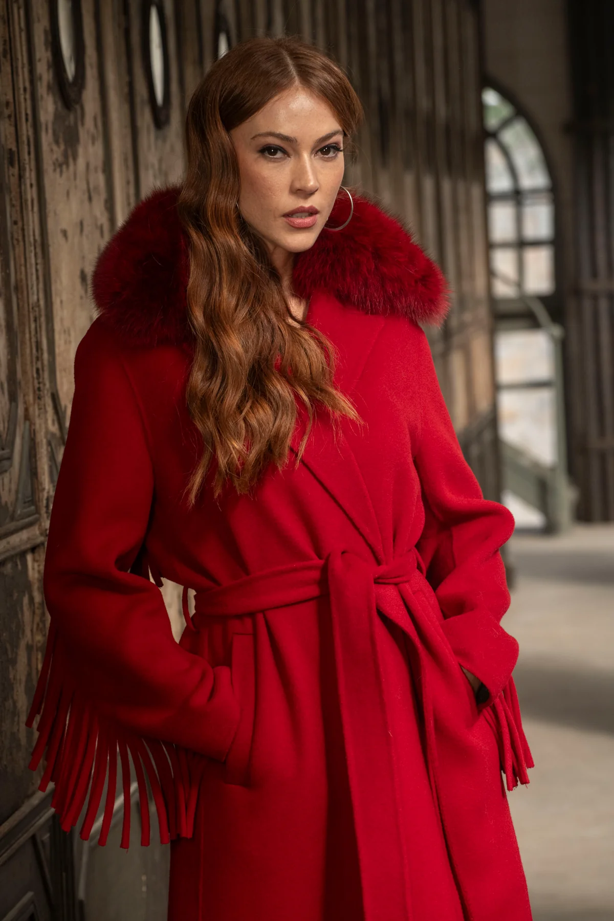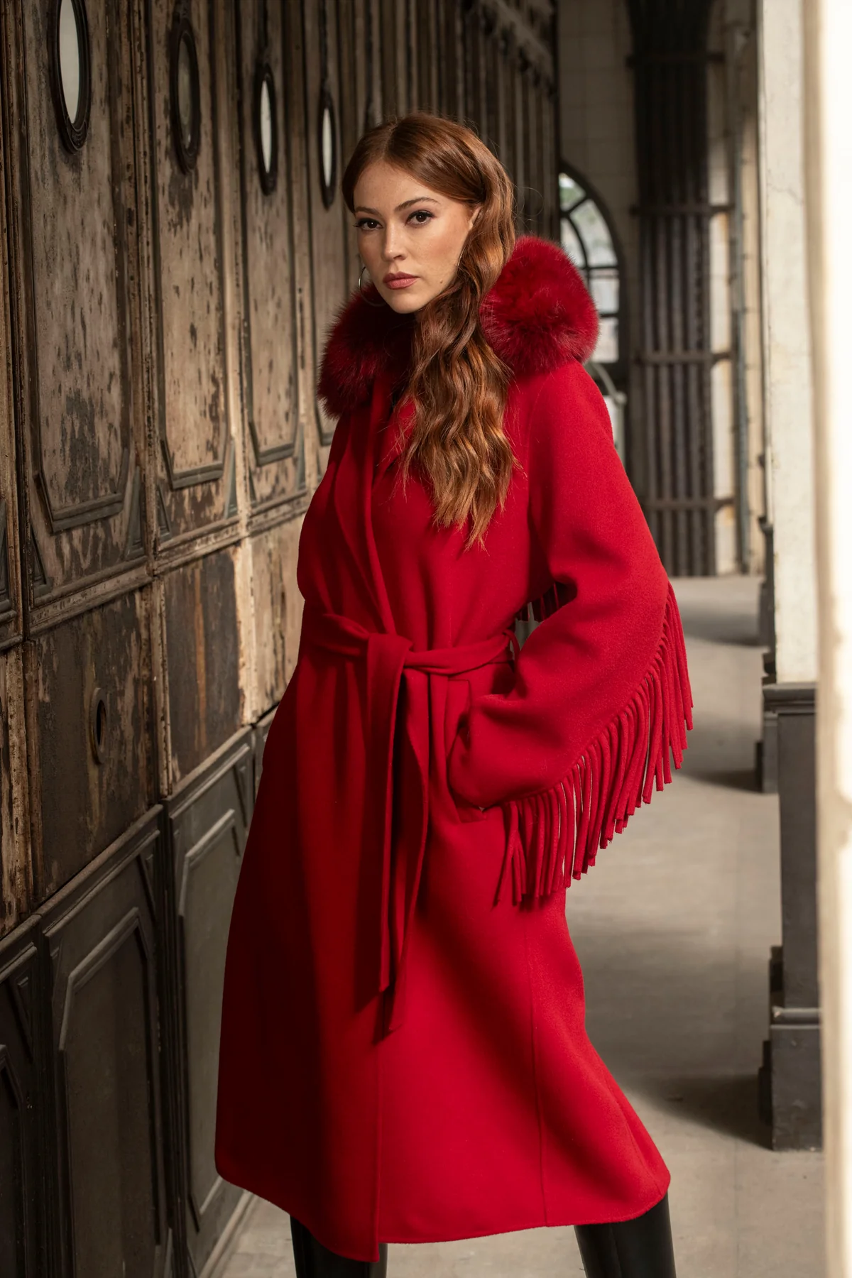 Abrigo rojo de 100% lana virgen con cuello de piel de zorro rojo. Sin forro, ligero y elegante, con cinturón ajustable para un ajuste perfecto. Los flecos en las mangas y la espalda le dan un toque moderno.