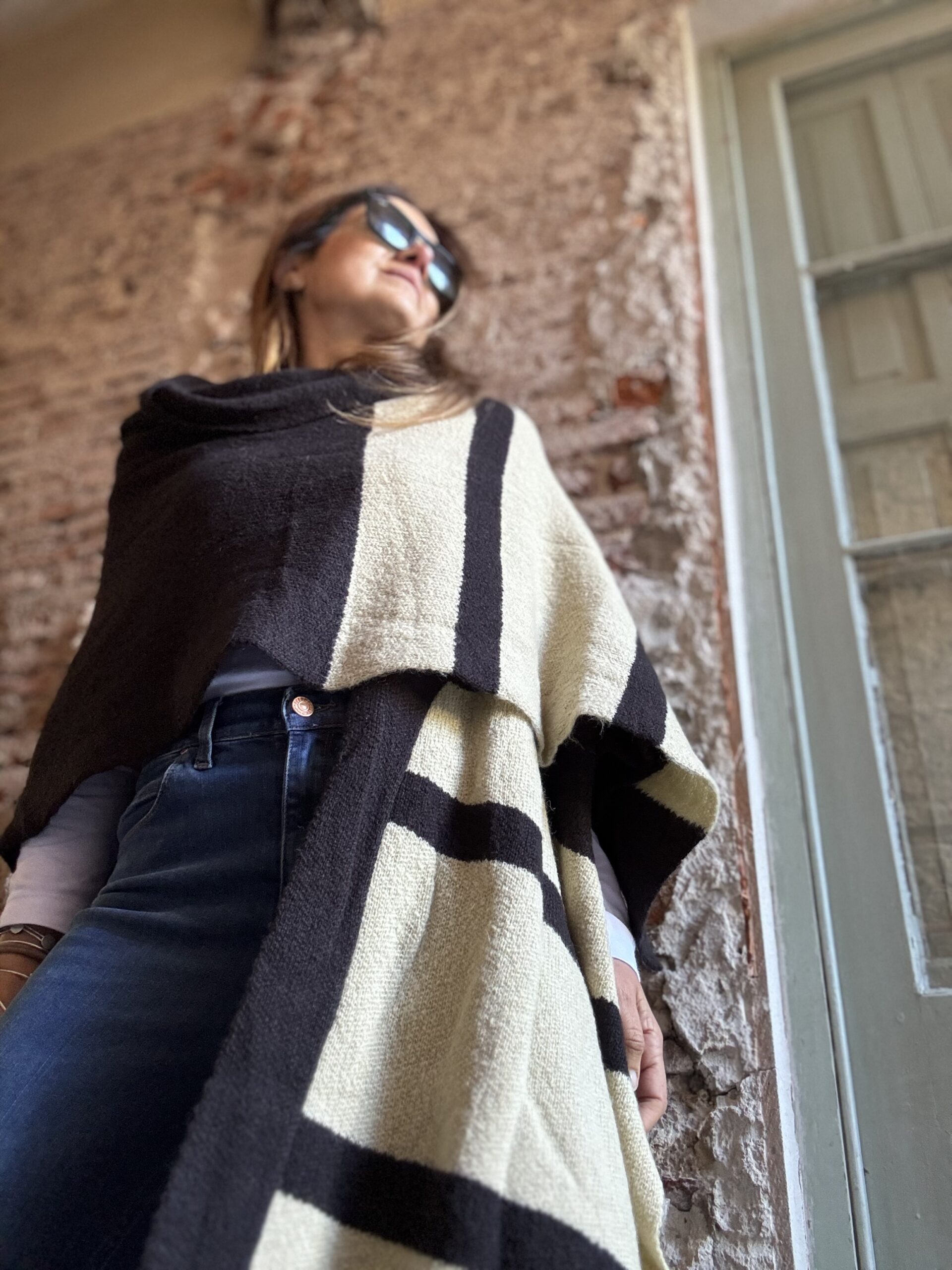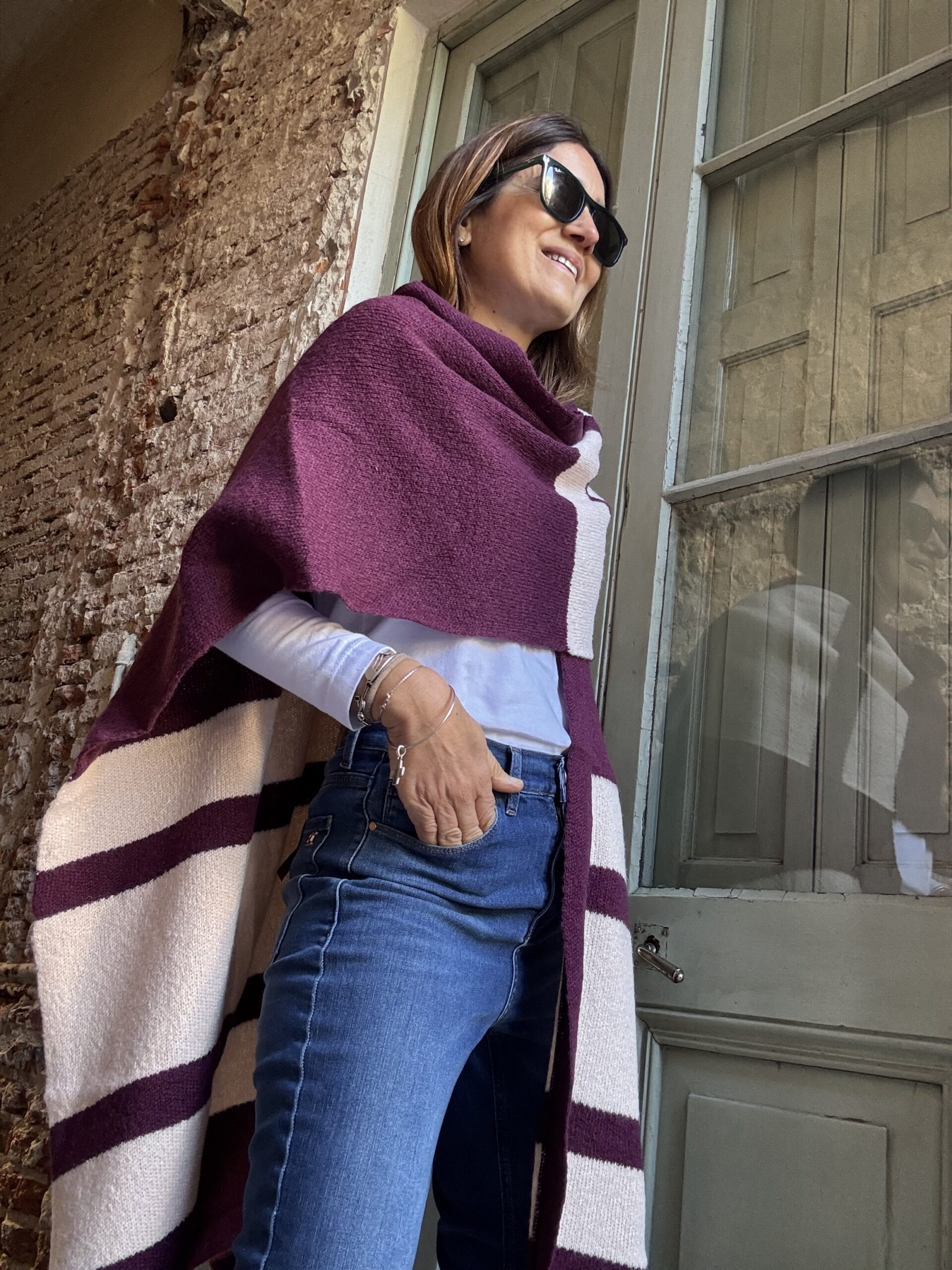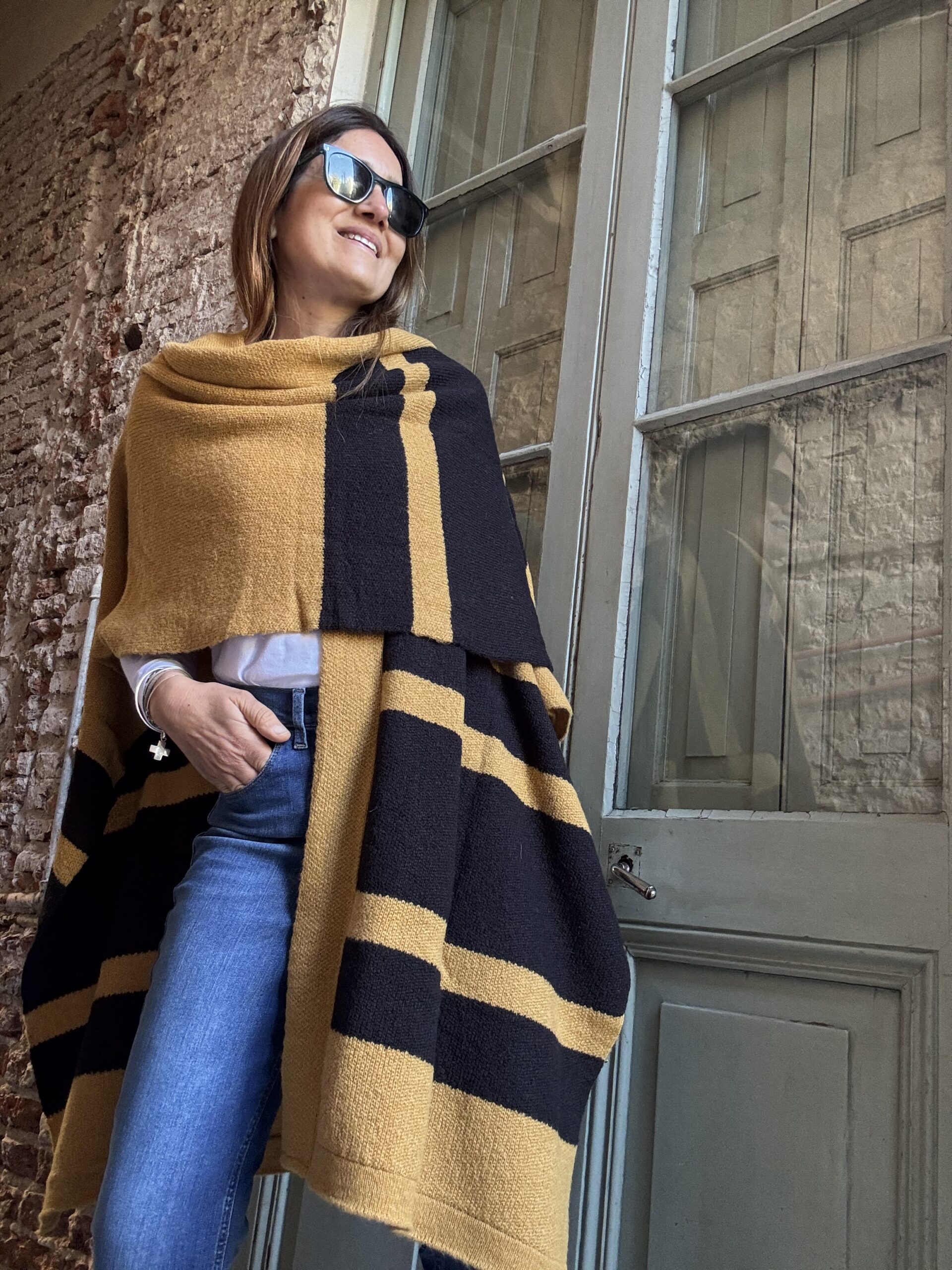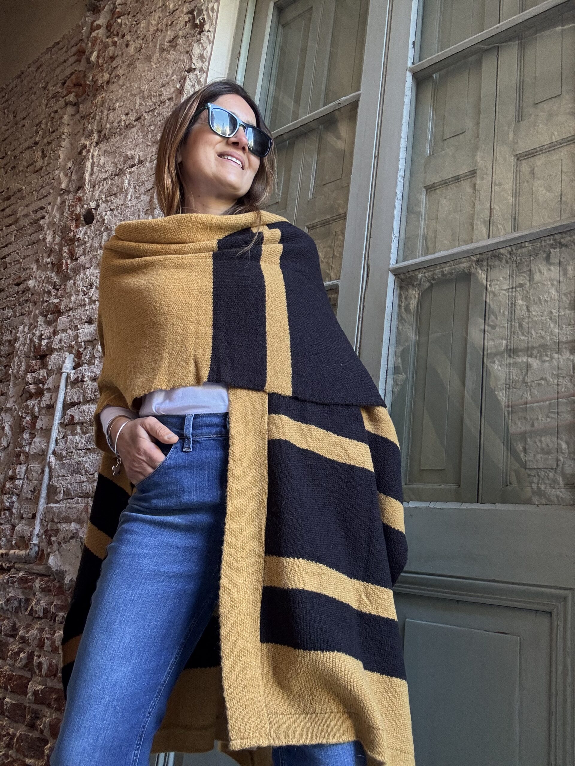 Ruana tejida con lana mohair doble. Abrigo indispensable para invierno. Esta tejido en jacquard con màquina industrial. El diseño es a rayas anchas con varias combinaciones.