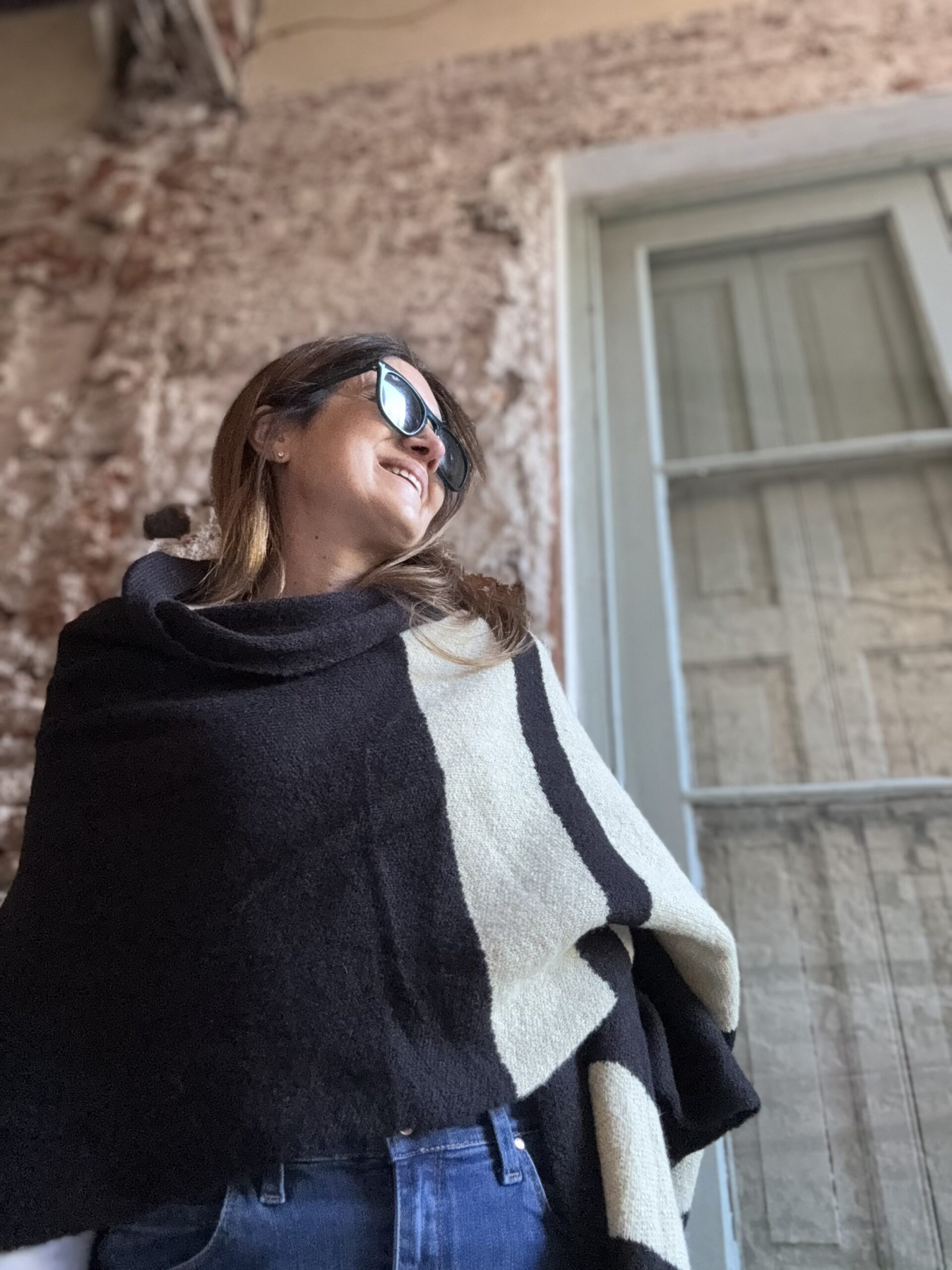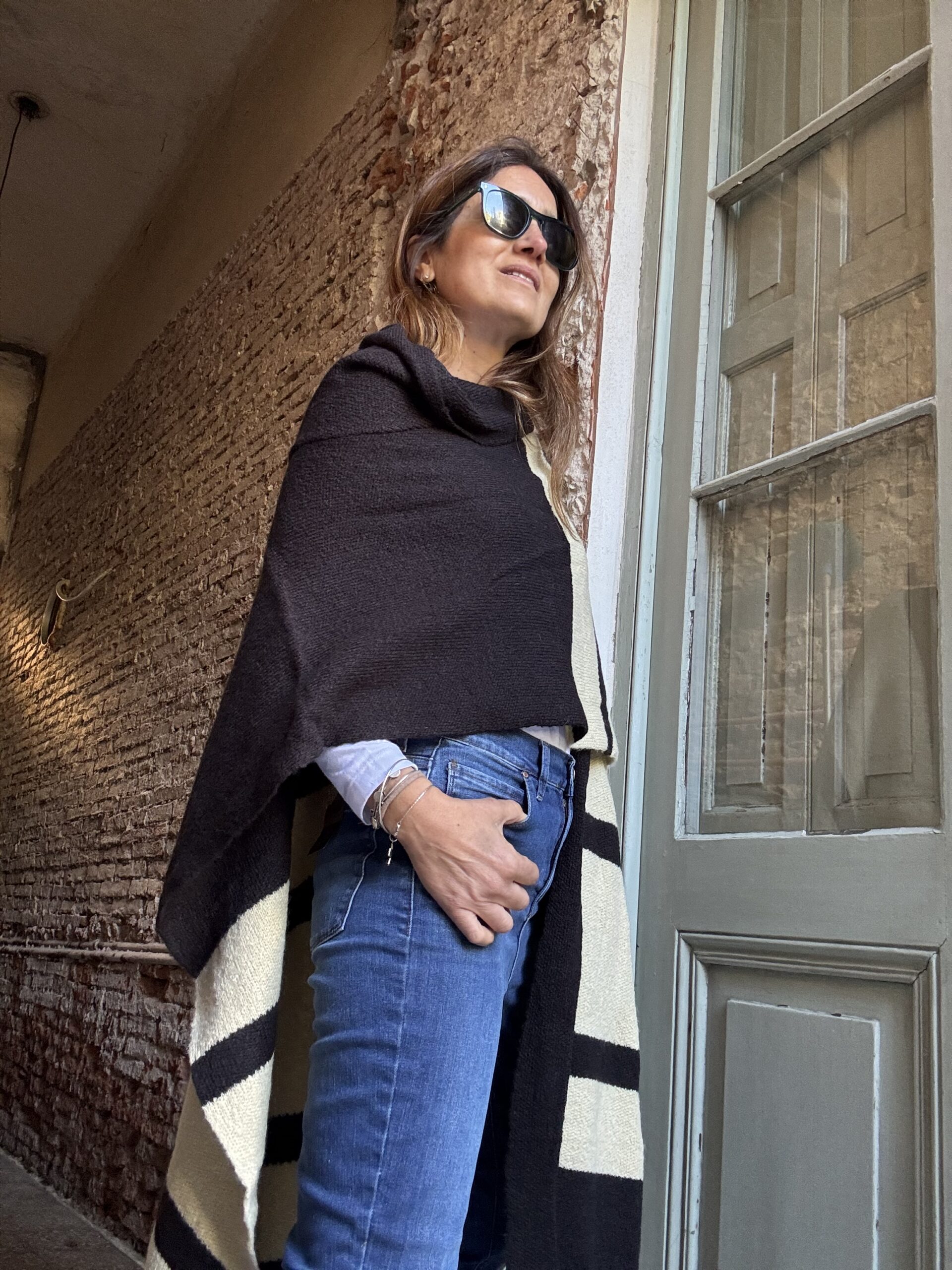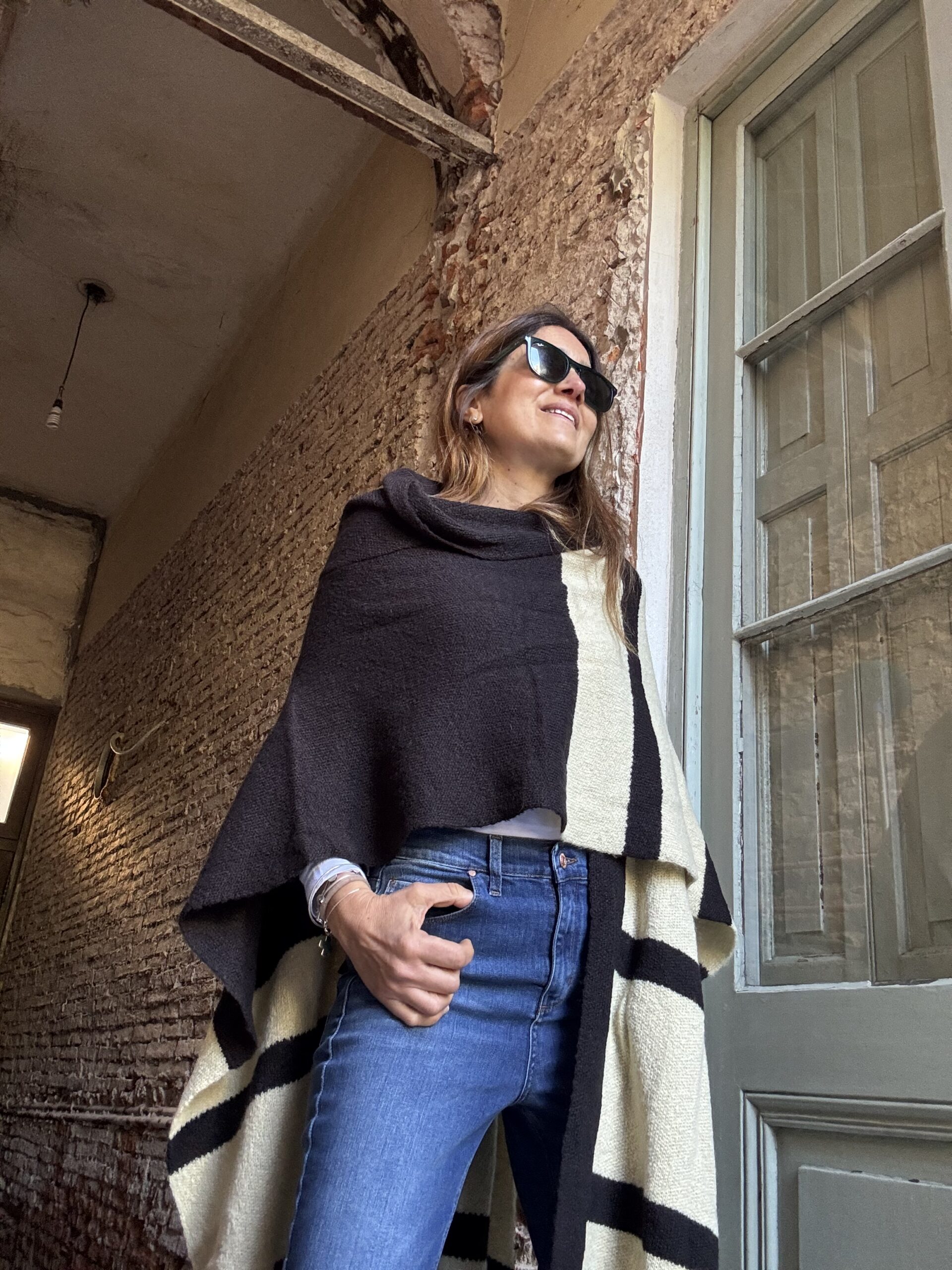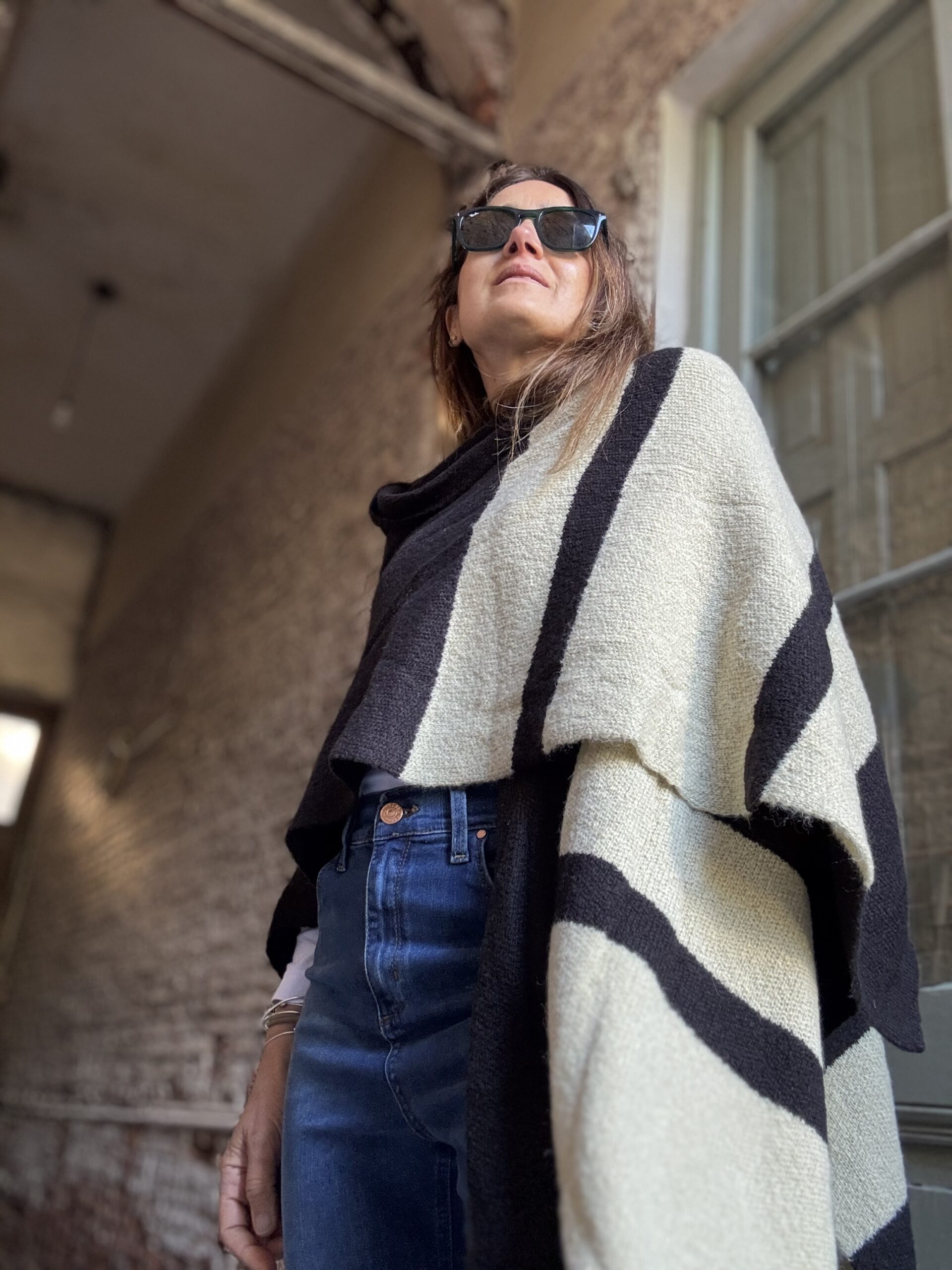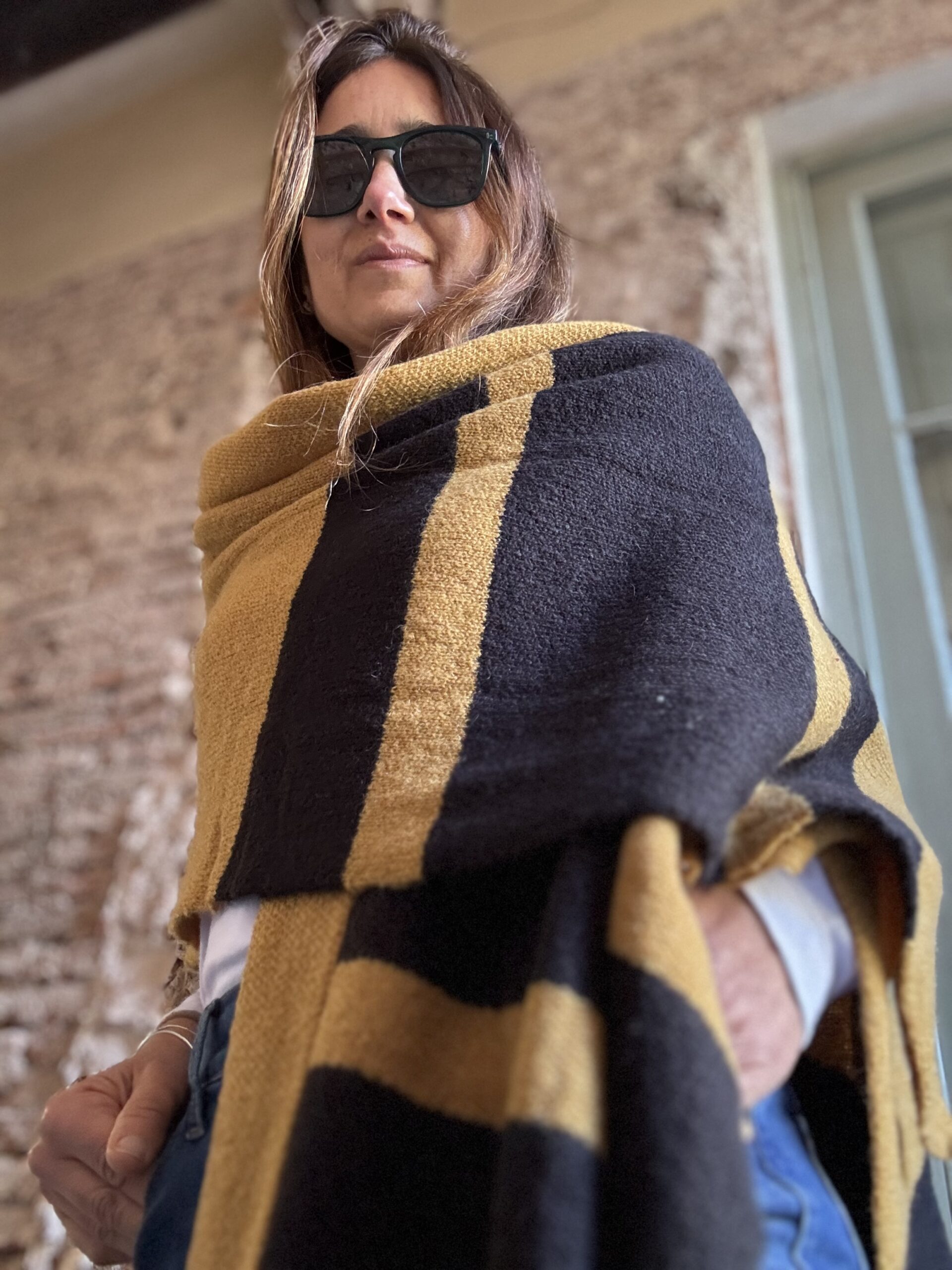 Ruana tejida con lana mohair doble. Abrigo indispensable para invierno. Esta tejido en jacquard con màquina industrial. El diseño es a rayas anchas con varias combinaciones.