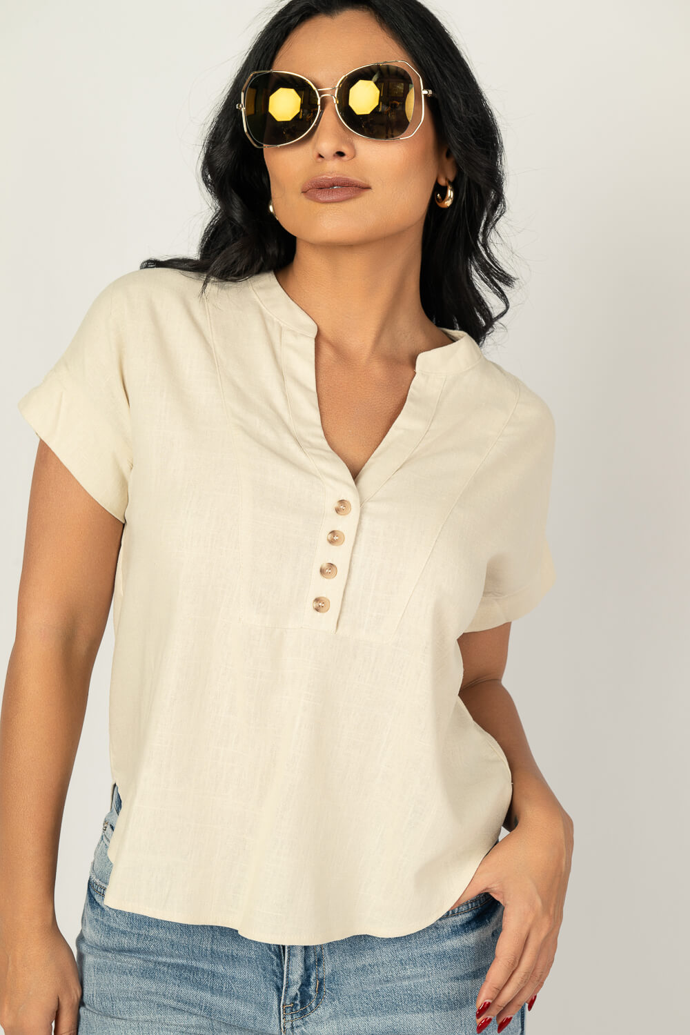 Blusa con cuello chino con detalle en mangas y espalda