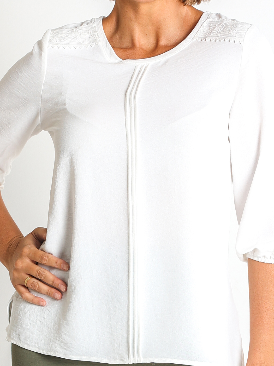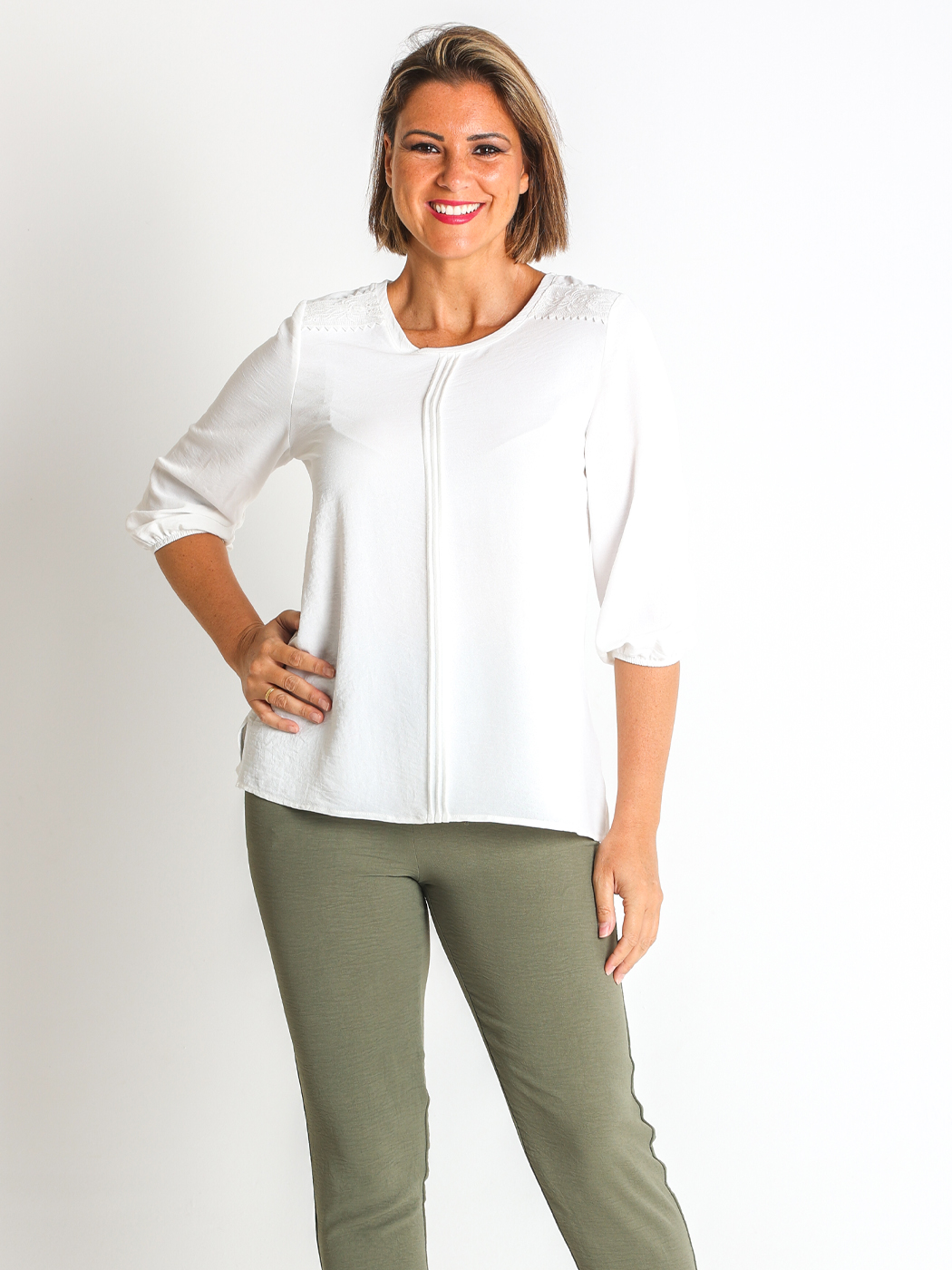 Blusa con corte recto y aperturas laterales fabricada en tejido vaporoso y suave. Mangas 3/4.