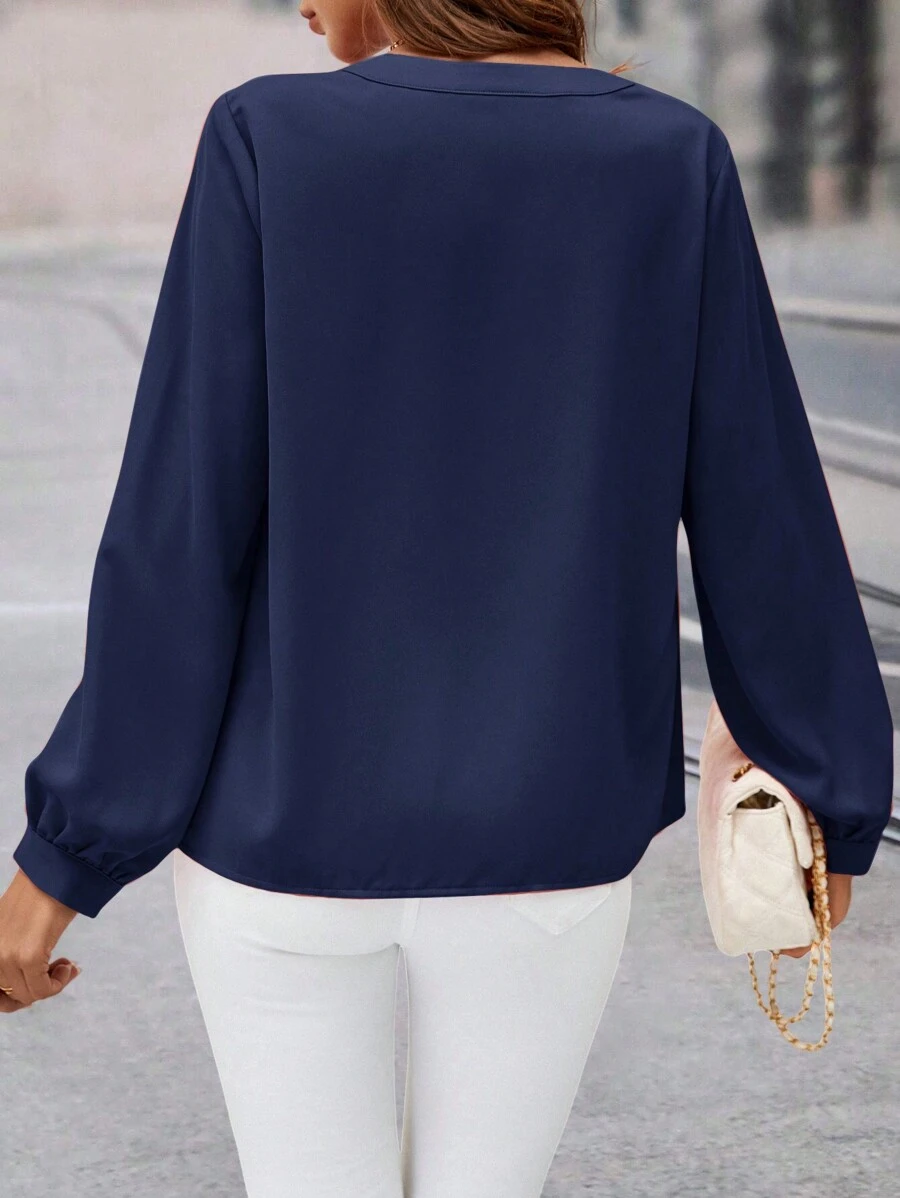 Composición: 100% Soft Poliéster (símil algodón). Una blusa elegante y versátil con un escote en V favorecedor y delicados volantes que añaden un toque femenino. Sus mangas obispo y el detalle de botones delanteros aportan un aire sofisticado, mientras que su ajuste regular la hace cómoda y fácil de combinar. Perfecta para looks casuales con un estilo refinado.