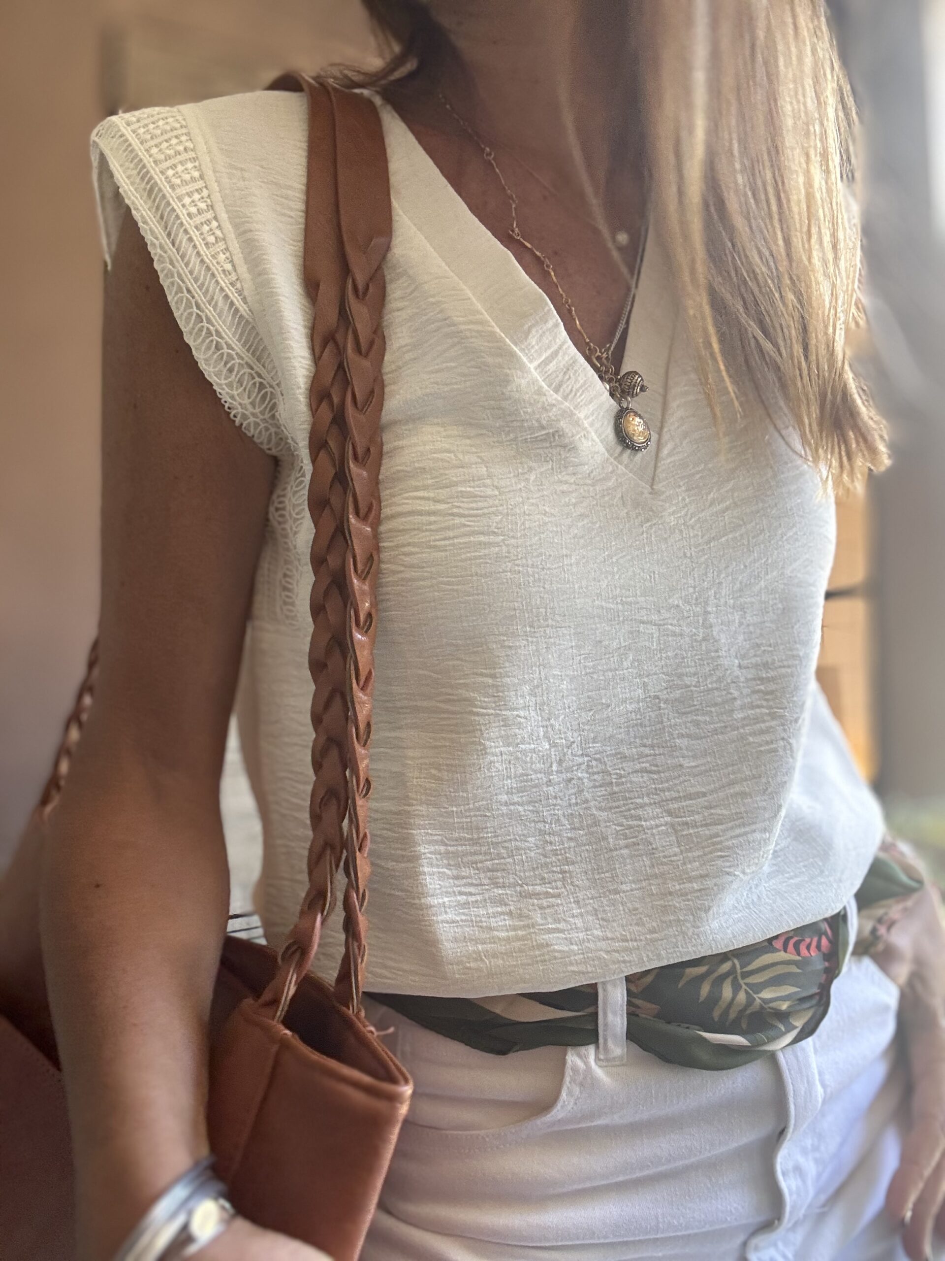 Blusa escote en v con encaje en los hombros, el que le da un toque delicado y femenino. La tela tiene spandex y no se arruga. No requiere plancha!