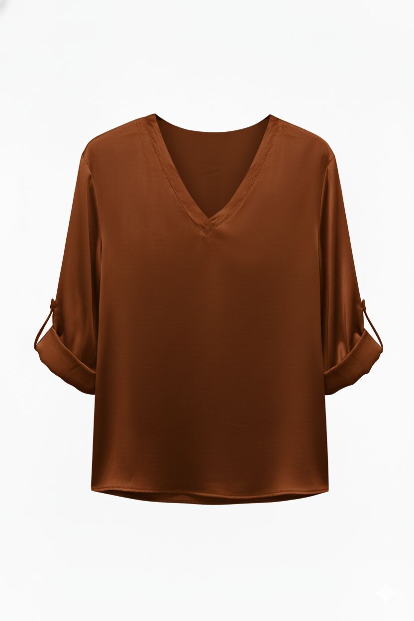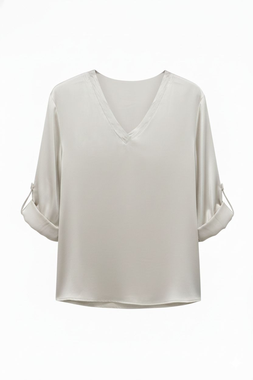 Camisa elegante y versátil, con un diseño de cuello en V que estiliza la figura y mangas 3/4 que se pueden enrollar para un look más casual. Su tejido suave y ligero la hace ideal para cualquier ocasión, adaptándose a diferentes estilos con facilidad.