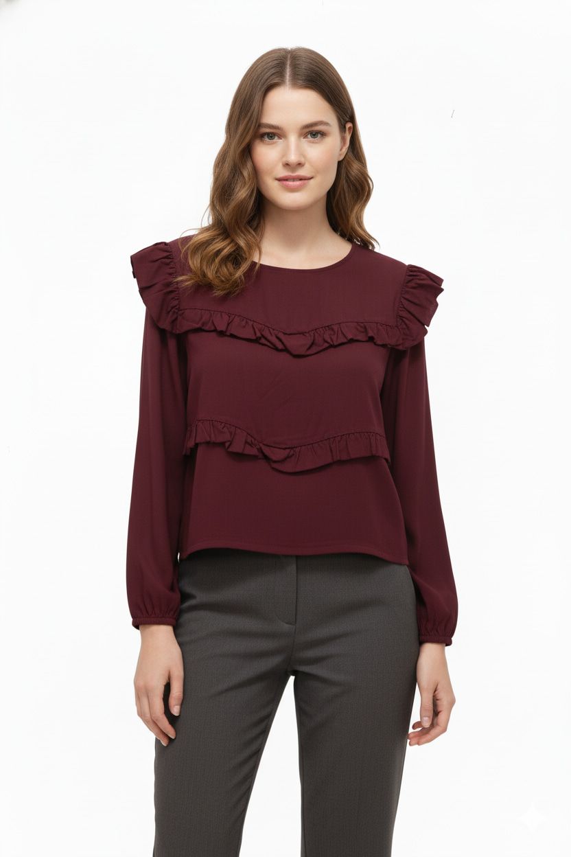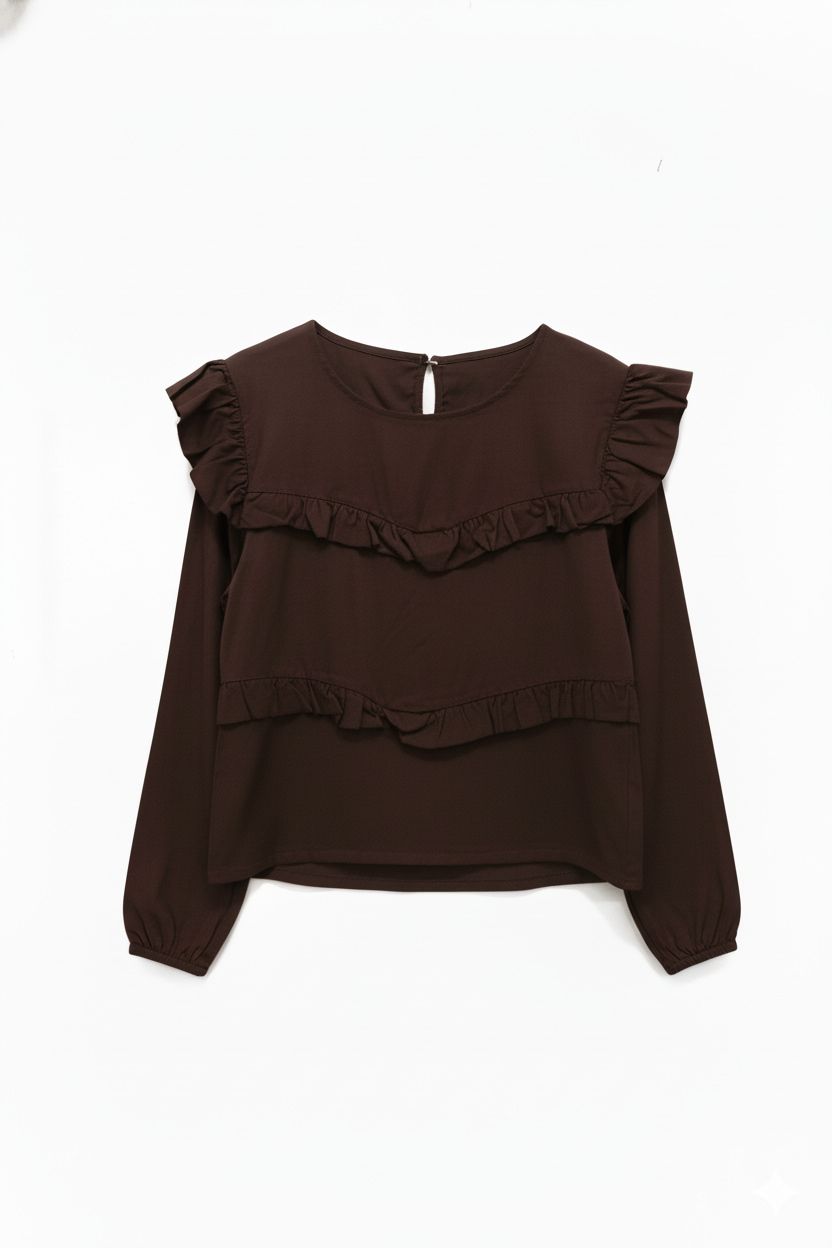 Una prenda versátil de manga larga con un diseño de volantes escalonados que añade un toque de sofisticación. Su corte holgado proporciona comodidad y un estilo fluido, ideal para diversas ocasiones, desde un atuendo casual chic hasta una combinación más formal.