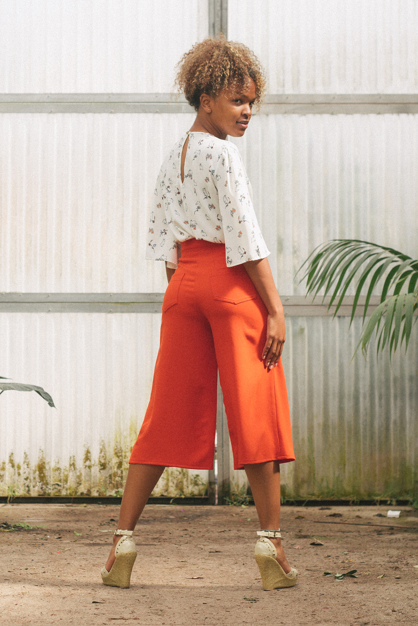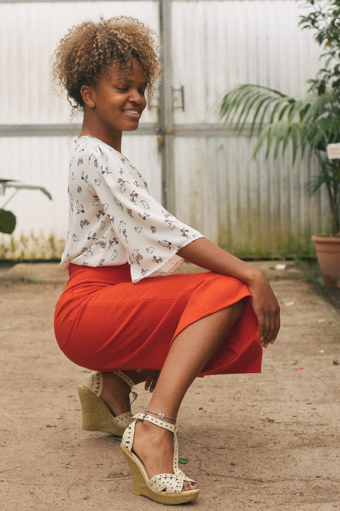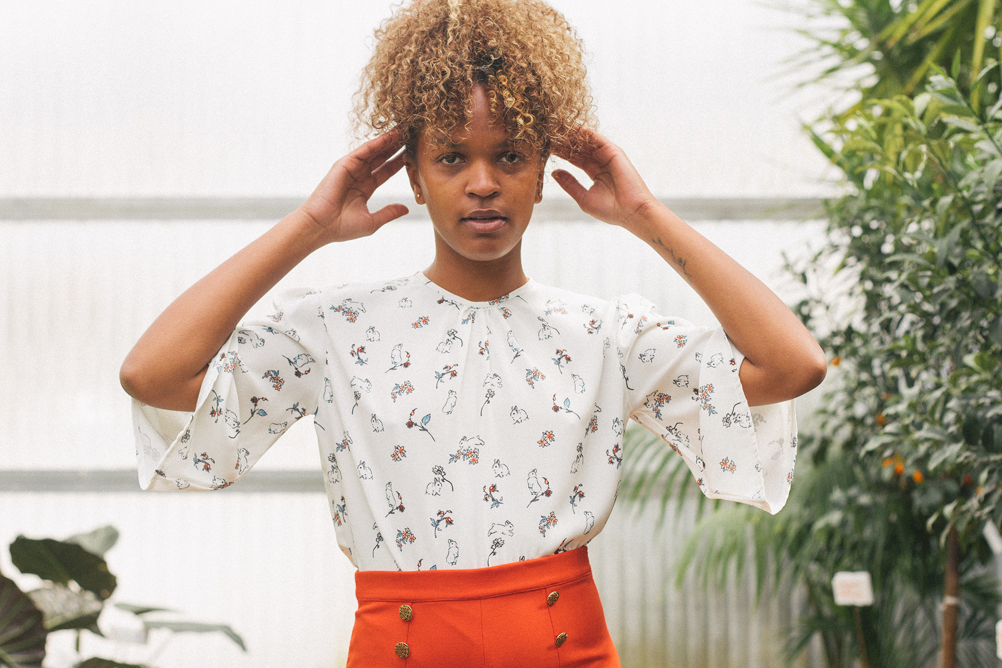 Blusa con manga mariposa y lagrima en la espalda con cierre de botón vintage labrado, en fino crespón con estampado de conejos y flores. 100% poliéster.