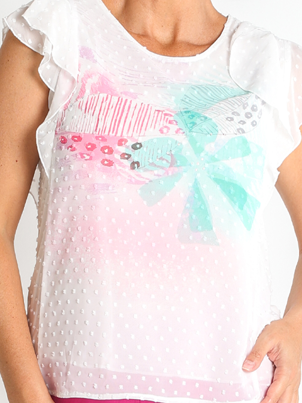 Blusa estampada de corte recto, costadillos y manga volantes fabricada en tejido vaporoso y suave.