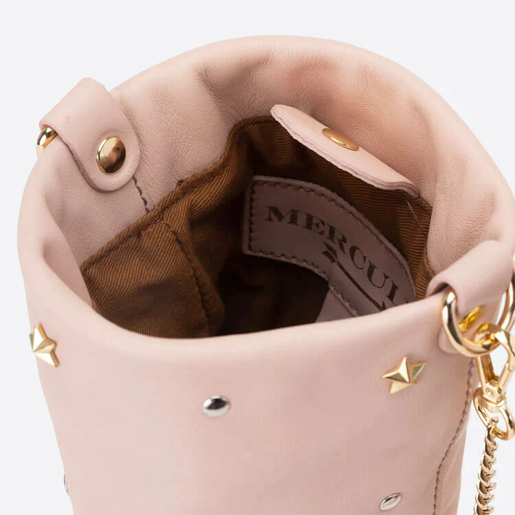 Es un bolso ligero y pequeño con asa de cadena larga y con la capacidad suficiente para llevar contigo lo indispensable. Gracias a sus tachuelas y estrellas en el frente darás un toque rockero a tu look.