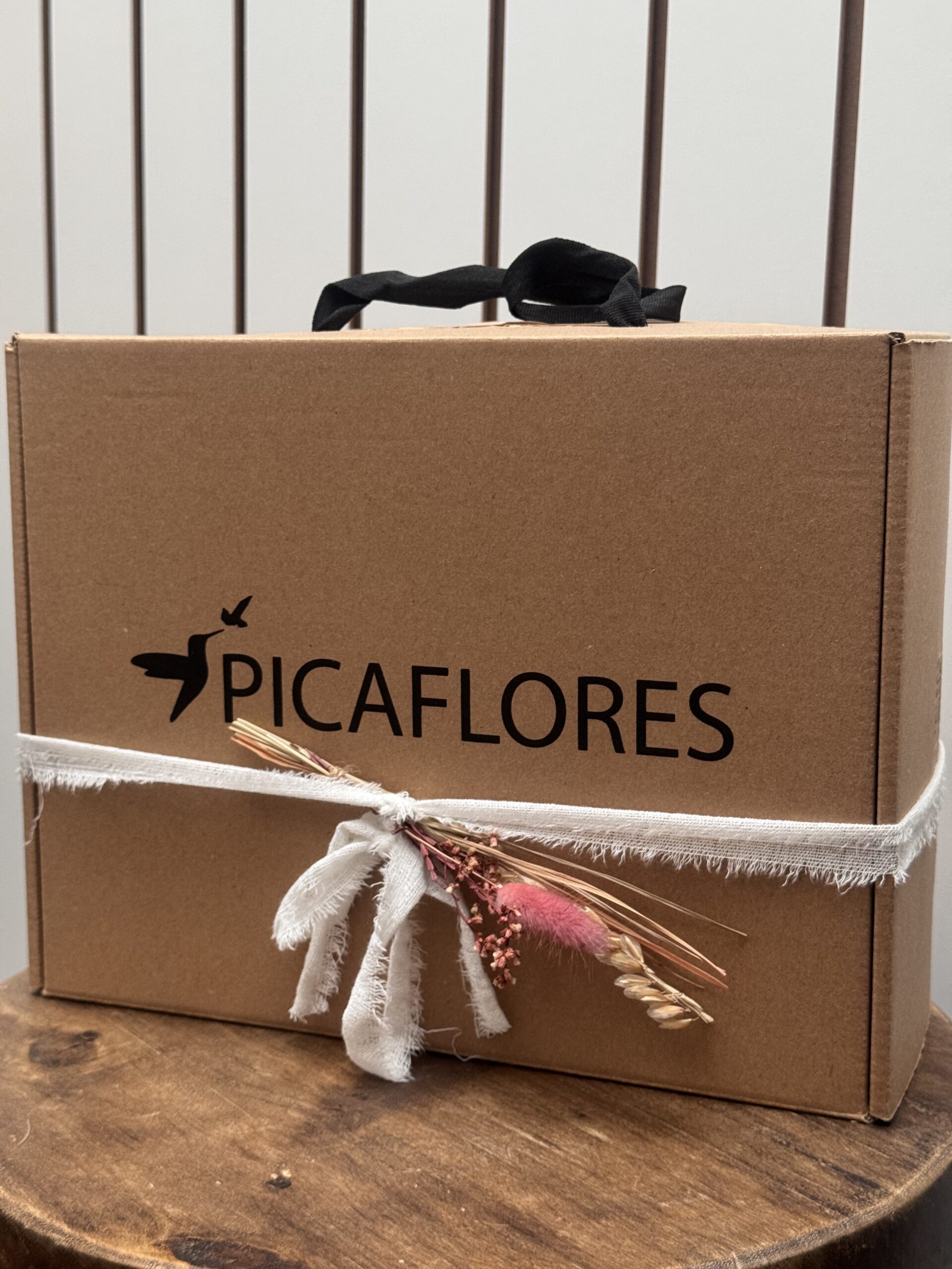 Caja de cartón 100% reciclable con logo Picaflores y manija negra.  Modelo cartera.