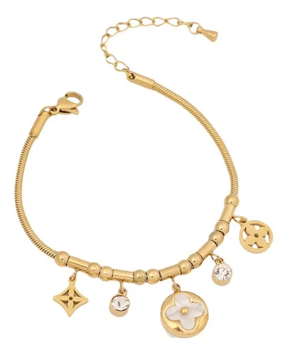 Pulsera de acero en color dorado con flores colgantes y circones transparentes colgantes.