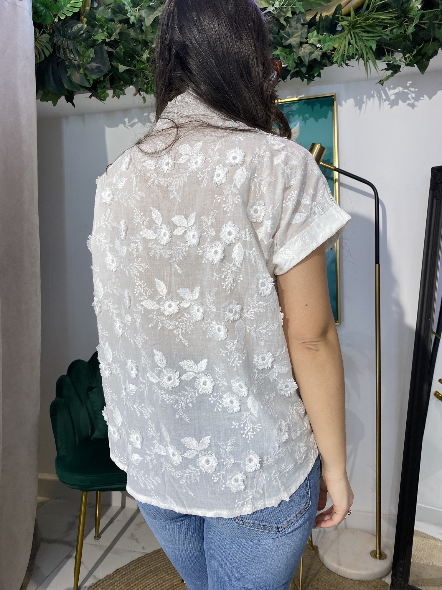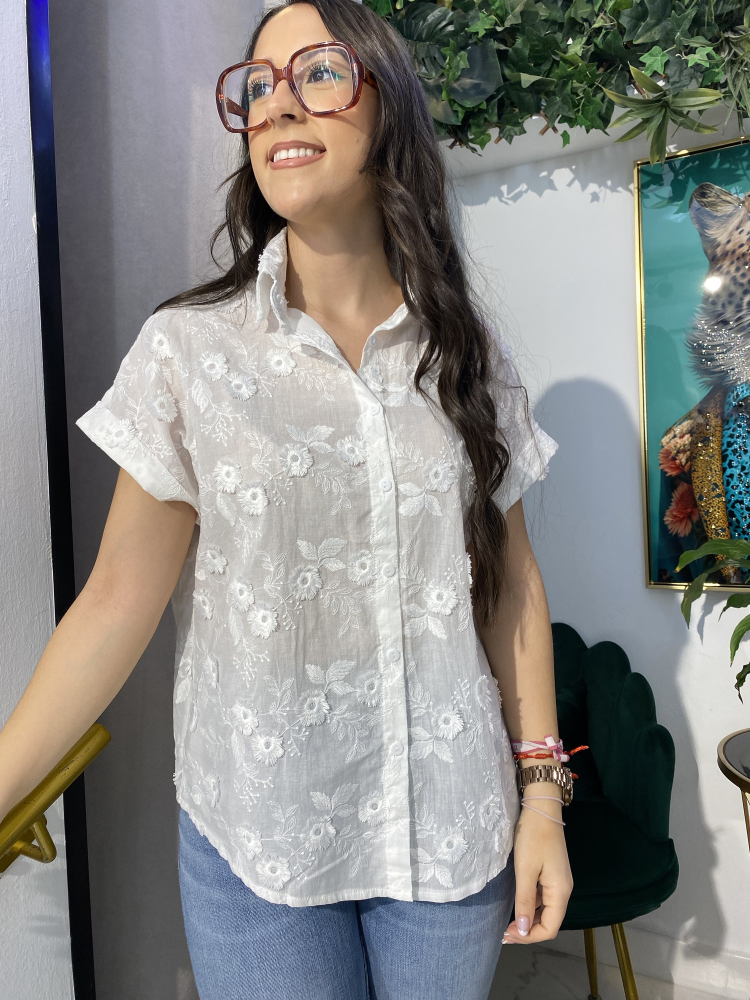 Esta camisa bordada de flores de media manga es la pieza clave para un look versátil. Perfecta para ocasiones casuales o eventos especiales, su bordado floral añade un toque de color y textura. Combínala con pantalones de lino para un estilo relajado o con una falda midi para un look más elegante.