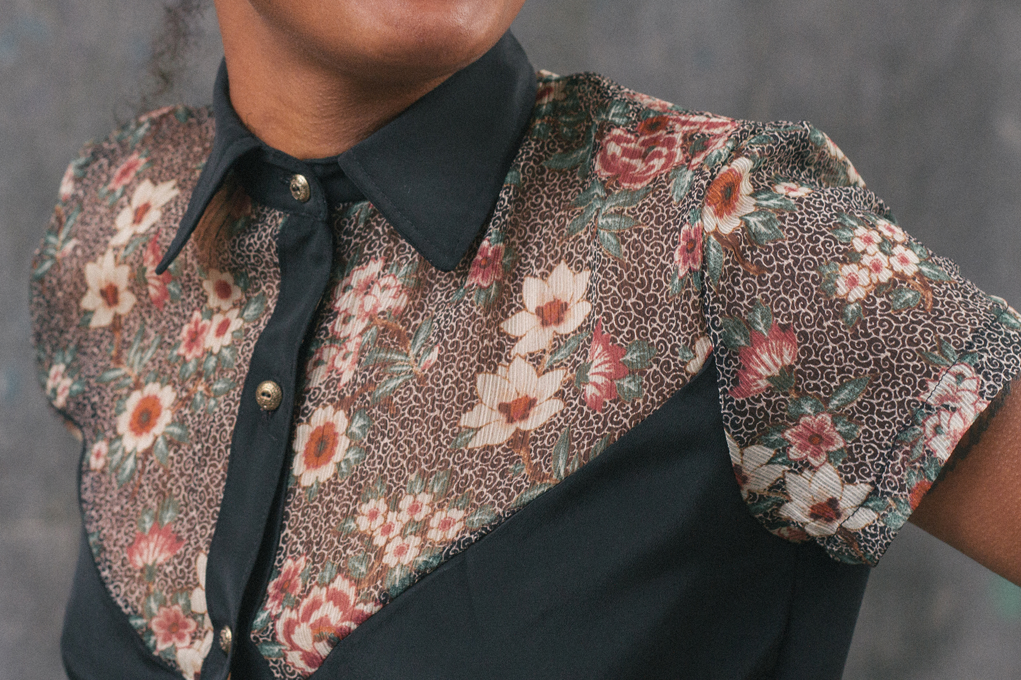 Camisa con canesú de gasa bambula con estampado de flores y botones vintage labrados. El tejido liso es crespón, ligero y fresco. 100% poliéster.