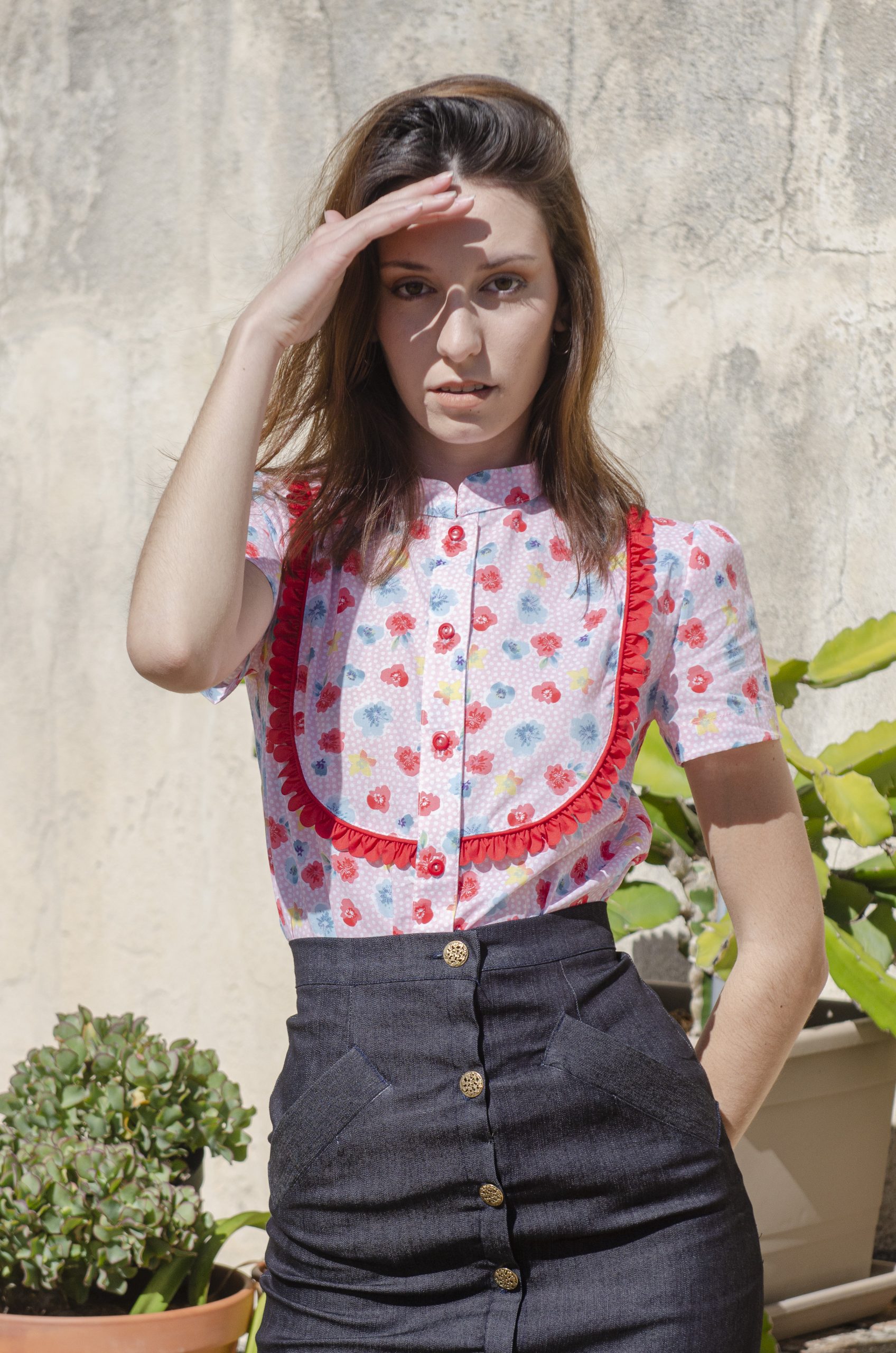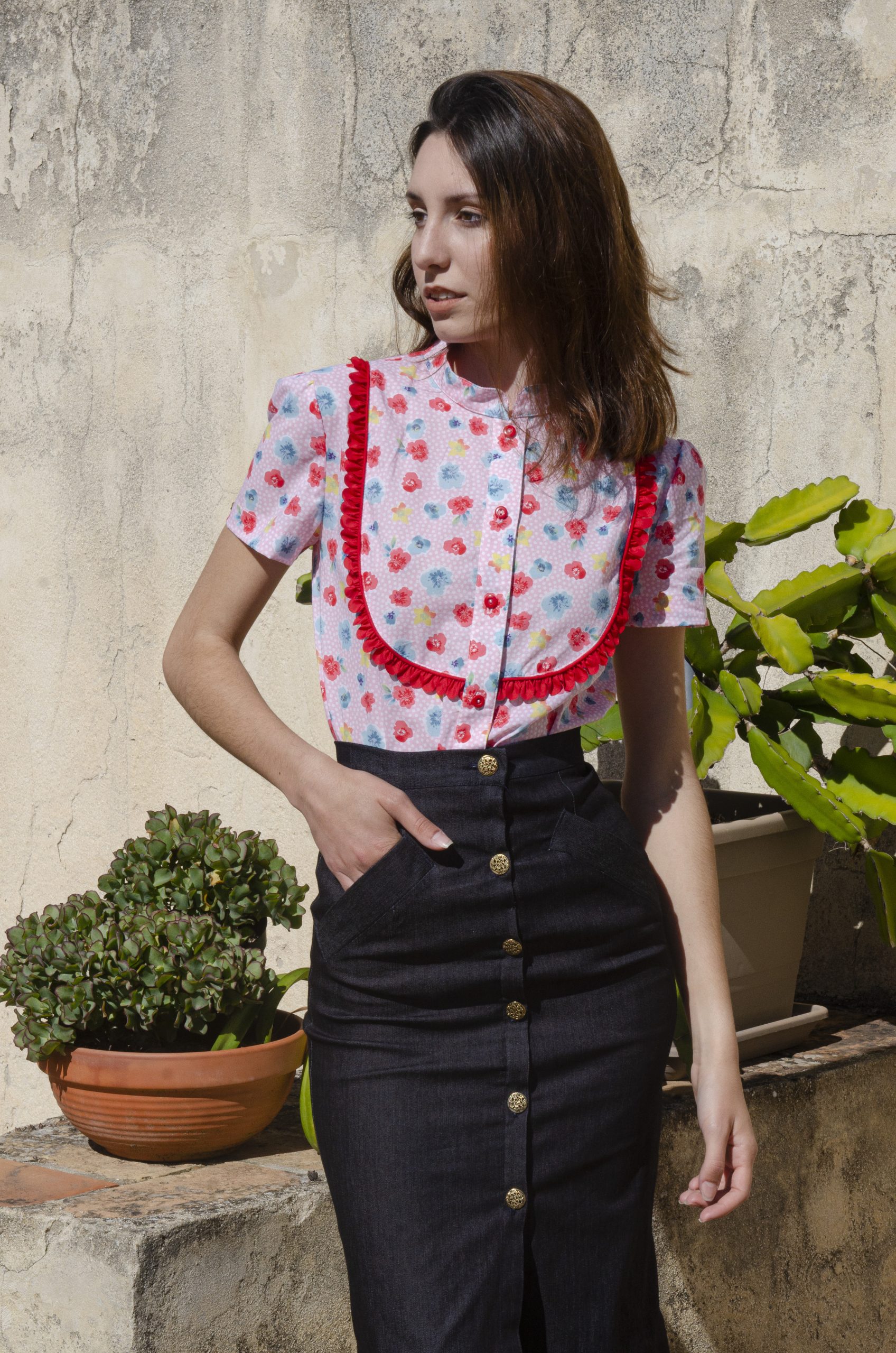 Camisa de manga corta con cuello mao en popelín de algodón 100% con estampado de flores sobre fondo rosa. Detalle de vivo de pétalos en el canesú y botones a juego.