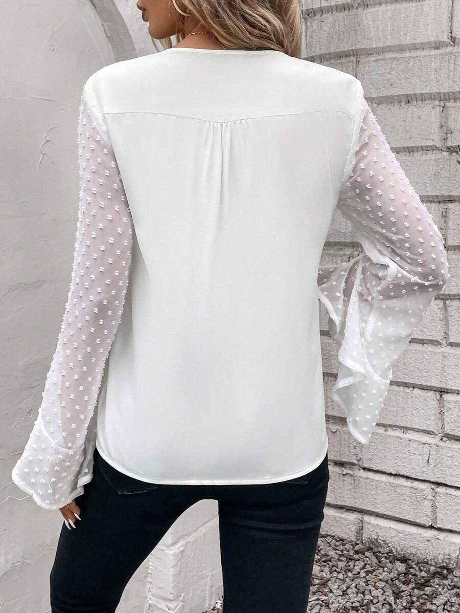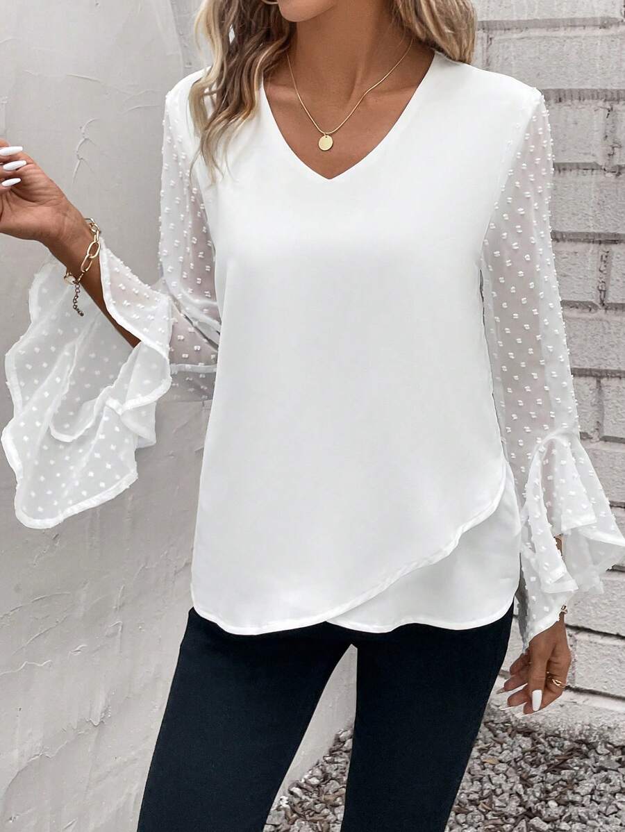 Composición: 100% softpoliéster (simil algodón). Este top casual de color blanco está diseñado para el uso diario, confeccionado en tela tejida y con un estampado liso que realza su versatilidad. Presenta mangas de campana hasta la muñeca y un escote en ‘v’ o pico, aportando un toque moderno y femenino. Su corte asimétrico y los detalles de volante y bordado de ojal le dan personalidad y estilo propio, mientras que el ajuste regular garantiza comodidad en todo momento. No es elástico, ni transparente, y es fácil de cuidar: puede lavarse a máquina, aunque no se recomienda la limpieza en seco. Ideal para quienes buscan una prenda práctica, con detalles únicos y fácil de combinar.