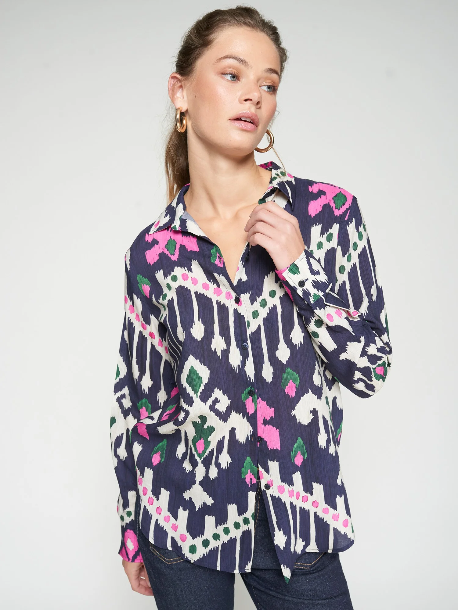Camisa de corte recto confeccionada en mezcla de viscosa y algodón. Estampado tipo ikat en azul marino, rosa, verde y crudo. Cuello clásico, cierre frontal con botones y puños con abotonadura simple. Tejido con ligera estructura. Bajo ligeramente redondeado.