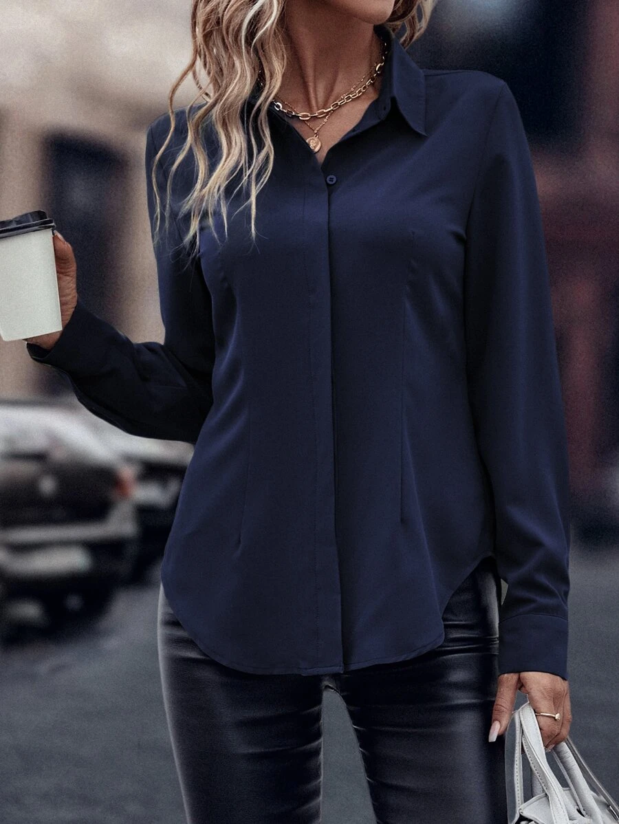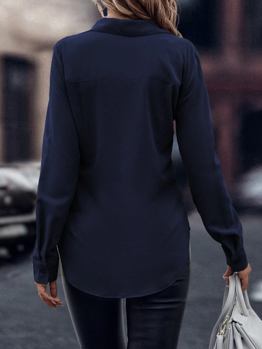 Confeccionada en 100% soft poliéster (símil algodón), esta camisa de tela tejida sin elasticidad ofrece una textura ligera y estructurada. Su diseño destaca en un elegante color azul marino con estampado liso, complementado por detalle de botón que aporta simplicidad y estilo. Cuenta con un cuello camisero, manga larga de tipo normal, corte del bajo asimétrico, un ajuste regular y una longitud normal, logrando una silueta casual y moderna. La prenda no tiene forro, no está forrada para aportar calidez y no es transparente. Puede cuidarse mediante lavado en lavadora o limpieza en seco profesional.