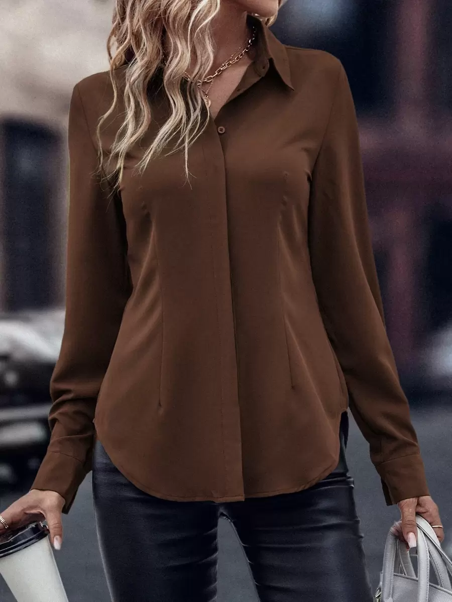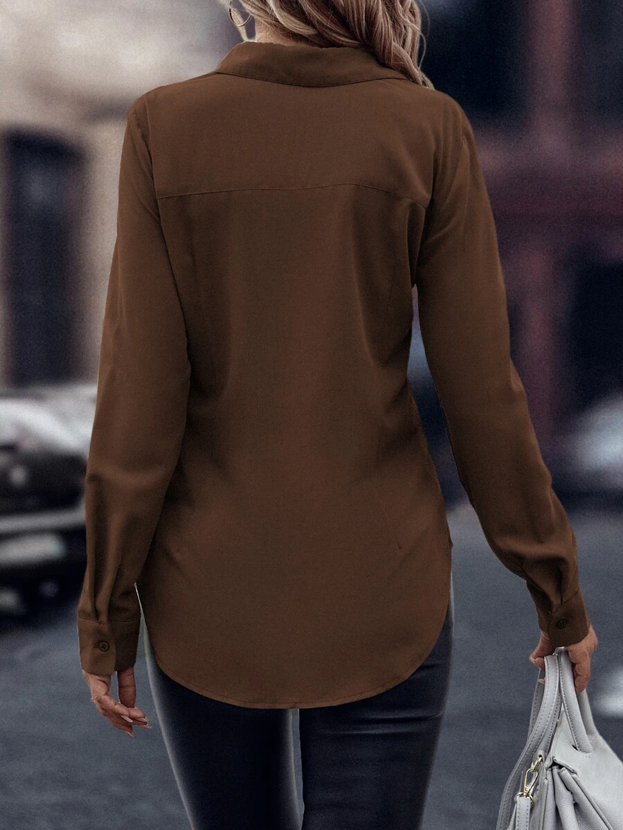 Composición: 100% softpoliéster (simil algodón). Esta camisa casual en tono marrón chocolate es una opción versátil y actual para el día a día. Confeccionada en tela tejida, presenta un diseño liso con corte asimétrico, manga larga y ajuste regular para brindar comodidad y estilo. El cuello camisero y los detalles de botones aportan un toque clásico, mientras que la tela no elástica asegura una caída prolija y sin transparencias. No lleva forro y su mantenimiento es sencillo: puede lavarse en lavadora o mediante limpieza en seco profesional. Perfecta para quienes buscan una prenda práctica y fácil de combinar.