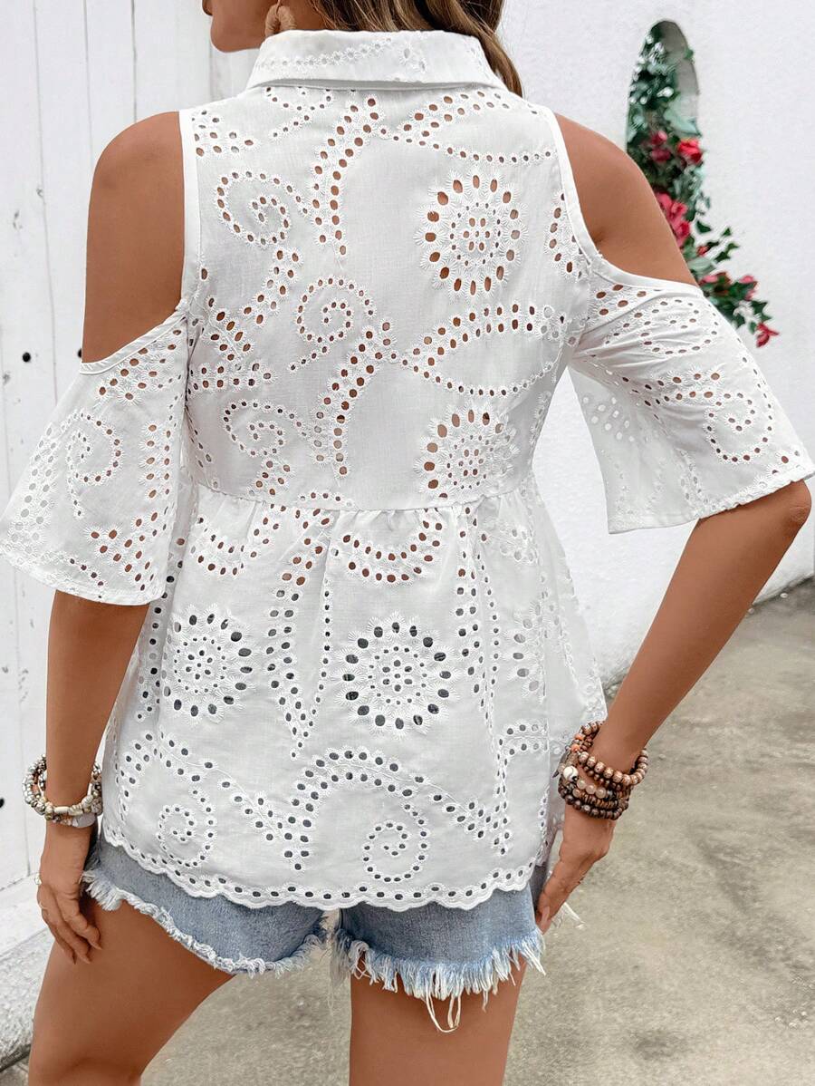 Composición: 100% Soft Poliéster (símil algodón). Esta camisa de longitud normal luce un diseño fresco y moderno con cuello camisero y mangas cortas tipo campana que aportan un aire distintivo. Está confeccionada en tela semitransparente sin forro, no elástica, lo que le da ligereza y fluidez. Sus detalles incluyen bajo acampanado con volantes, botones delanteros, bordado de ojal y delicados acabados en contraste, que realzan la prenda con un toque elegante. El color blanco puro la convierte en una pieza versátil y fácil de combinar. Para su cuidado, se recomienda lavado a mano o limpieza en seco profesional.