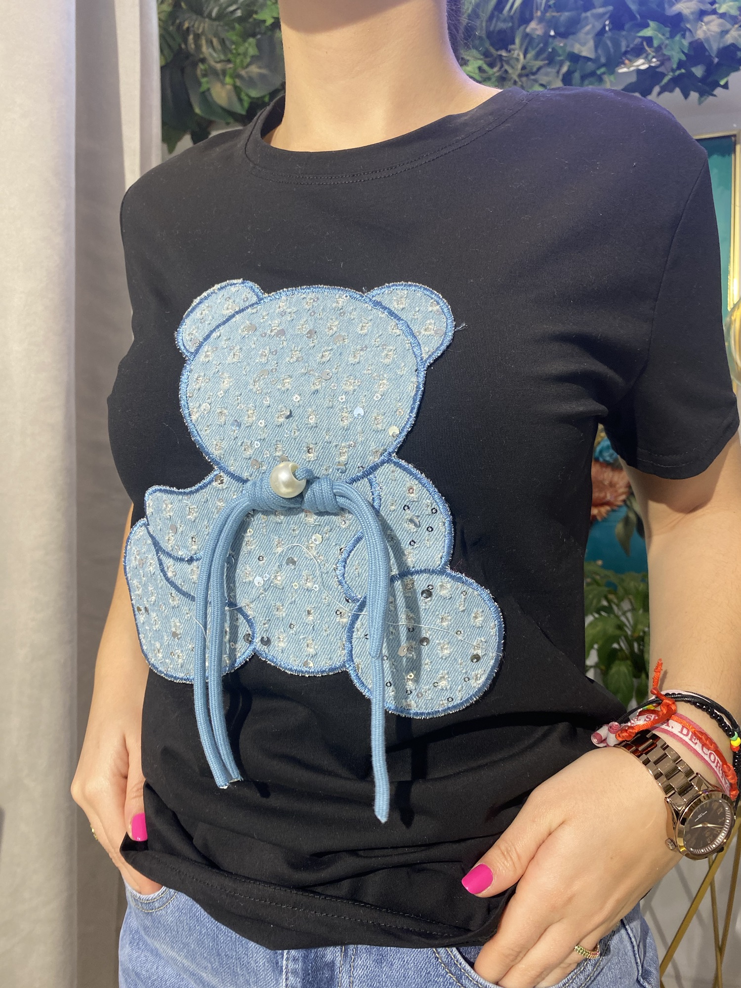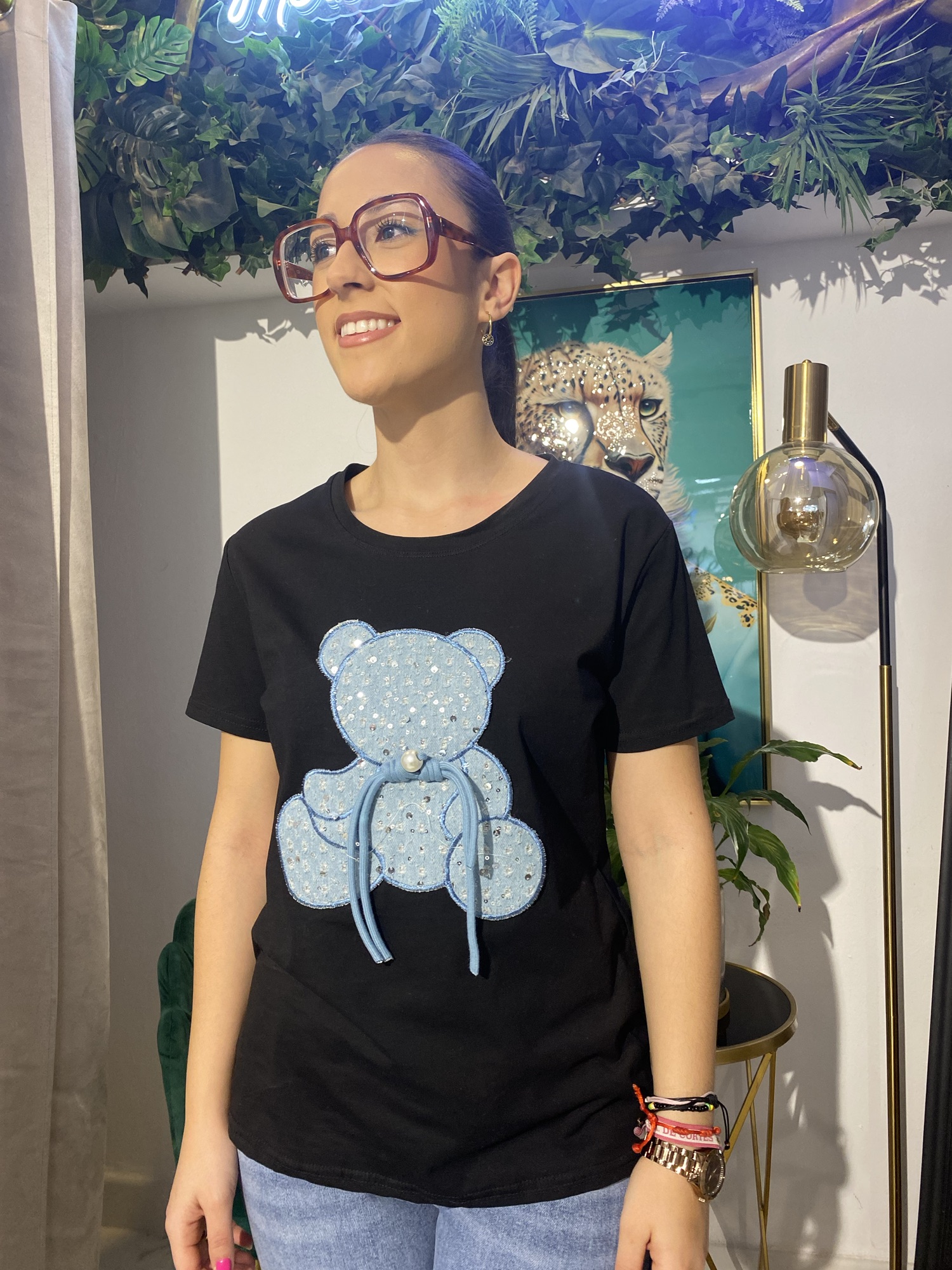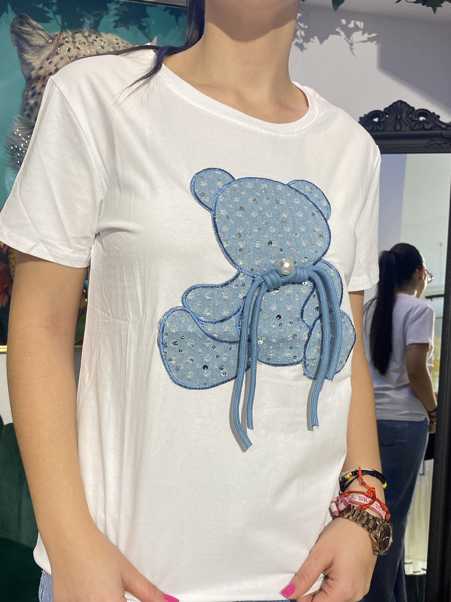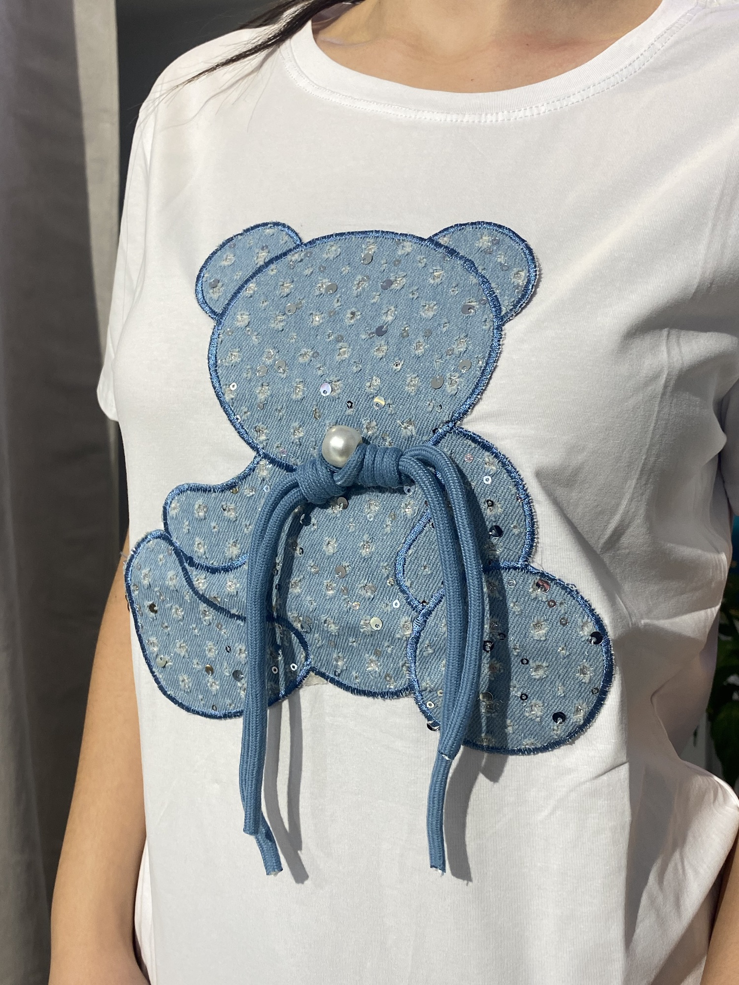 Esta camiseta de algodón con oso y detalles de jeans es una prenda versátil que podrás adaptar a diferentes estilos. Combínala con unos vaqueros y zapatillas deportivas para un look de día casual y cómodo, o con una falda midi y sandalias para un look de tarde original y llamativo. ¡Las posibilidades son infinitas!