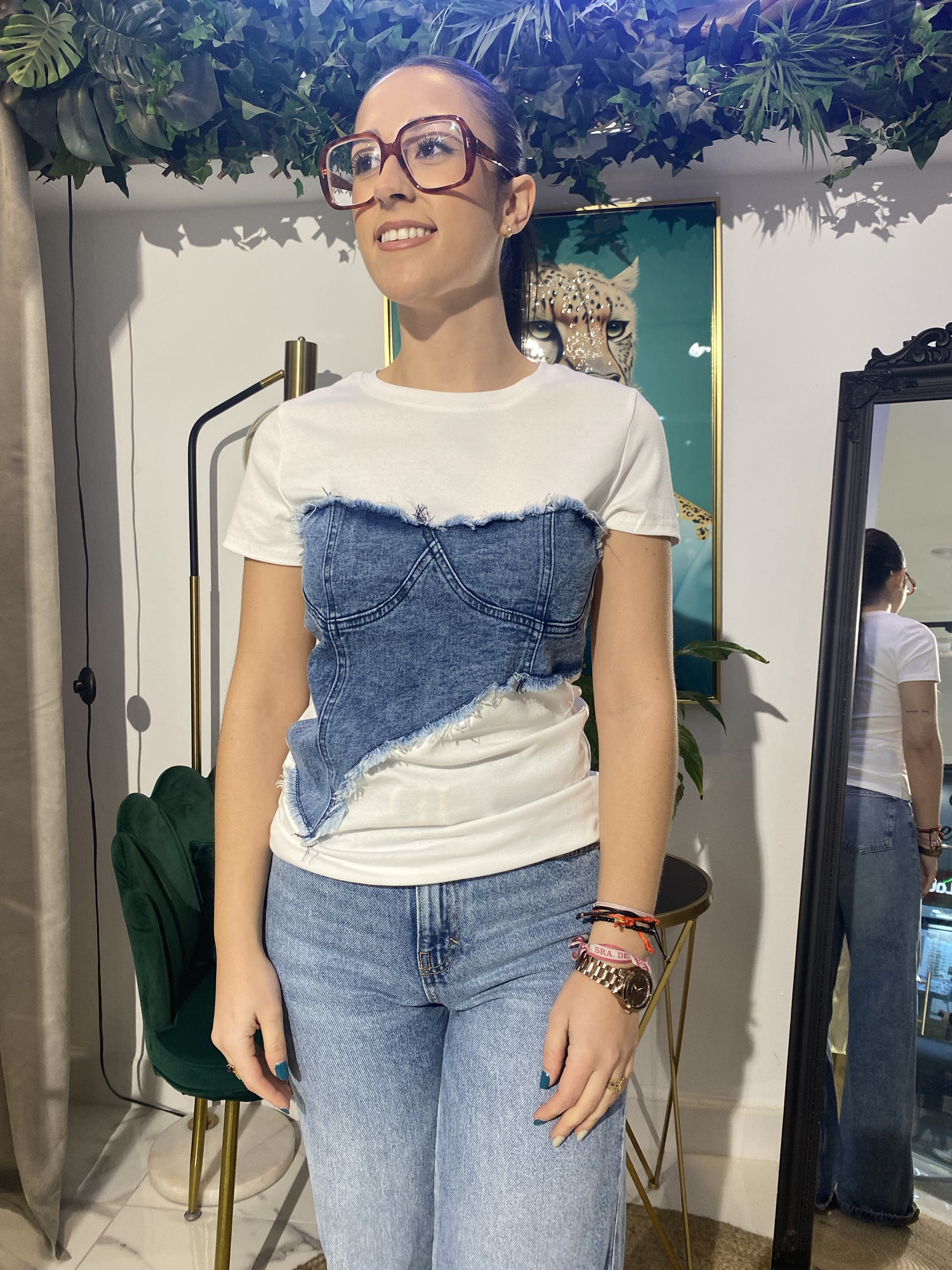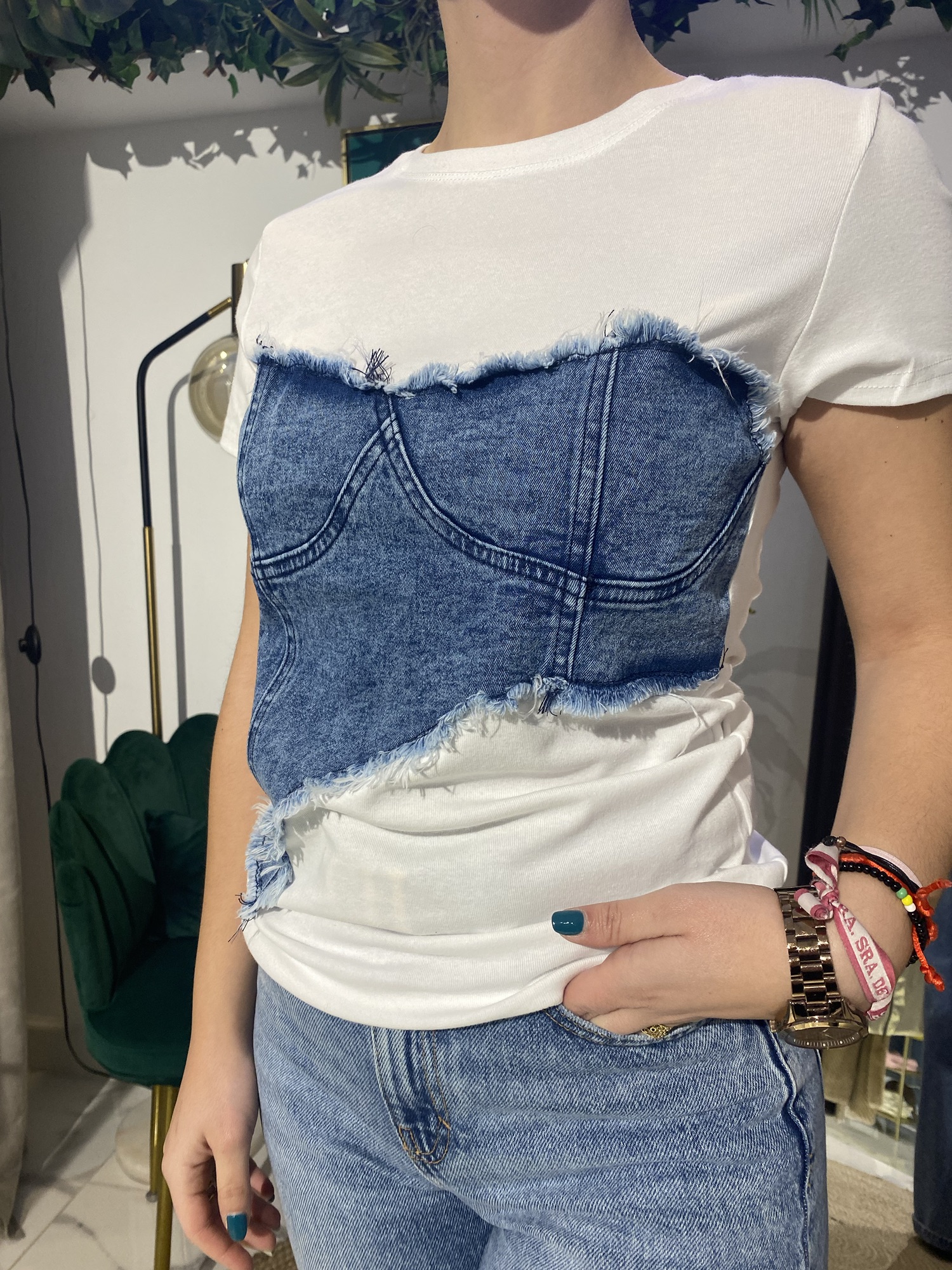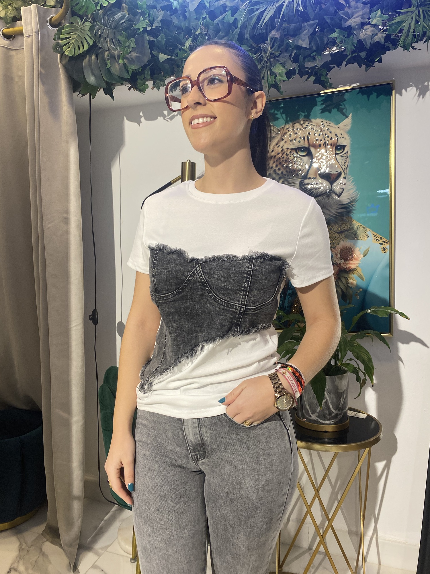 Disfruta de la comodidad y el estilo con esta camiseta blanca combinada con jeans. Su tejido suave y ligero te permitirá moverte con libertad, mientras que el diseño y la combinación de colores te aseguran un look moderno y casual.