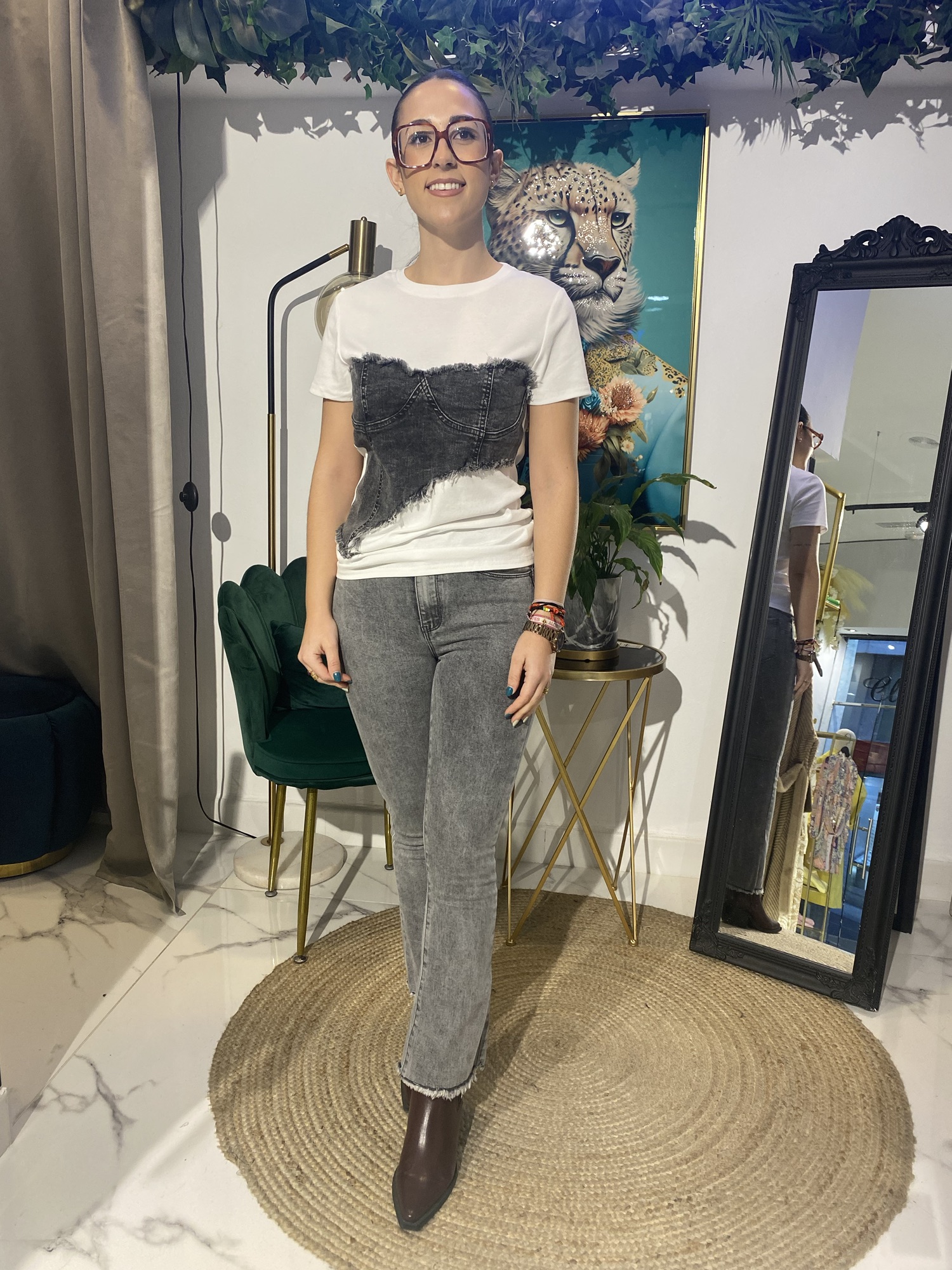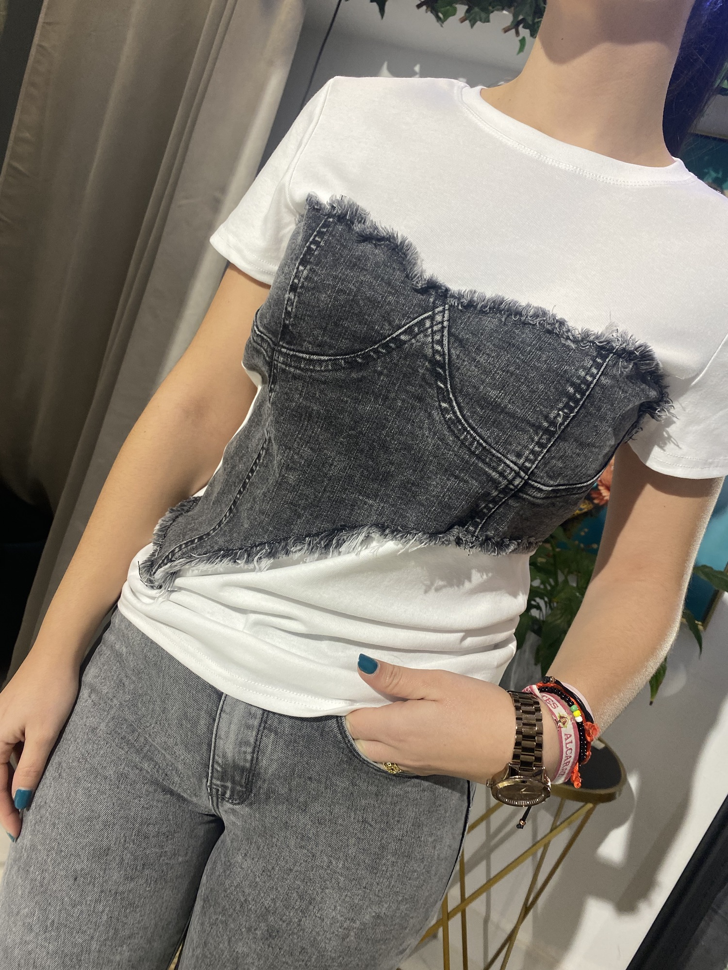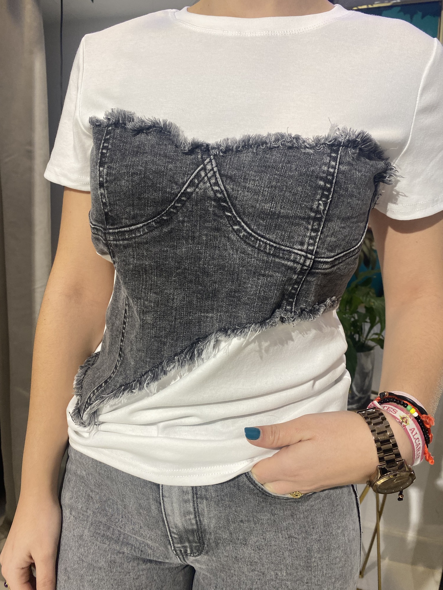 Disfruta de la comodidad y el estilo con esta camiseta blanca combinada con jeans. Su tejido suave y ligero te permitirá moverte con libertad, mientras que el diseño y la combinación de colores te aseguran un look moderno y casual.