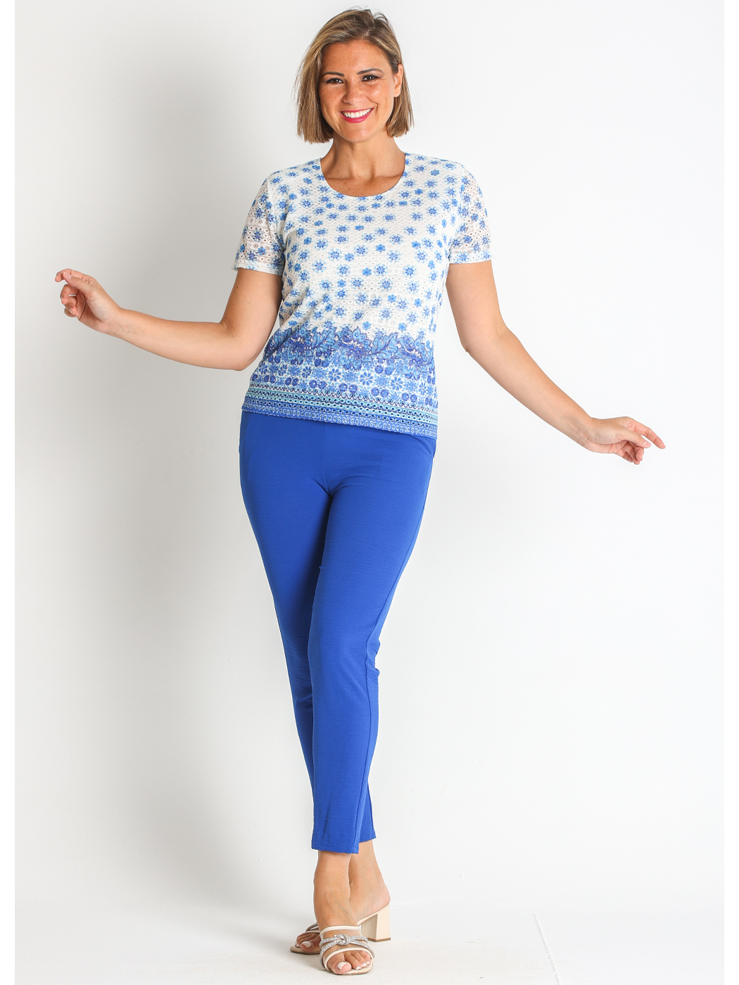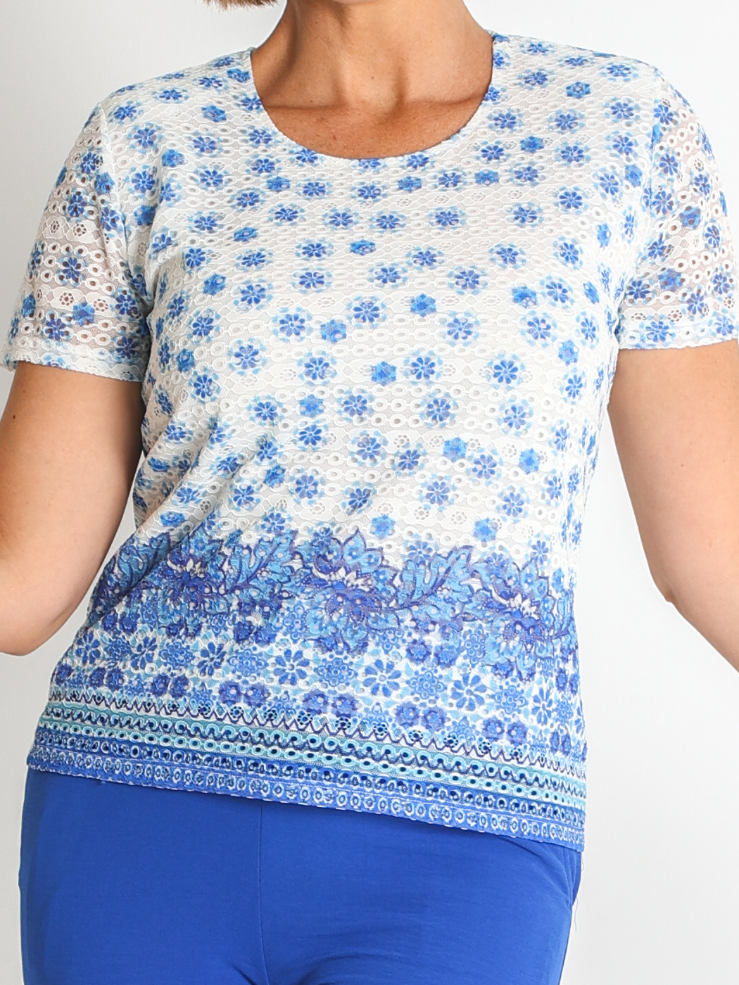 Camiseta estampada en tejido de punto calado con blonda. Prenda suave y elástica para una mayor comodidad.