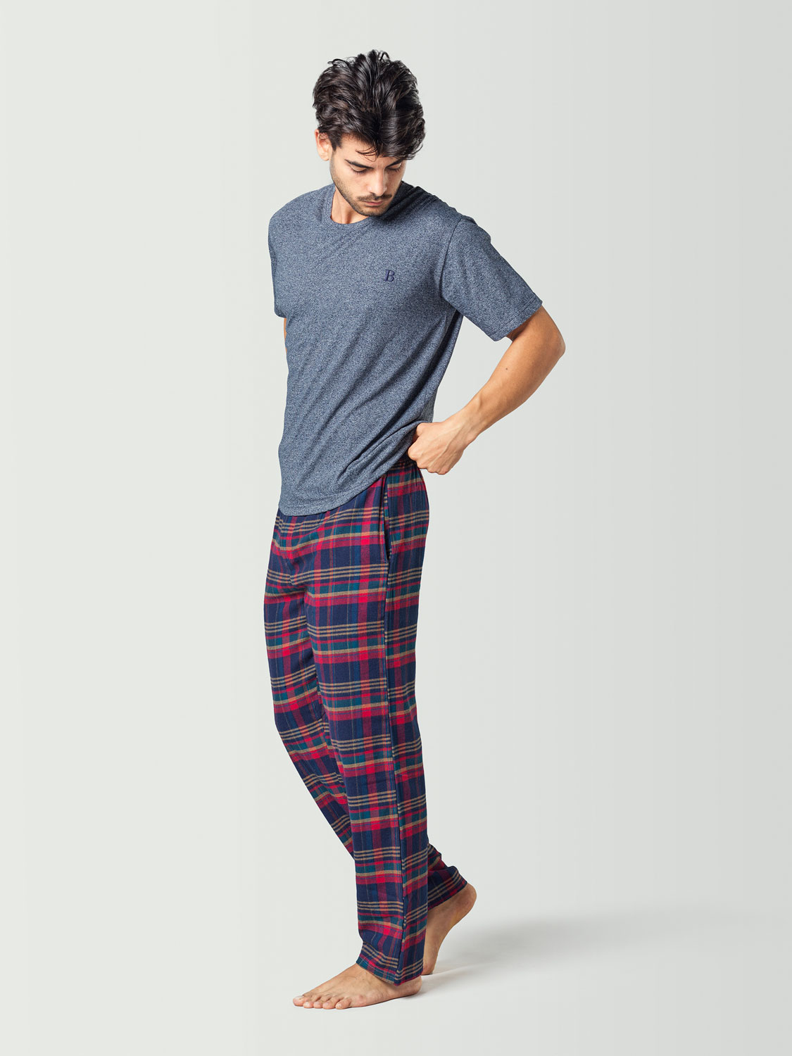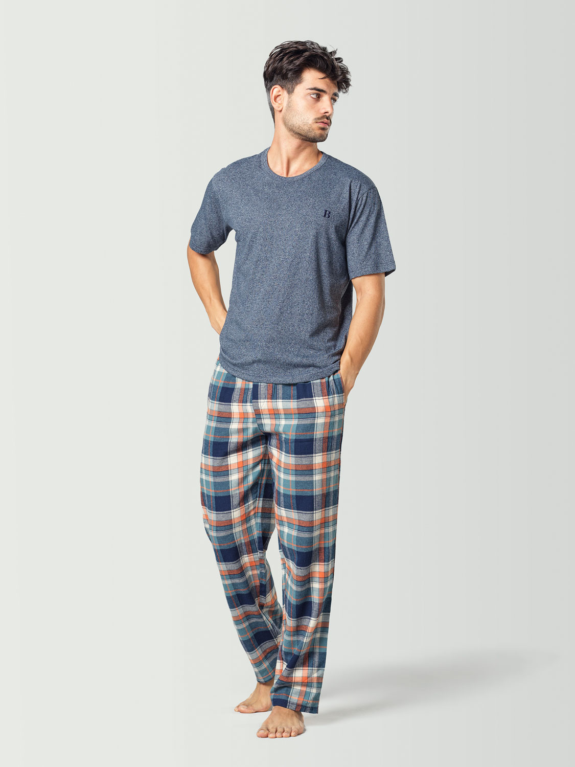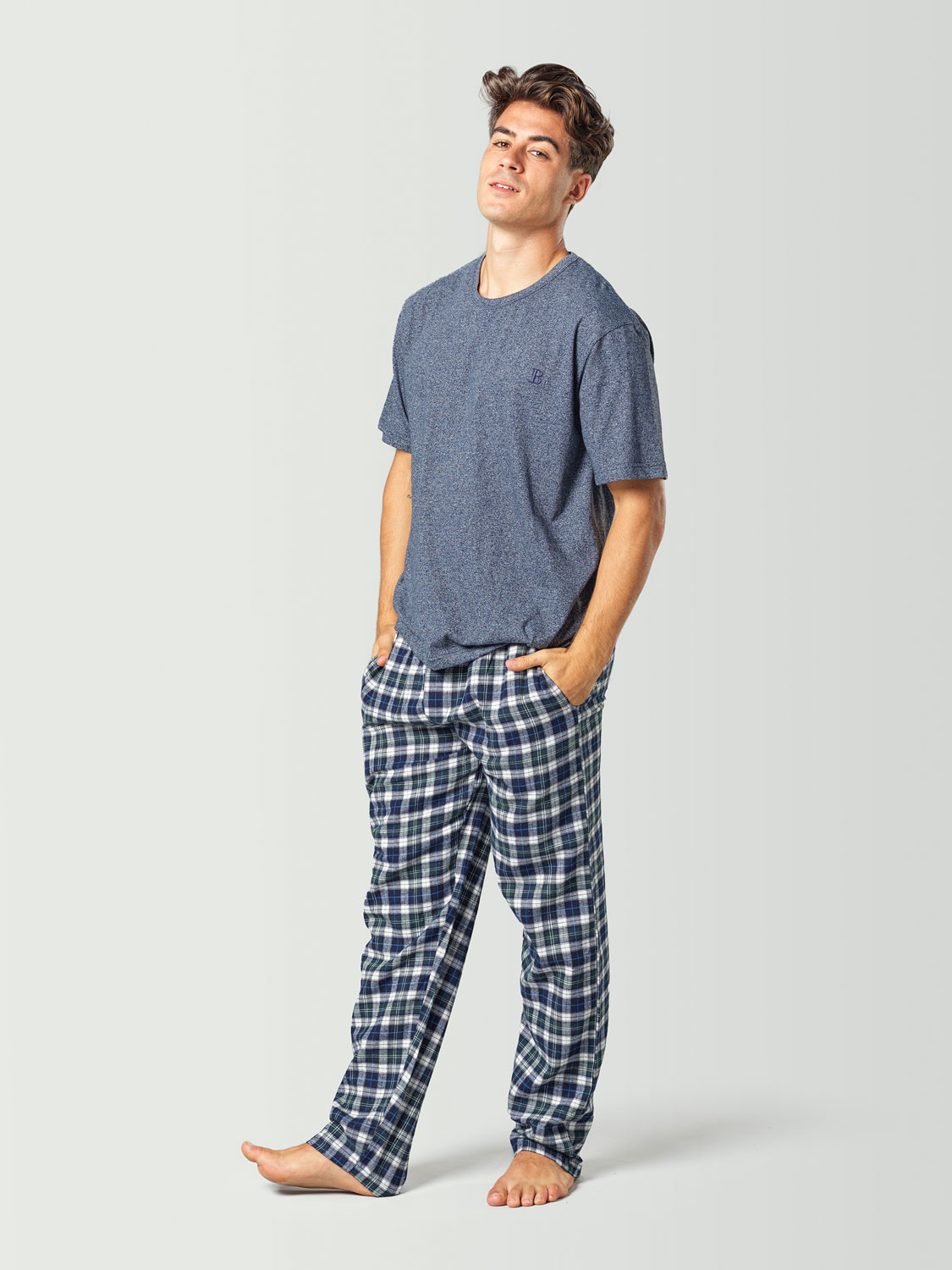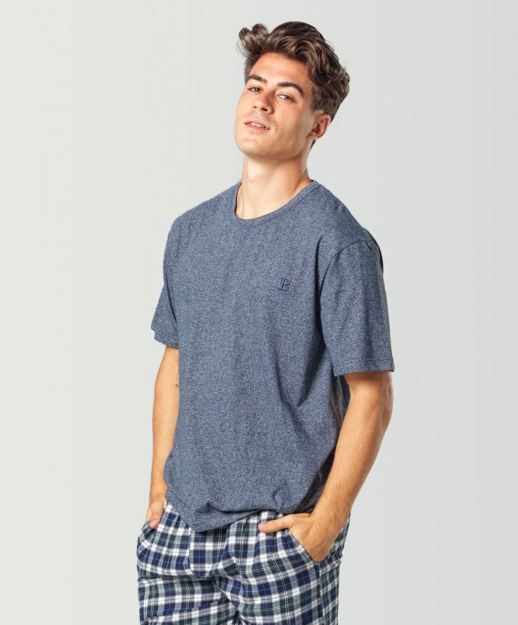 Esta camiseta de pijama manga corta azul para hombre está fabricada con 50% algodón y 50% poliéster y es muy cómoda y fácil de combinar con cualquier pantalón de pijama a cuadros que encontrarás en nuestros pijamas combinables. Además, tiene un color jaspeado muy bonito que queda bien con todo.