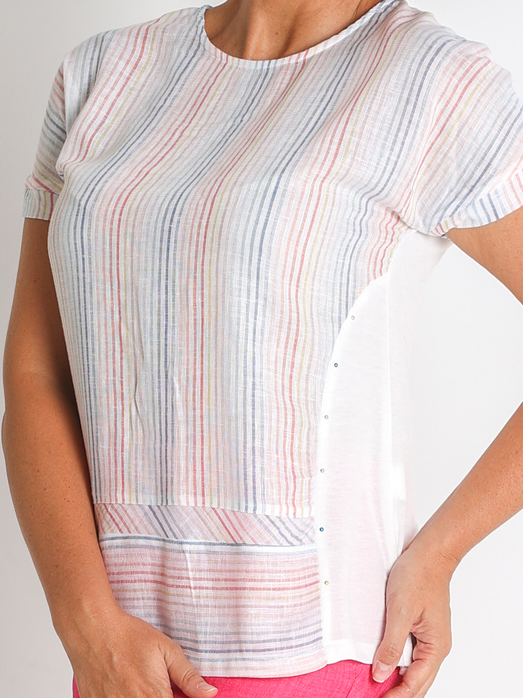 Blusa fabricada en viscosa, combinando tejido liso y estampado. Prenda muy suave y cómoda.