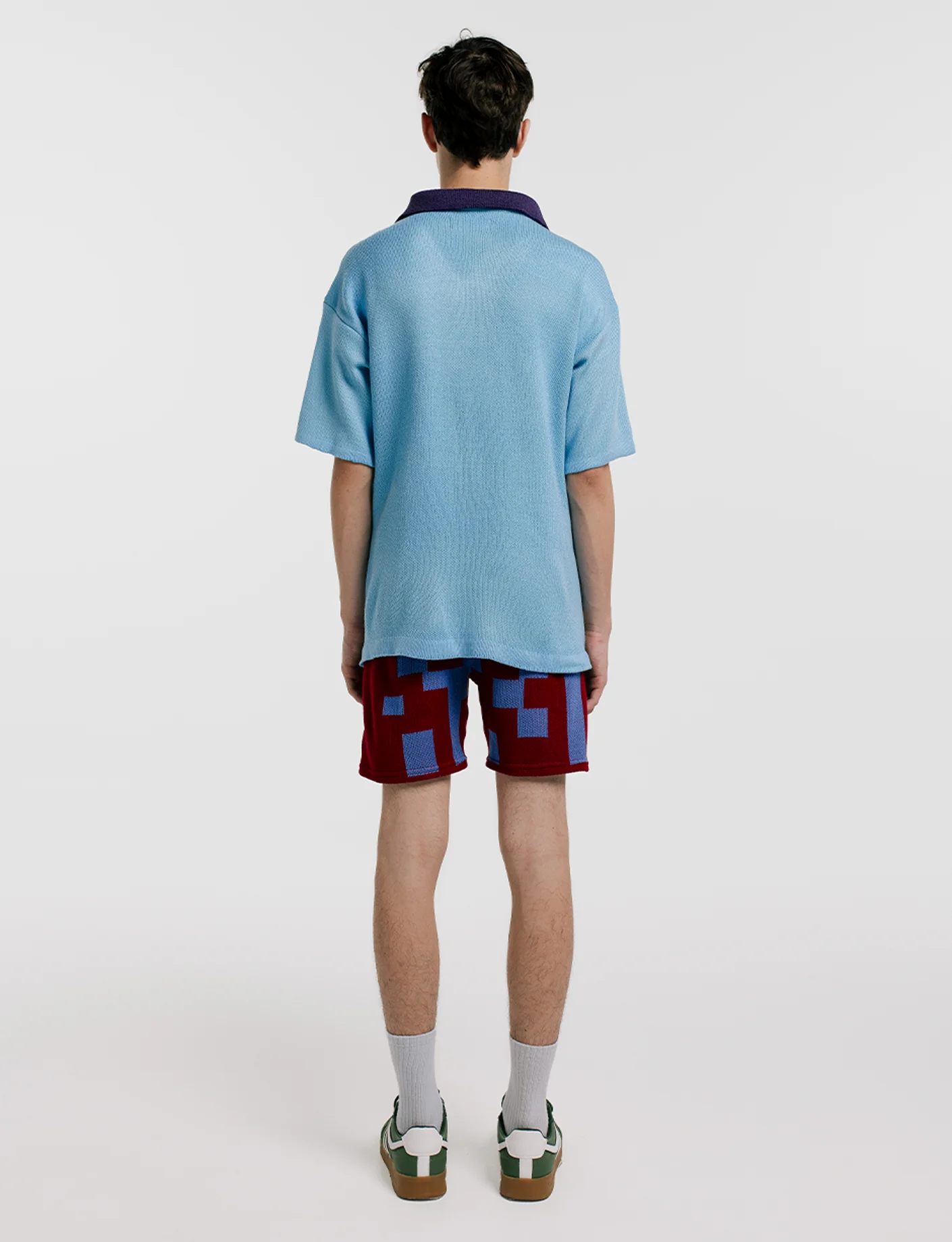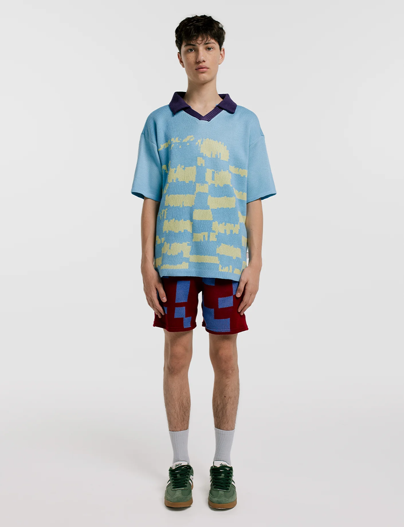 Camiseta tipo fútbol en Hilo Hipoalergénico en color gummy con print de cuadros verdes . Fit Clásico con detalles deportivos. Tejido ligero con textura de franjas, terminado y bordado a mano. Hecho en Boyacá, Colombia.
