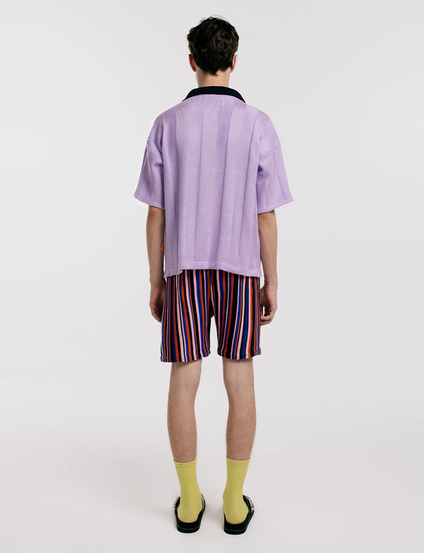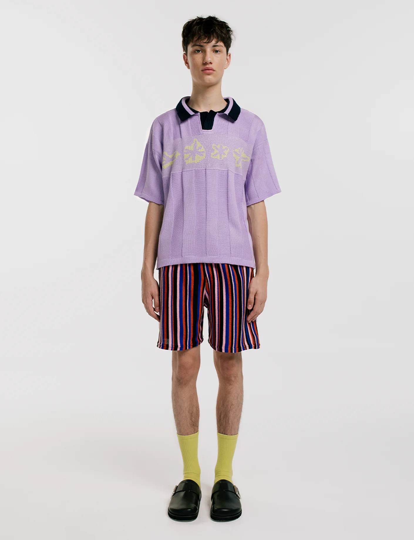 Camiseta tipo fútbol en Hilo Hipoalergénico en color lila con print asteriscos verde manzana . Fit Clásico con detalles deportivos. Tejido ligero con textura de franjas, terminado y bordado a mano. Hecho en Sogamoso, Boyacá, Colombia.