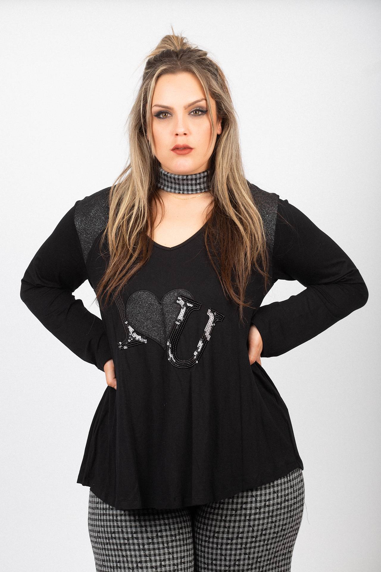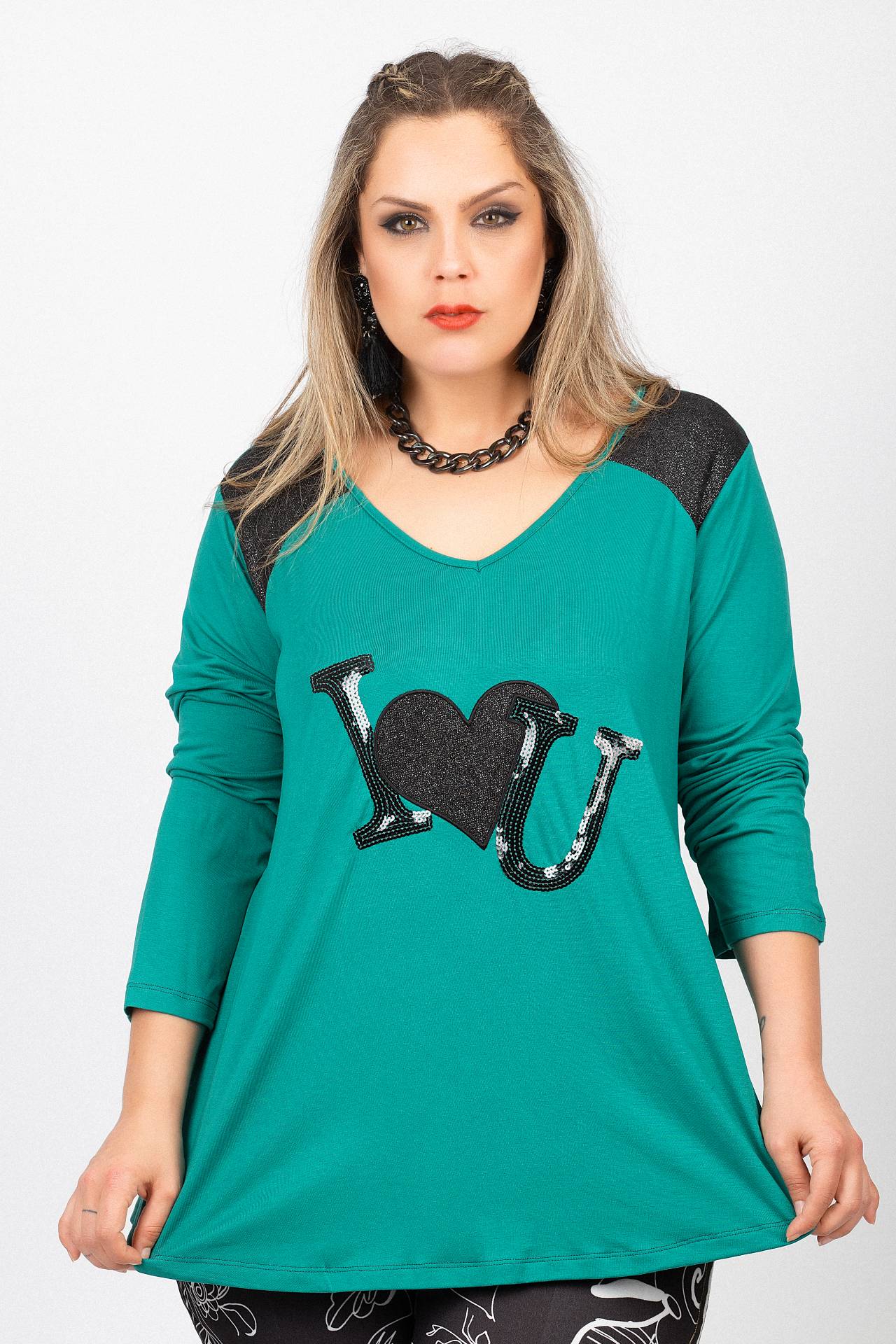 Camiseta para mujer curvy de cuello pico y manga larga, con detalle «I love U» en lentejuelas y encaje brillante en hombros.