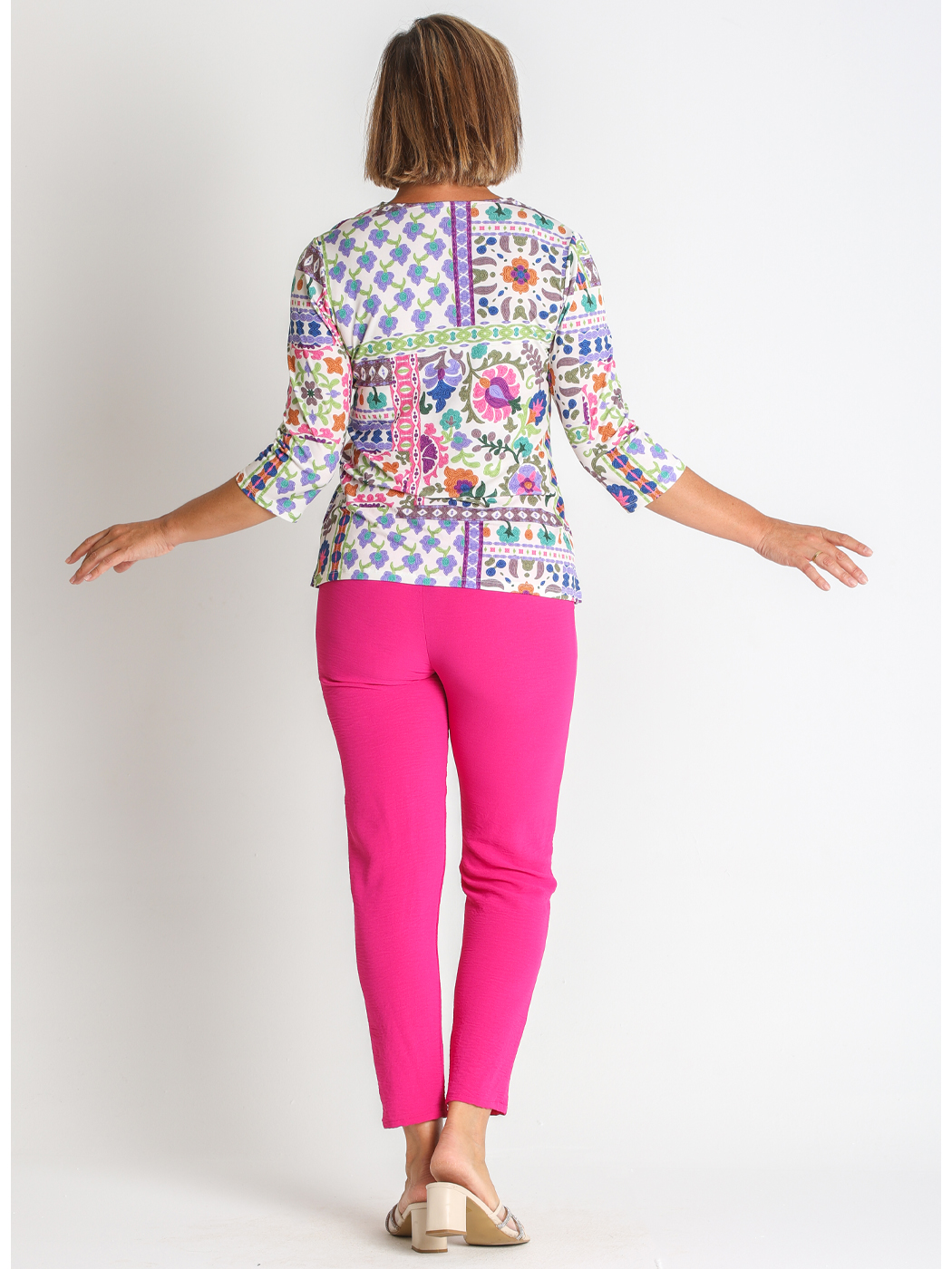 Camiseta mangas 3/4 estampada fabricada en punto. Tejido elástico y muy cómodo.