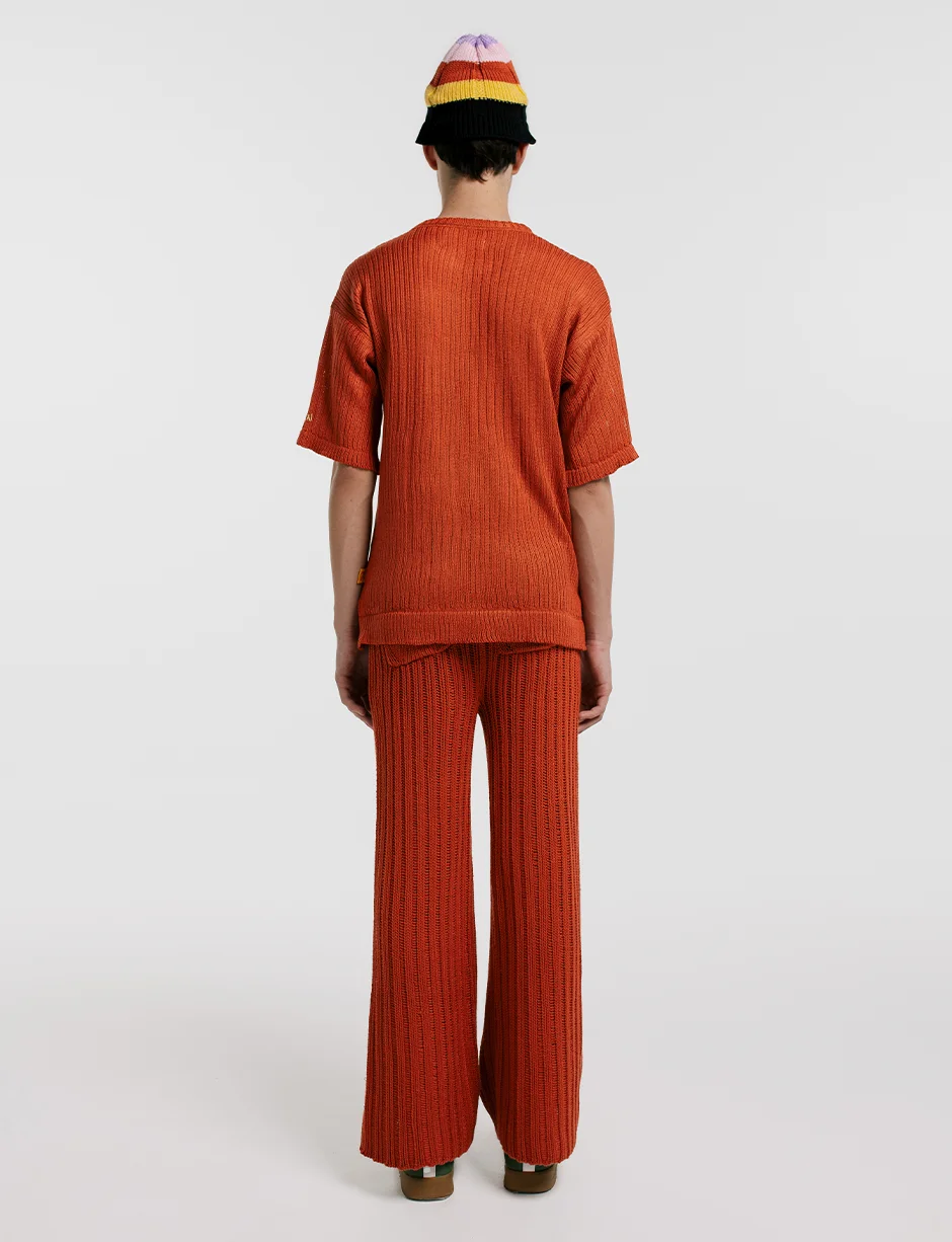 Camiseta manga corta con cuello redondo en Hilo Hipoalergénico en color terracota. Fit clásico perfecto para hacer capas con tu maglione favorito. Tejido ligero hecho tejedora rectilinea. Hecho artesanalmente en Boyacá, Colombia.