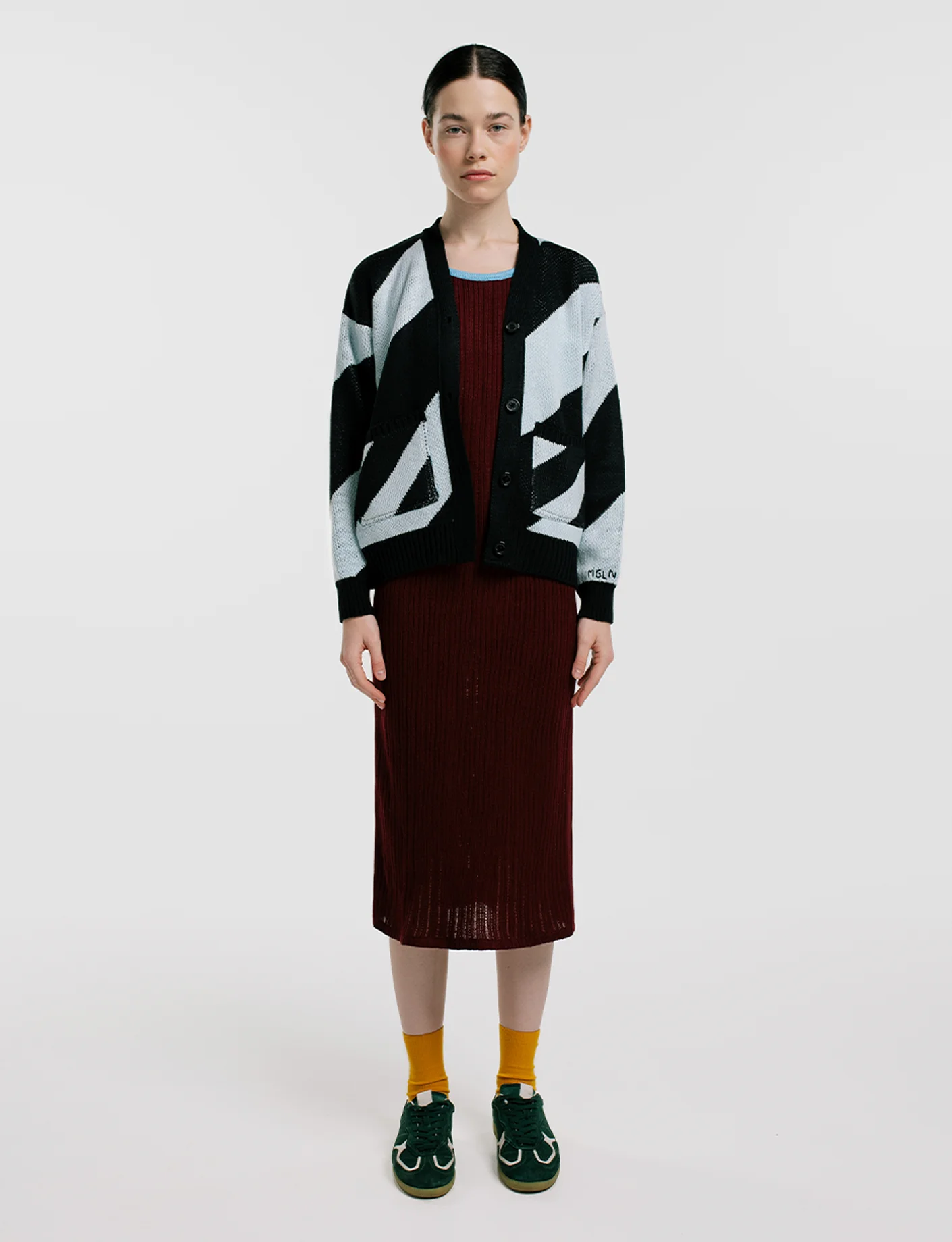 Cárdigan tejido en Hilo Hipoalergénico con patrón diagonal en azul claro y negro. Silueta larga y fit holgado. Tejido de punto, terminado y bordado a mano. Hecho artesanalmente en Sogamoso, Boyacá. Disponibilidad en todas las tallas.