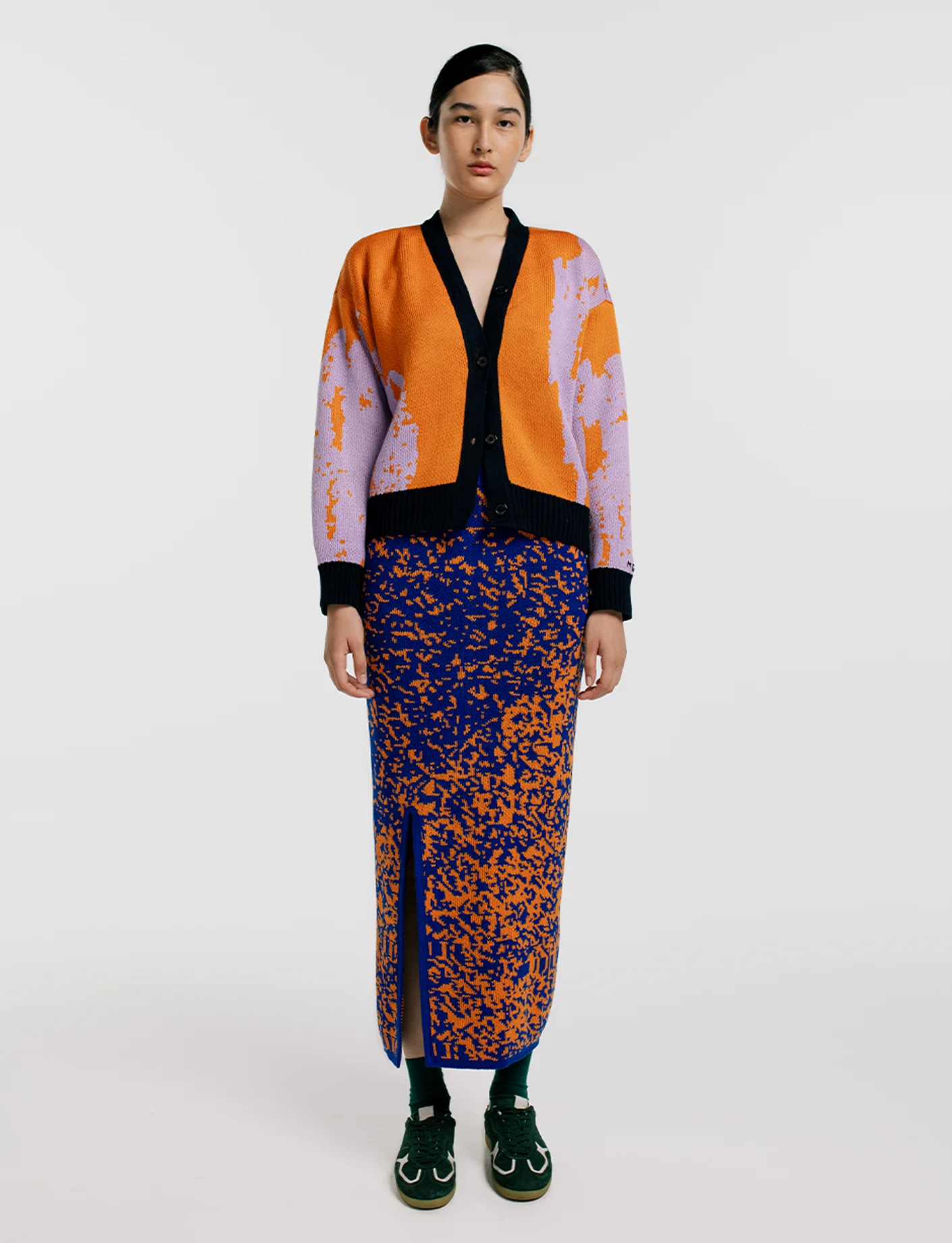 Cárdigan tejido en Hilo Hipoalergénico con ilustraciones de círculos y figuras abstractas en crudo, azul, naranja y menta. Fit relajado de largo medio. Tejido de punto, terminado y bordado a mano. Hecho artesanalmente en Sogamoso, Boyacá.