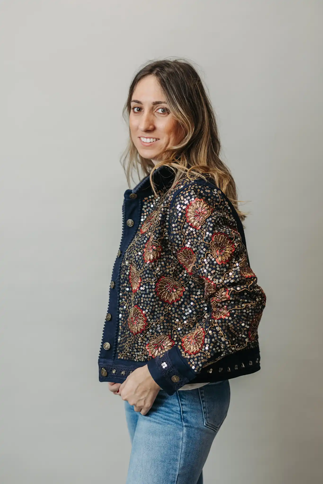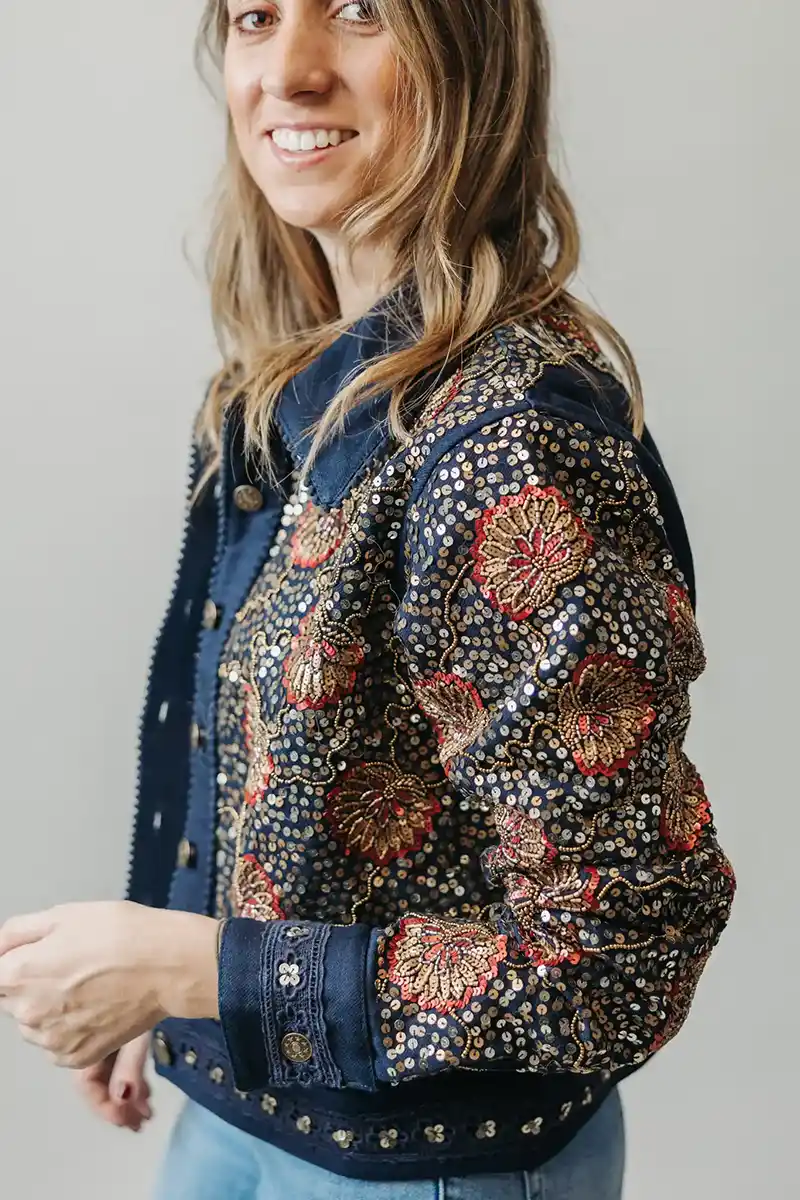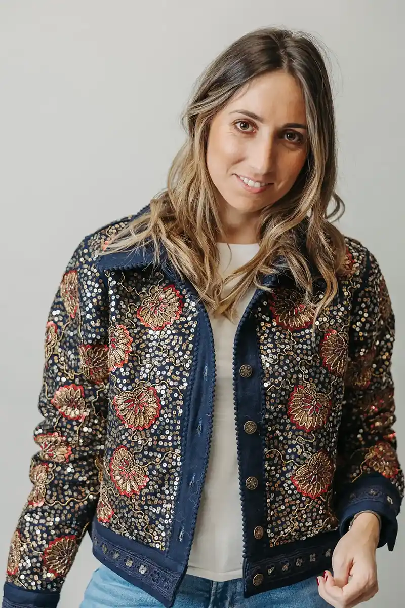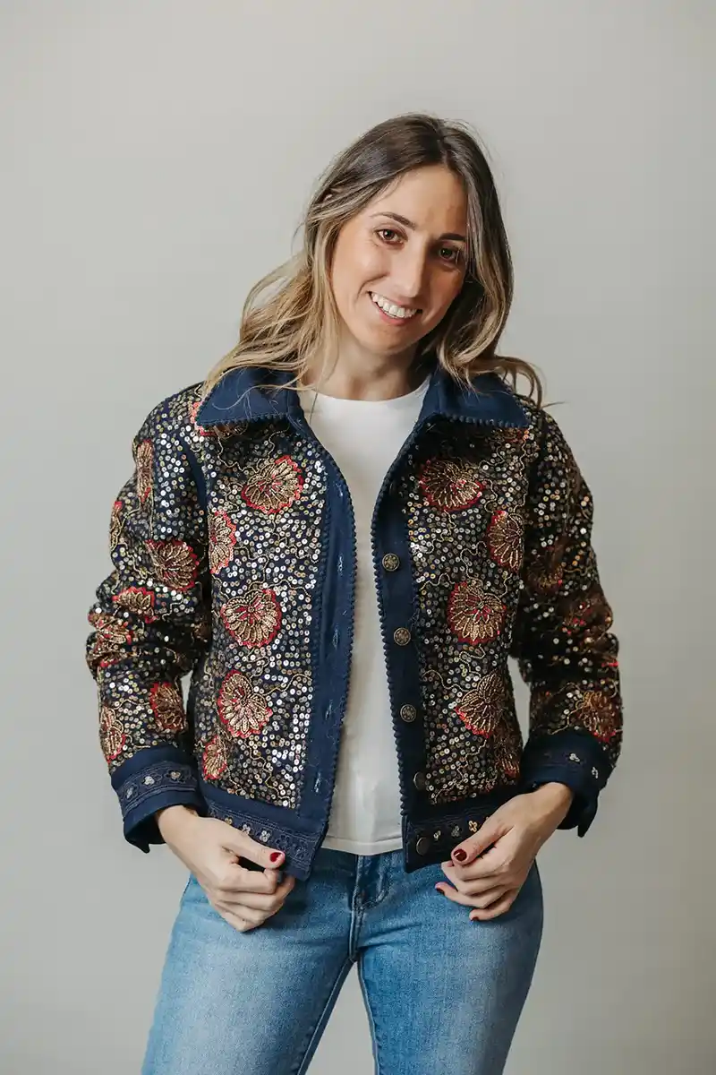 Nuestra cazadora corta vaquera con lentejuelas haciendo motivo de inspiración floral, completará tu look a la perfección tanto si optas por un estilismo casual para el día o por algo más sofisticado para brillar en la noche. ¡No te quedes sin la tuya! ¡Haz tu pedido ahora!