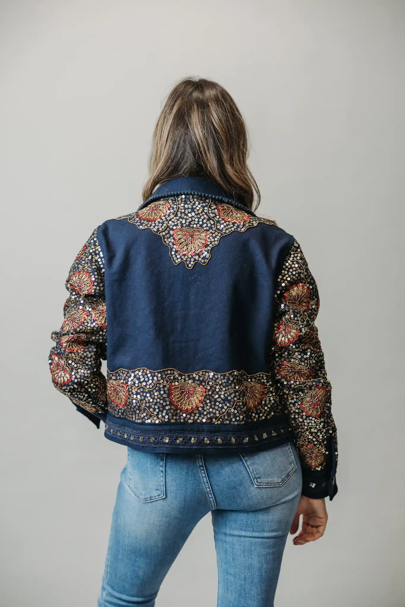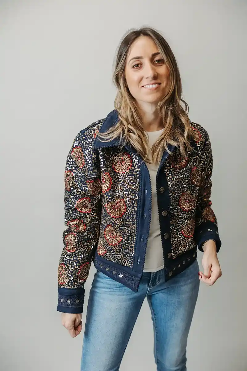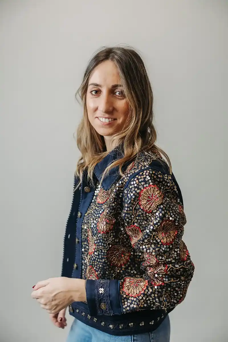 Nuestra cazadora corta vaquera con lentejuelas haciendo motivo de inspiración floral, completará tu look a la perfección tanto si optas por un estilismo casual para el día o por algo más sofisticado para brillar en la noche. ¡No te quedes sin la tuya! ¡Haz tu pedido ahora!