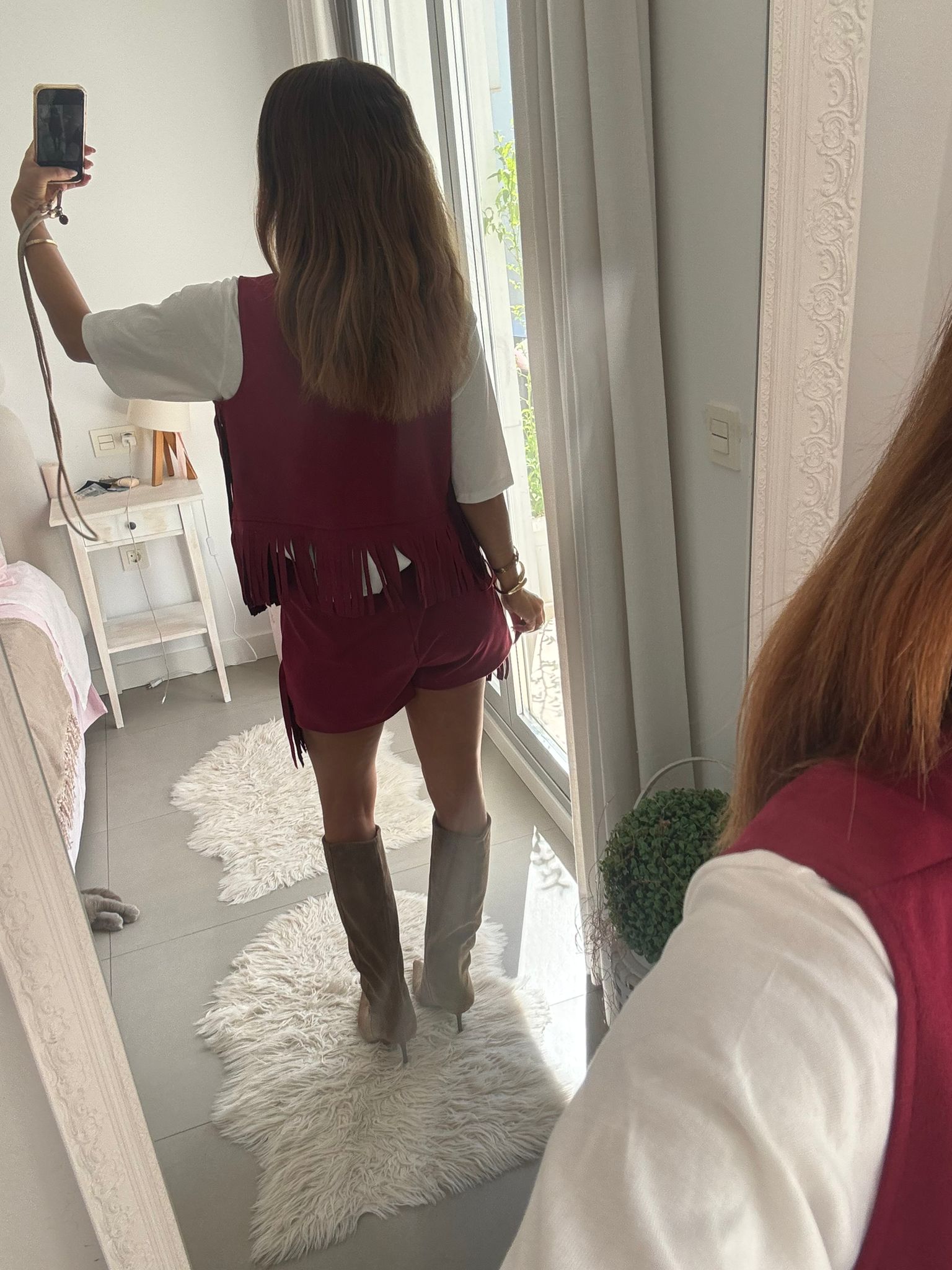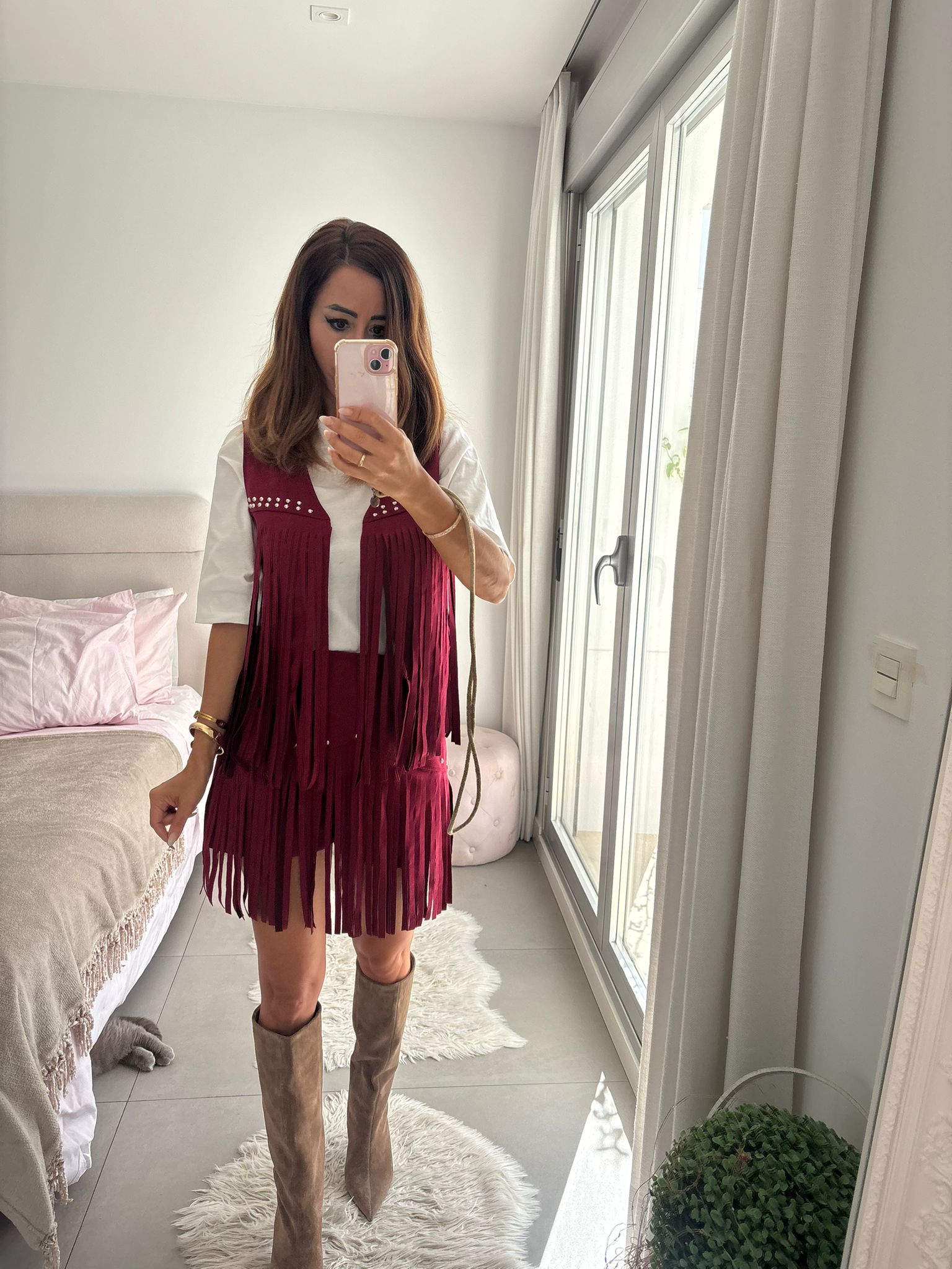 Chaleco de ante sintético con flecos largos y detalle de tachuelas.