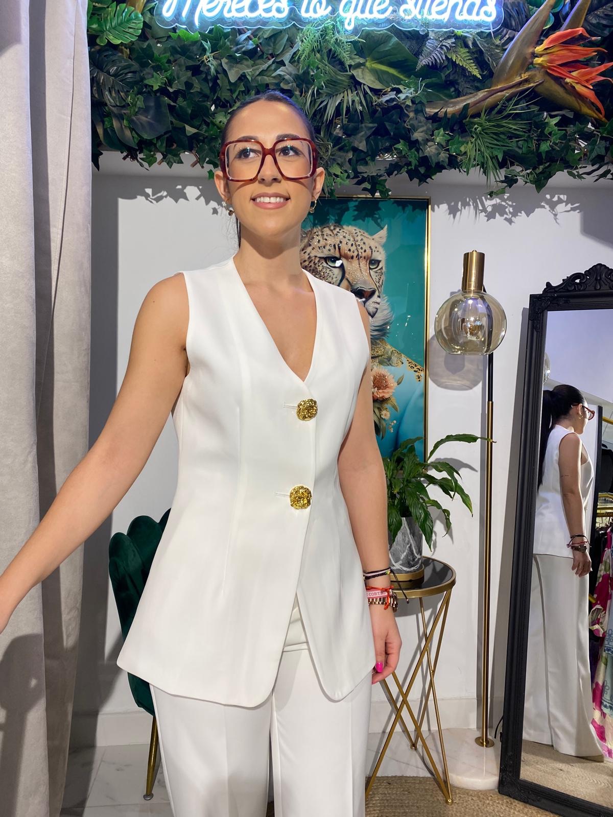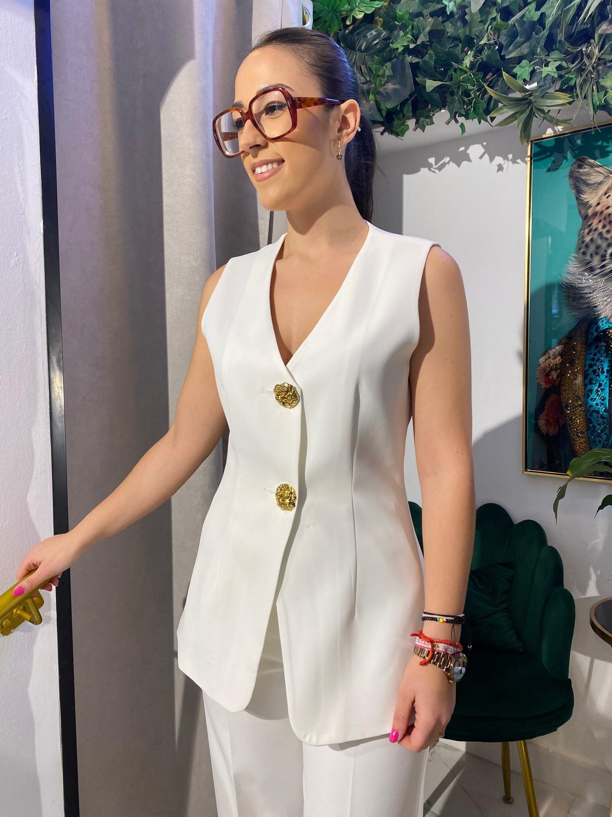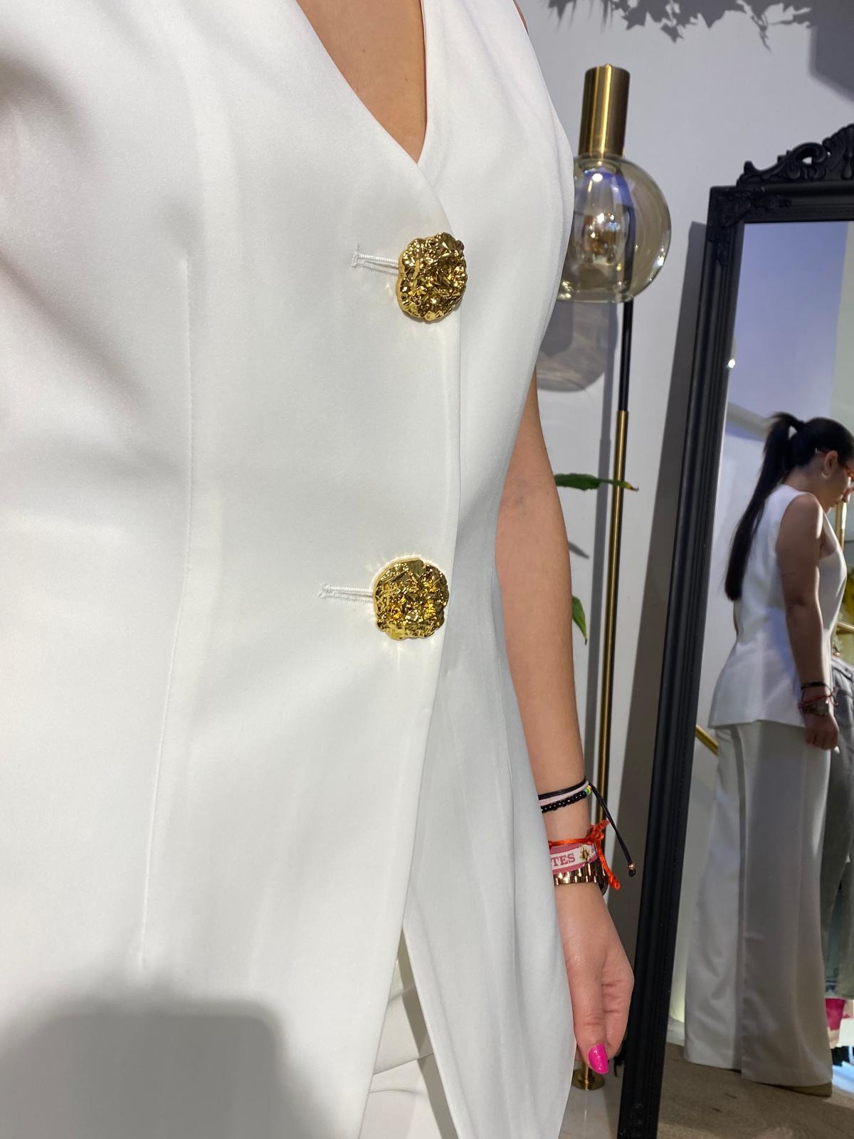 El chaleco Attentif corto con botones dorados es una prenda elegante y versátil que combina la sofisticación de los botones dorados con un corte moderno y favorecedor.