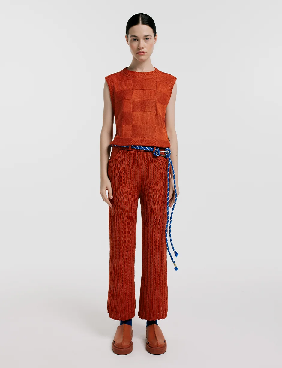 Chaleco cuello redondo en Hilo Hipoalergénico en terracota con textura de cuadros. Fit oversized y tejido de punto. Terminado y bordado a mano. . Hecho en Sogamoso, Boyacá, Colombia.