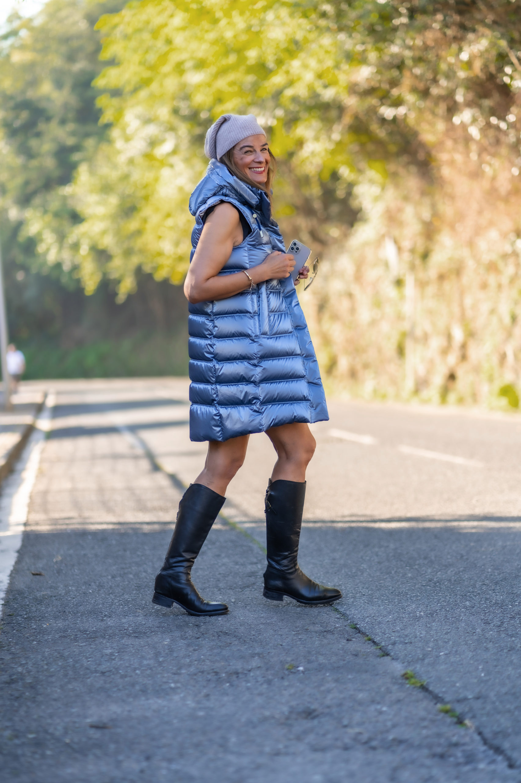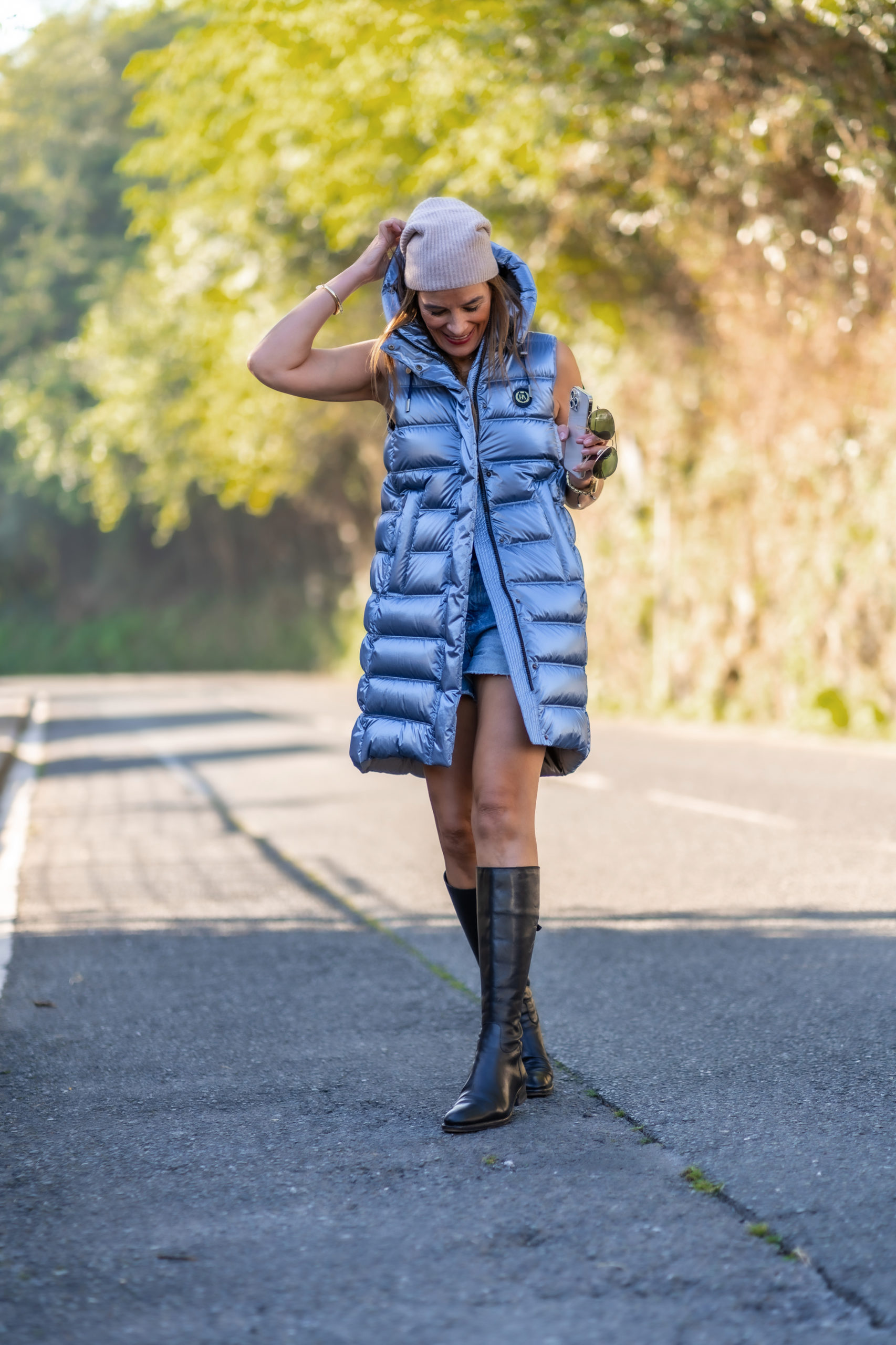 Chaleco de color Azul, con acabado brillante. Tiene una preciosa capucha desmontable.