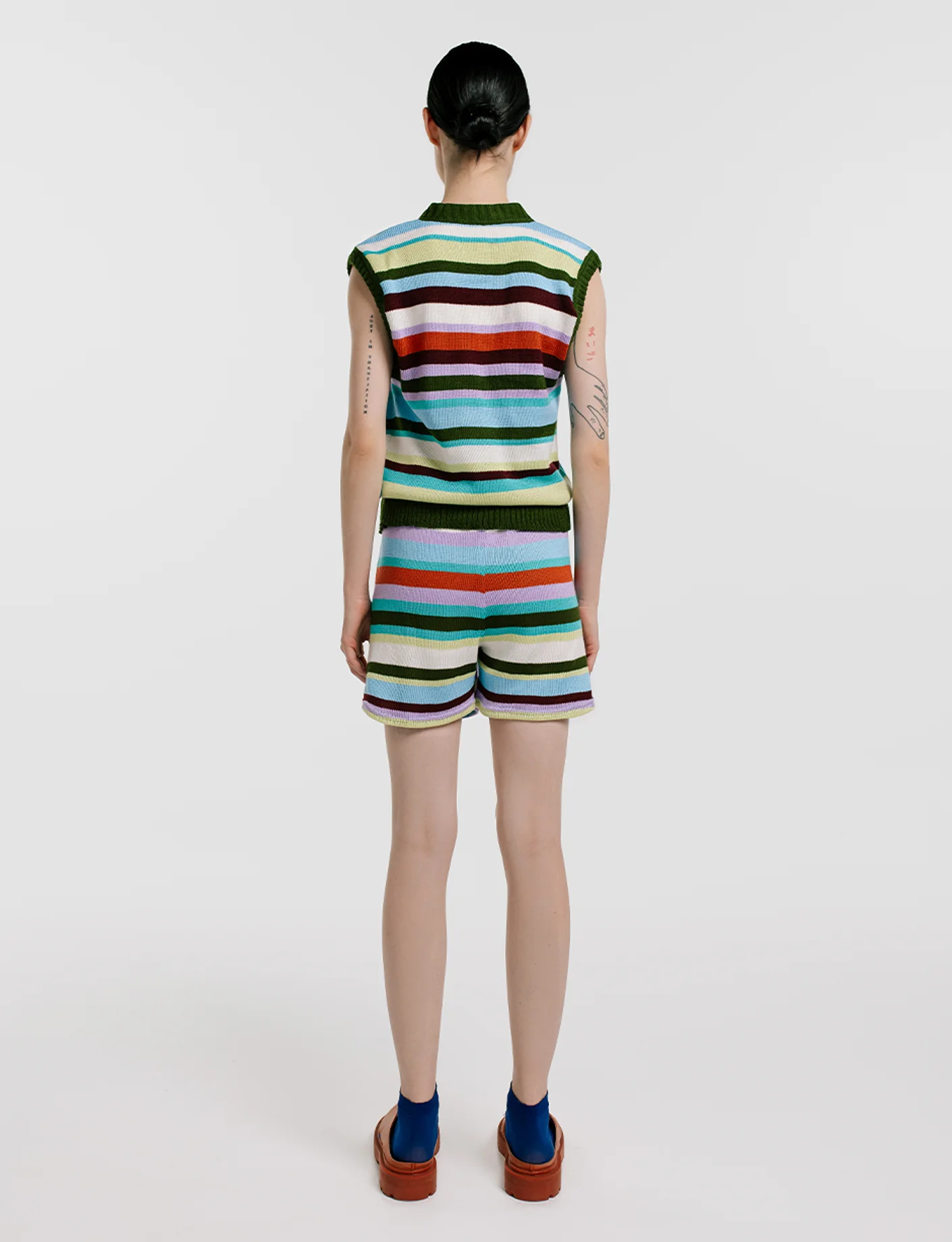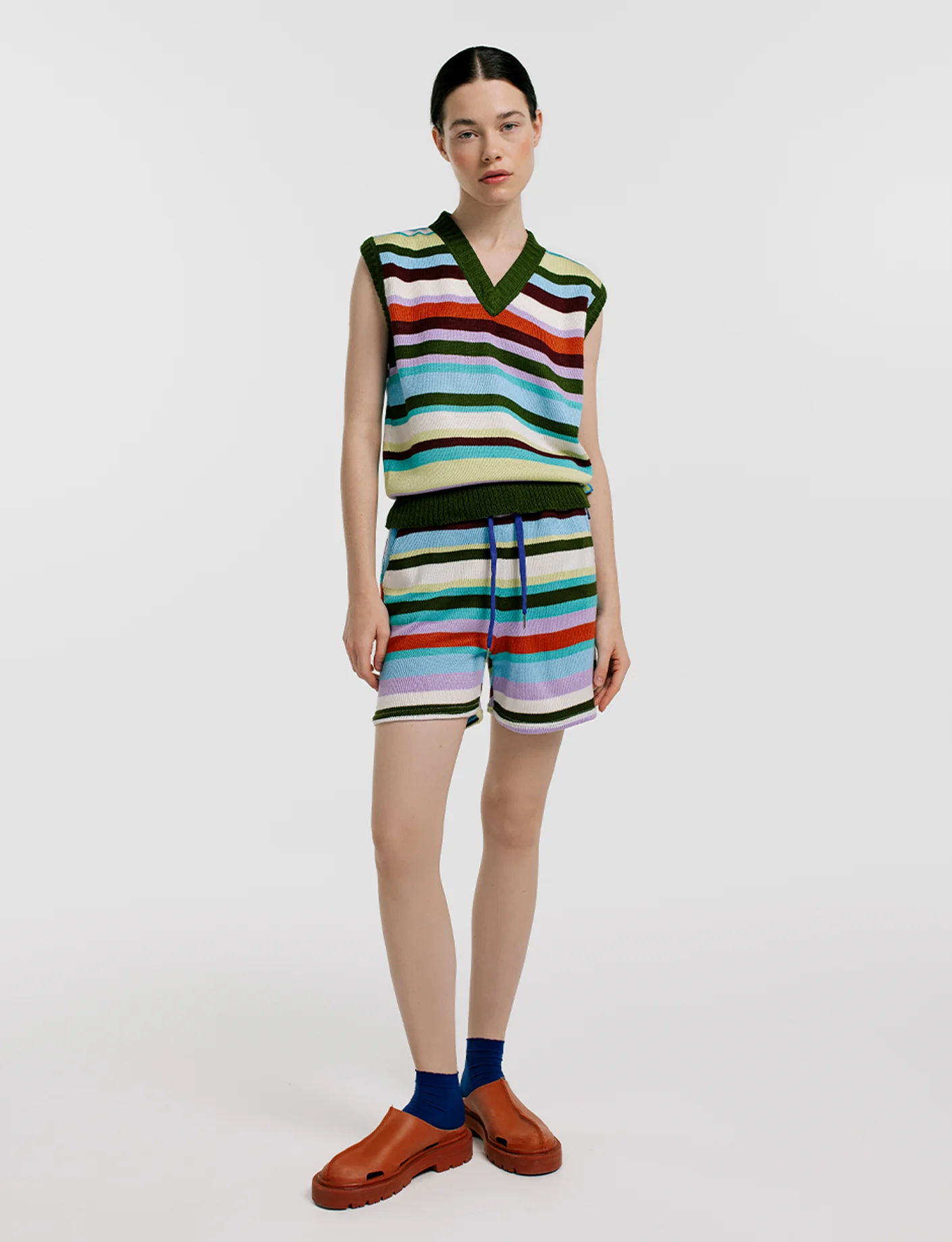 - Chaleco con cuello en V en Hilo Hipoalergénico con rayas horizontales. Fit oversized perfecto para hacer layering. Tejido de punto, terminado y bordado a mano. . Hecho en Sogamoso, Boyacá, Colombia.