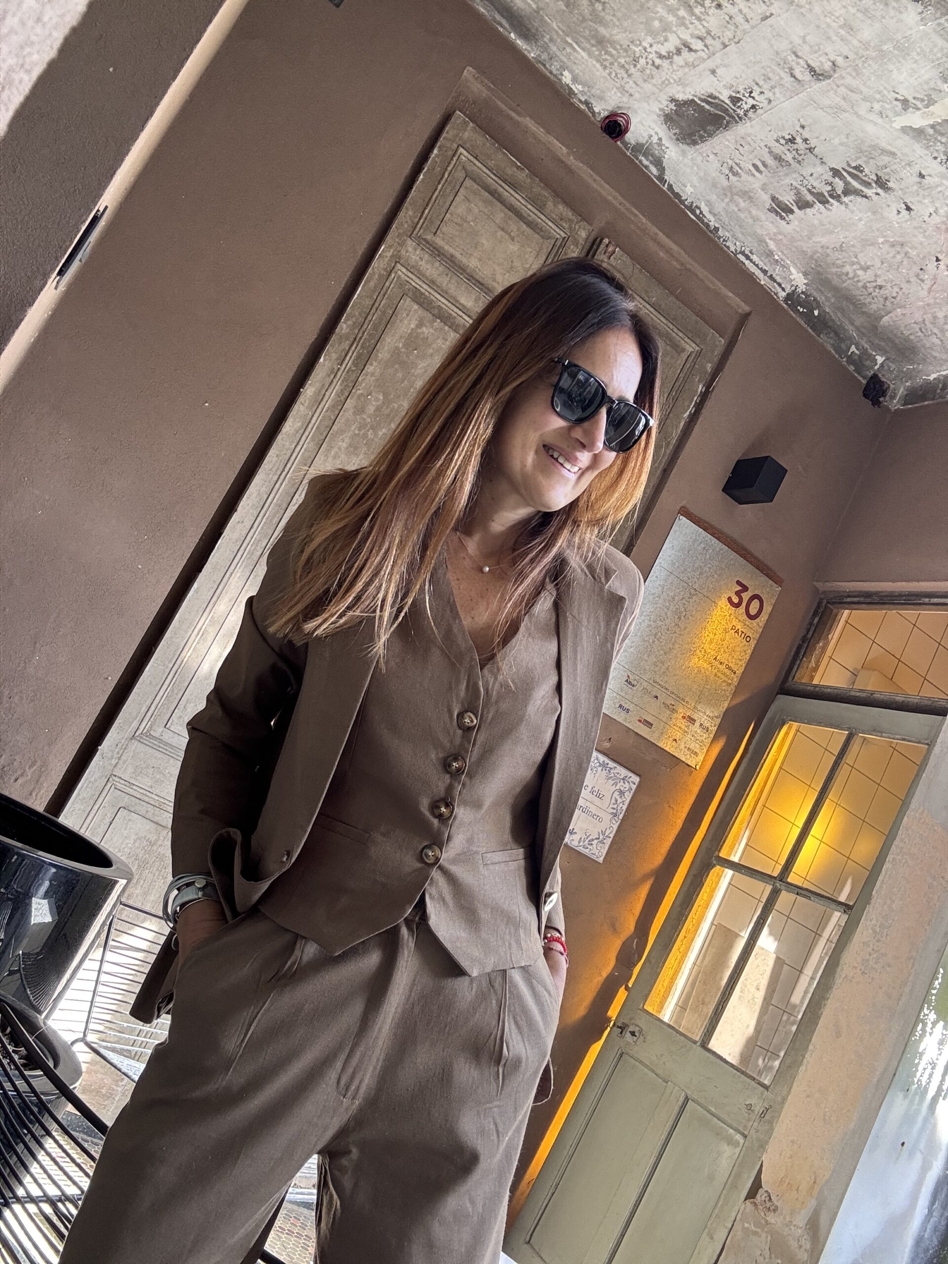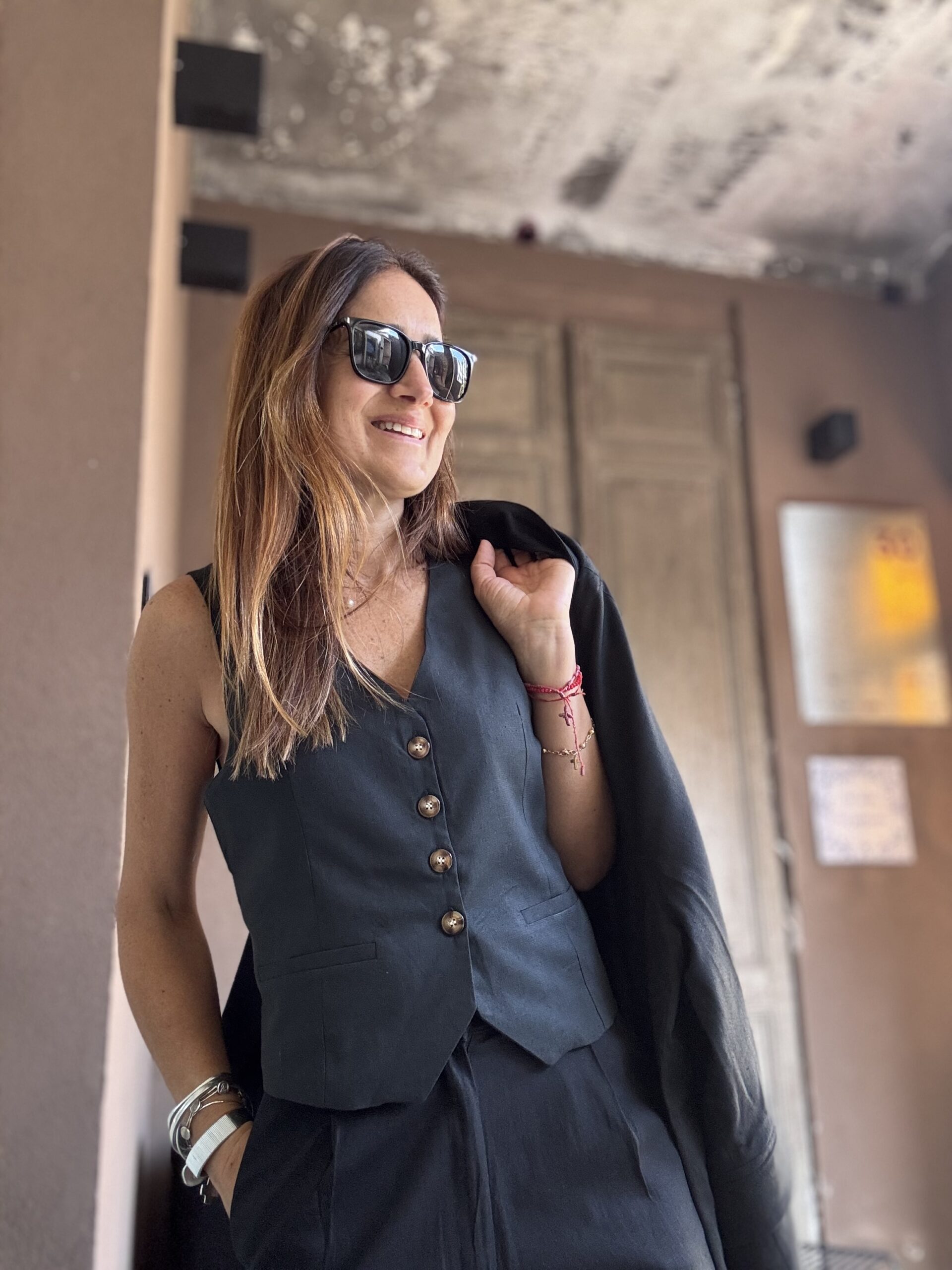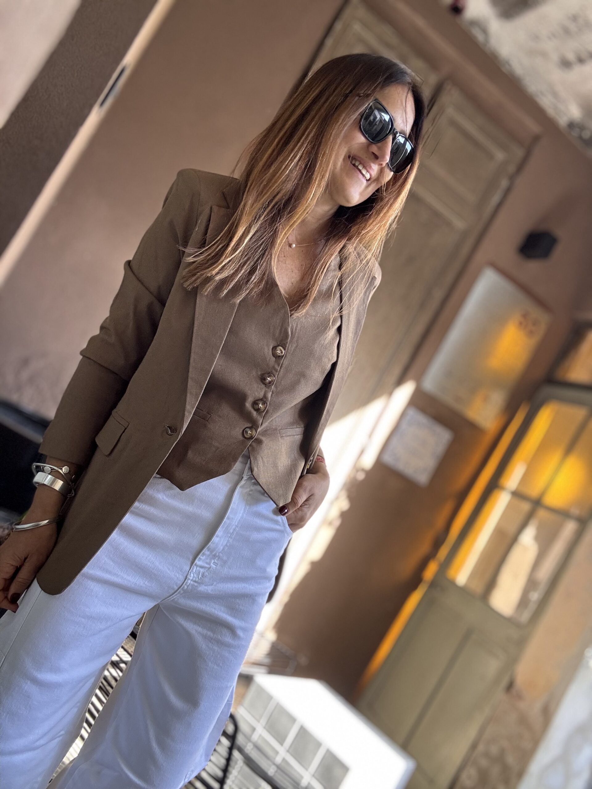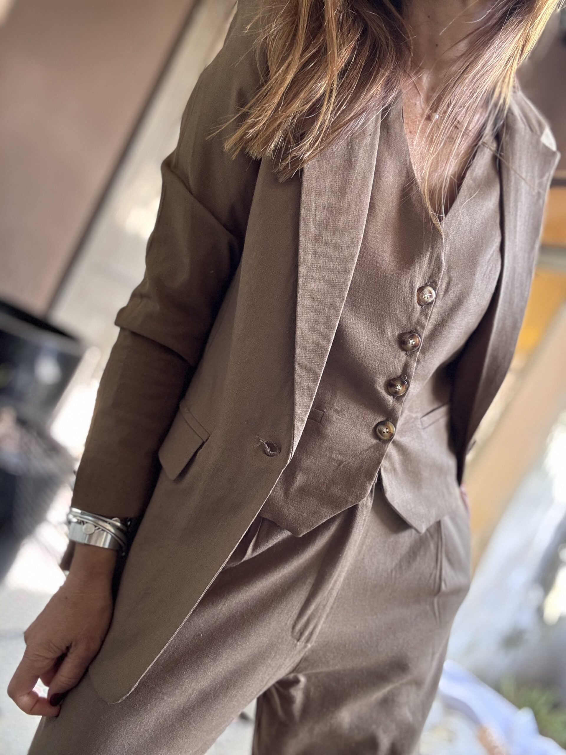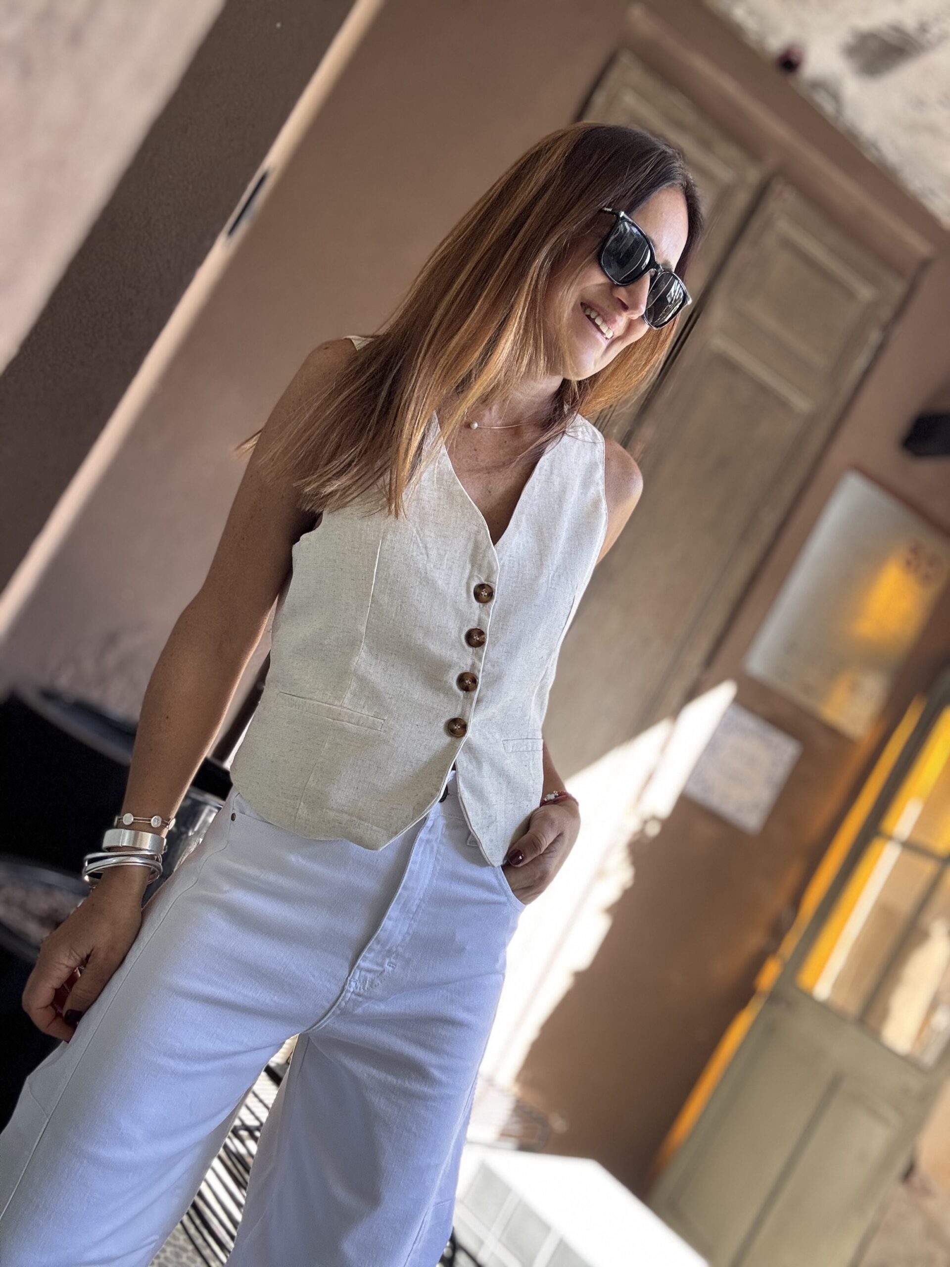Chaleco de lino forrado en su interior con botones italianos.  Tiene un lazo en la parte trasera para ajustar la cintura.