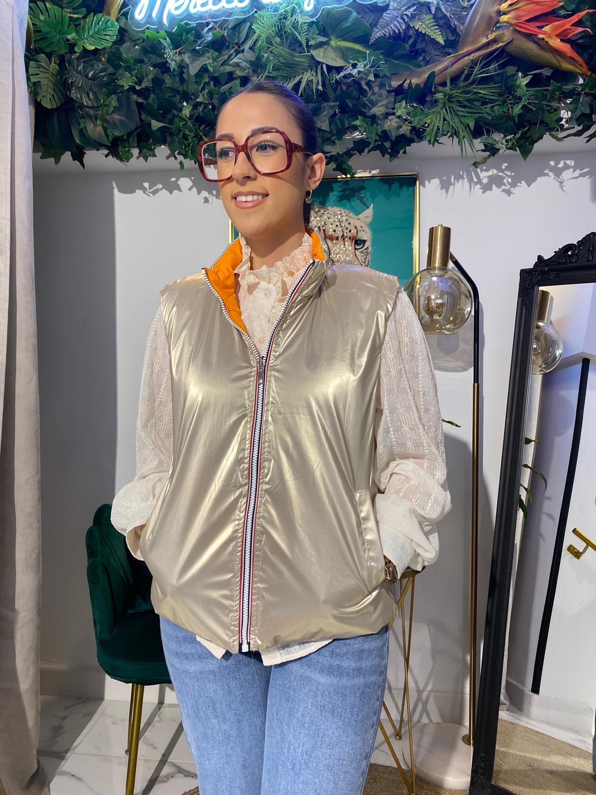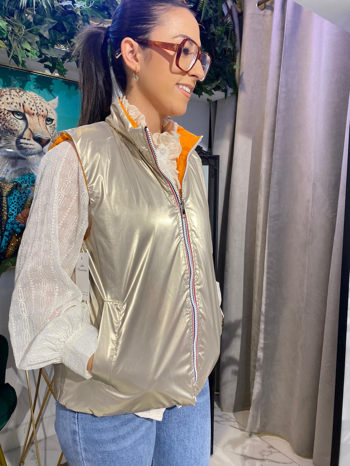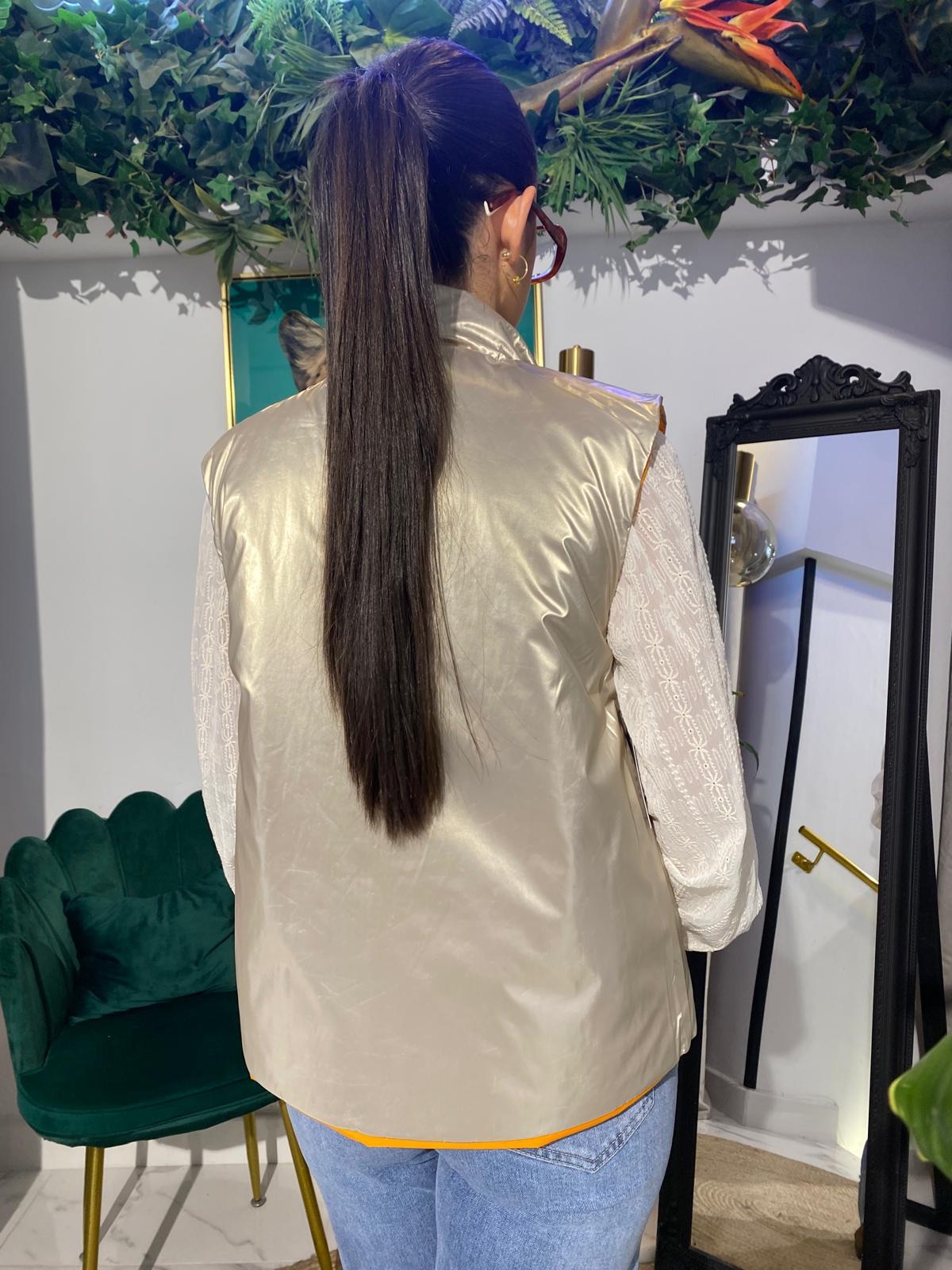 Este chaleco reversible satinado es la prenda perfecta para un look moderno y versátil. Su diseño reversible y el acabado brillante la hacen ideal para cualquier ocasión, desde un día casual hasta una salida nocturna.