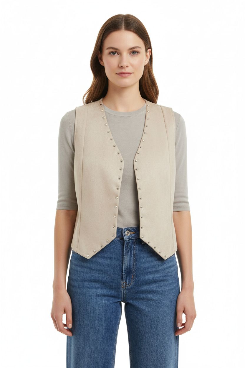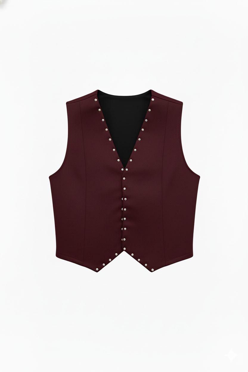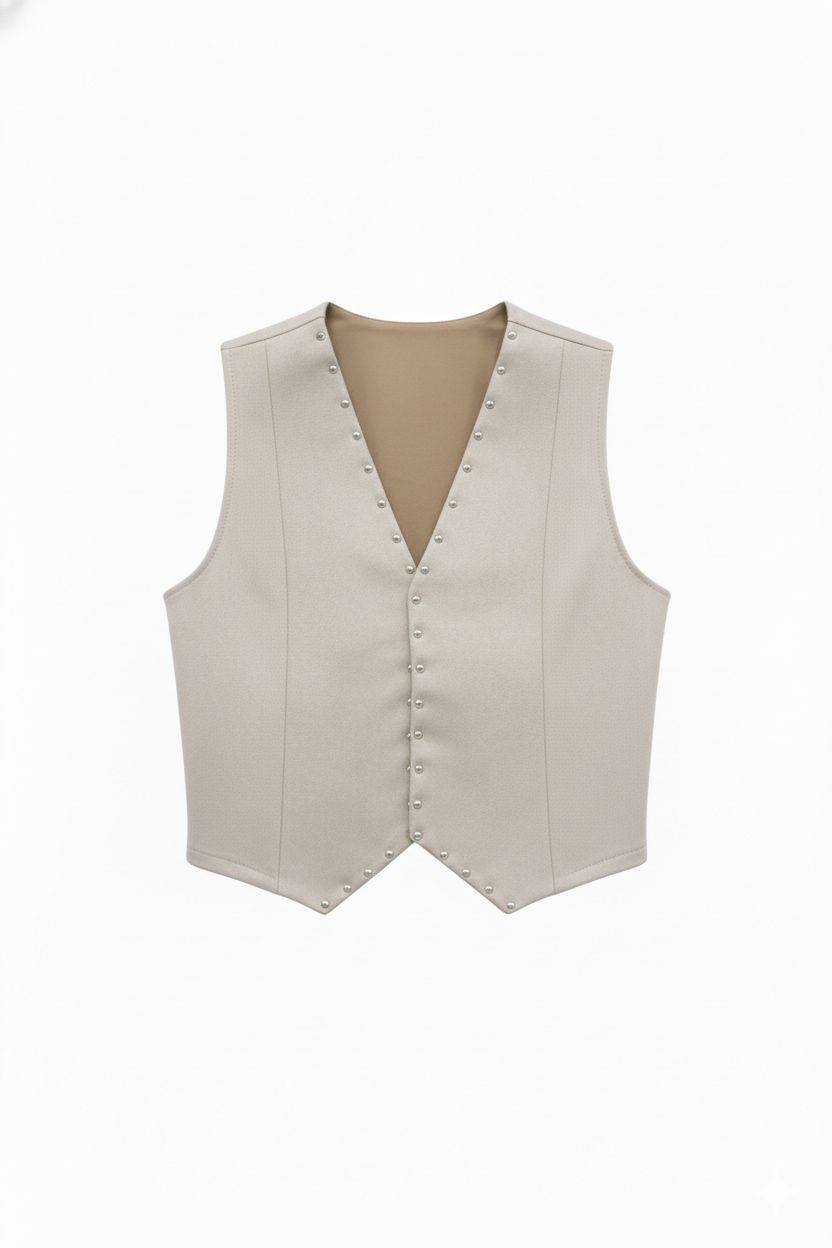 Prenda de vestir sin mangas, con un corte entallado que realza la figura, ideal para añadir un toque de elegancia y sofisticación a cualquier conjunto. Su diseño frontal presenta un cierre vertical con detalles metálicos decorativos que aportan un aire distintivo. Confeccionado para ofrecer un ajuste cómodo y versátil, este chaleco es un complemento atemporal que funciona tanto en ambientes formales como casuales, destacando por su acabado pulcro y su textura suave. Perfecto para superponer sobre camisas o camisetas.