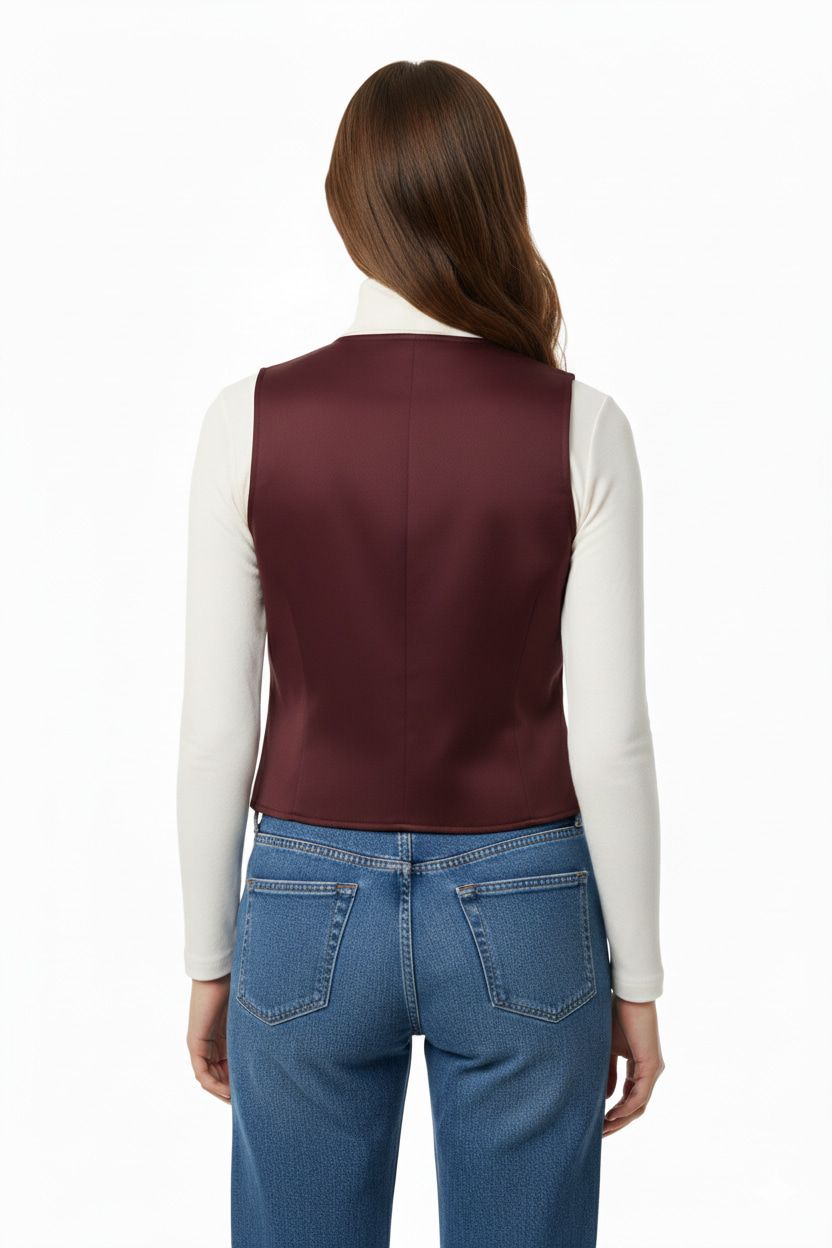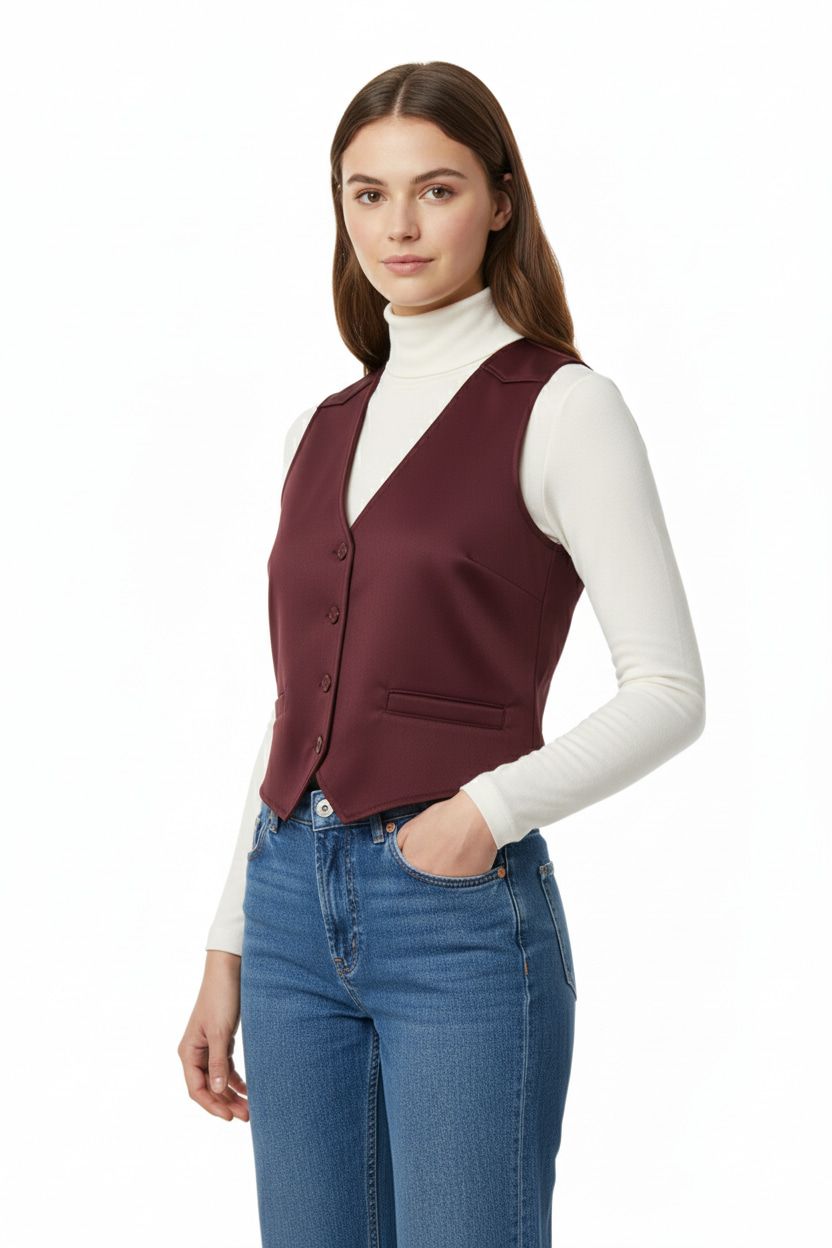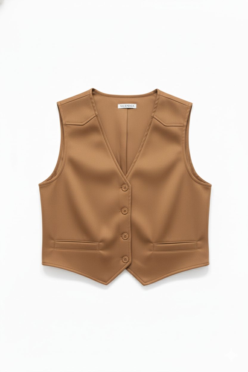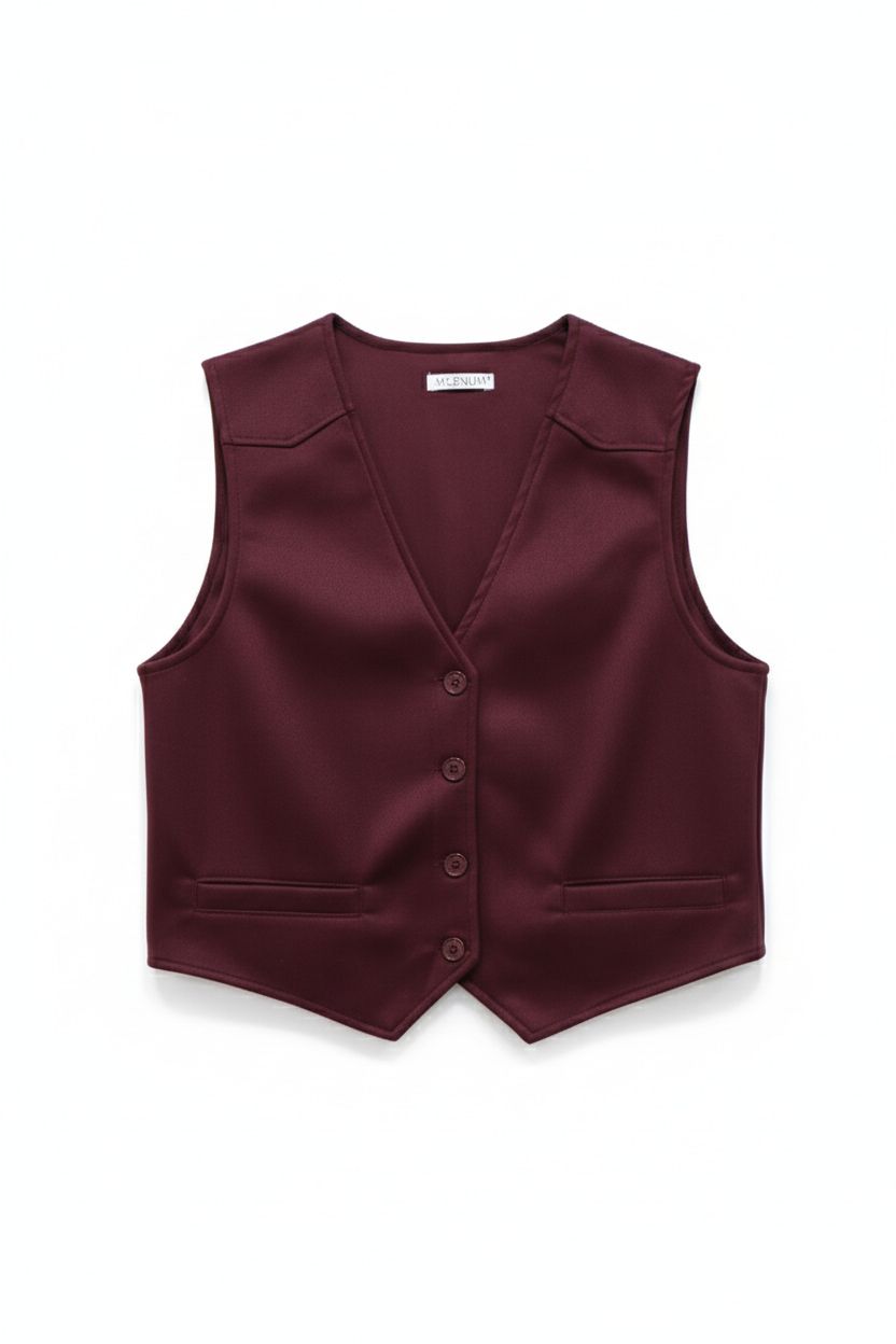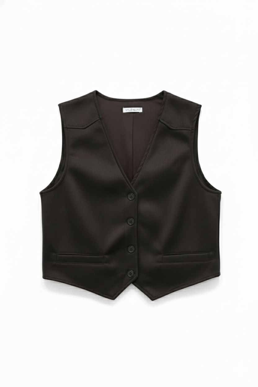 Este chaleco de diseño clásico y corte sastre presenta un elegante cuello en V y un frente abotonado. La prenda incluye dos pequeños bolsillos ribeteados a la altura de la cintura. Su tejido liso y la costura de pinzas aseguran un ajuste estructurado y sofisticado, ideal para complementar cualquier atuendo formal o de negocios.