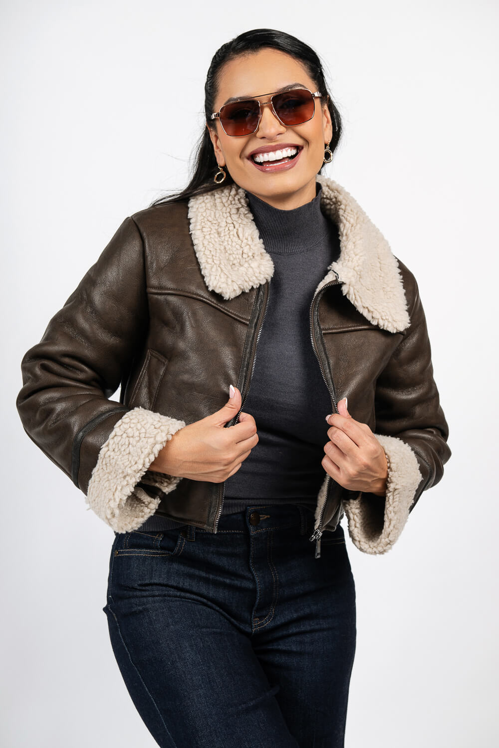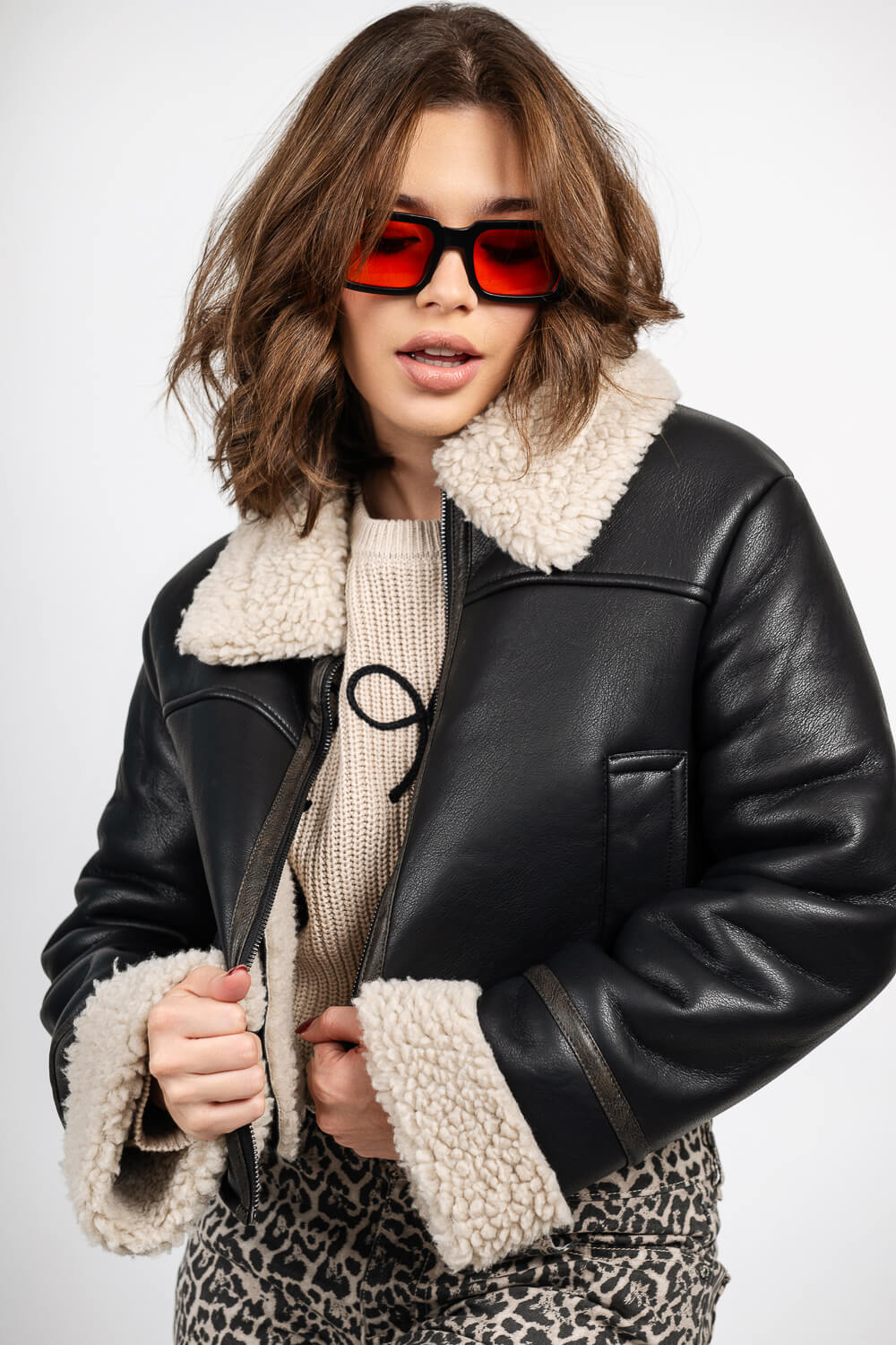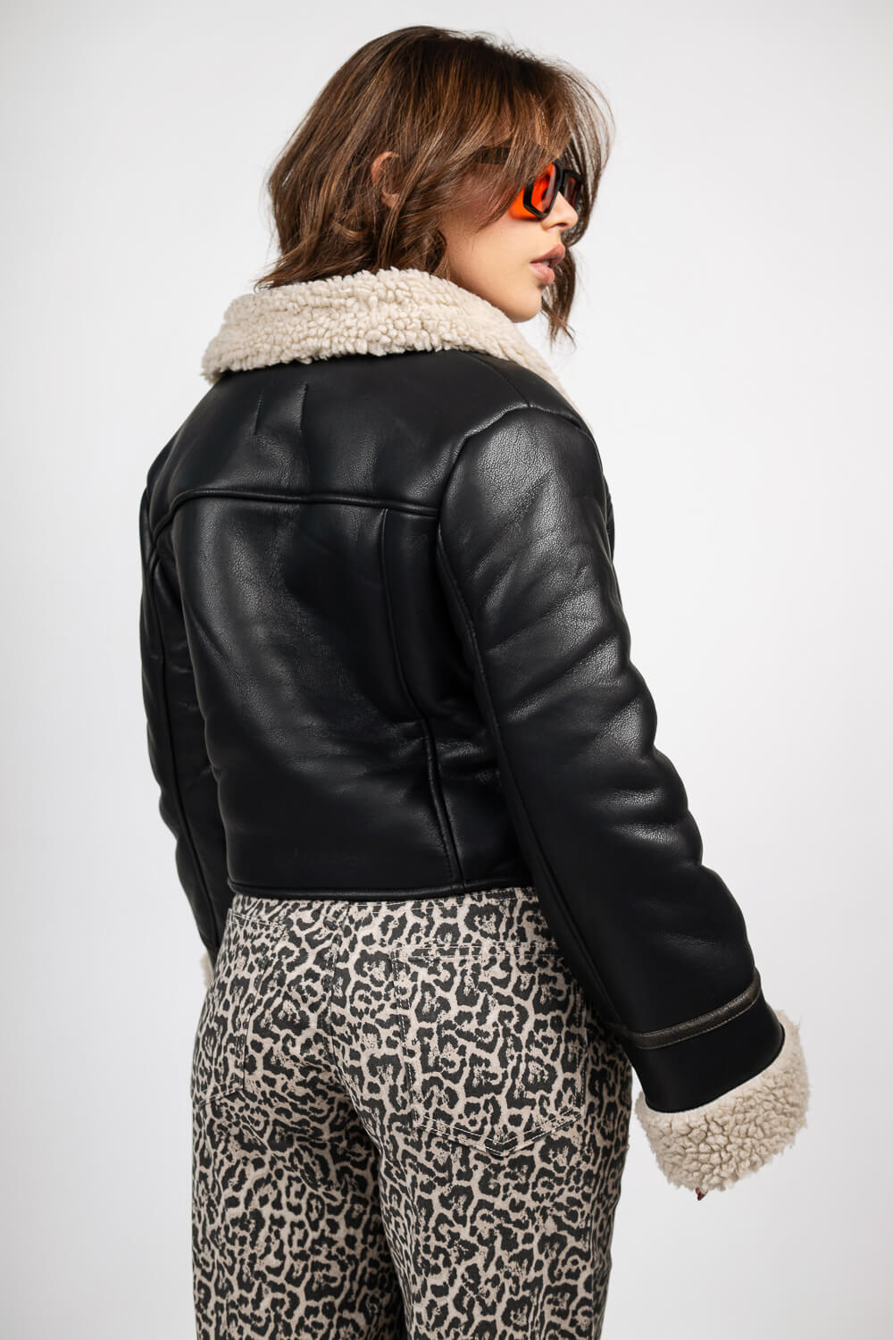 Chaqueta con apariencia de cuero y detalles en sherpa
