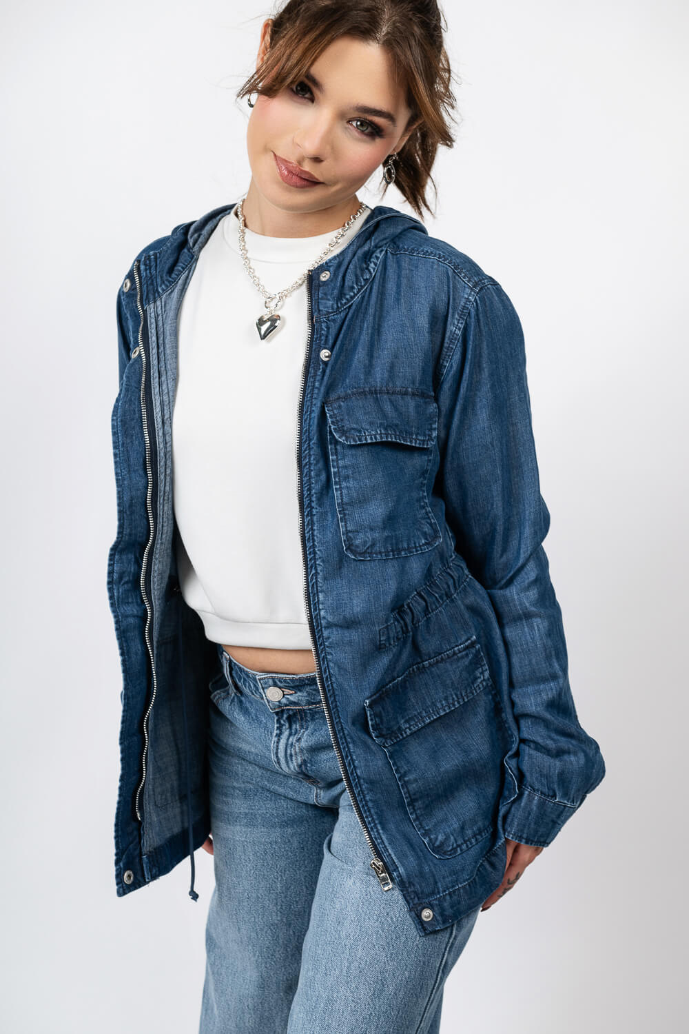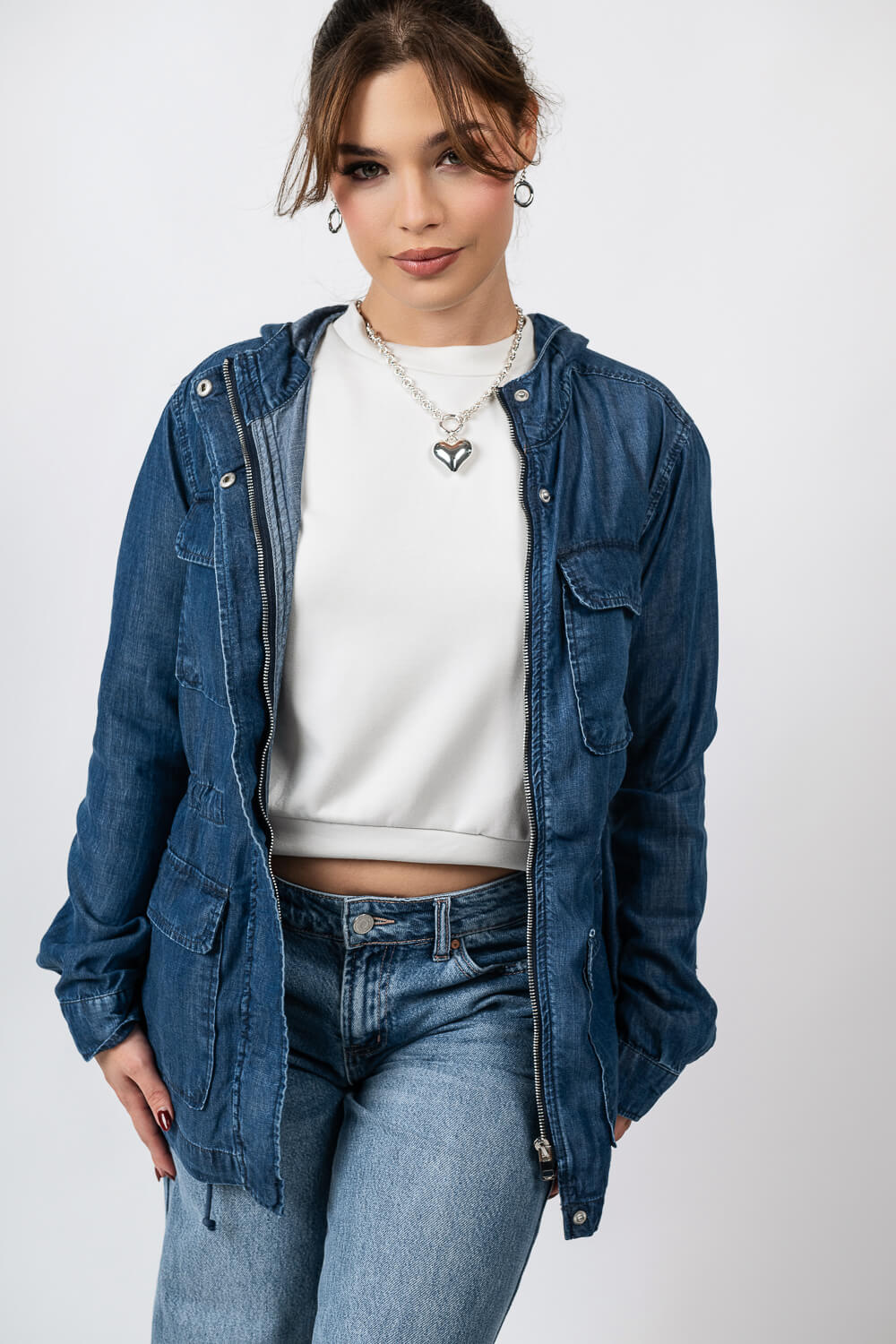 Chaqueta denim liviano en Tencel con cordón ajustable y gorro