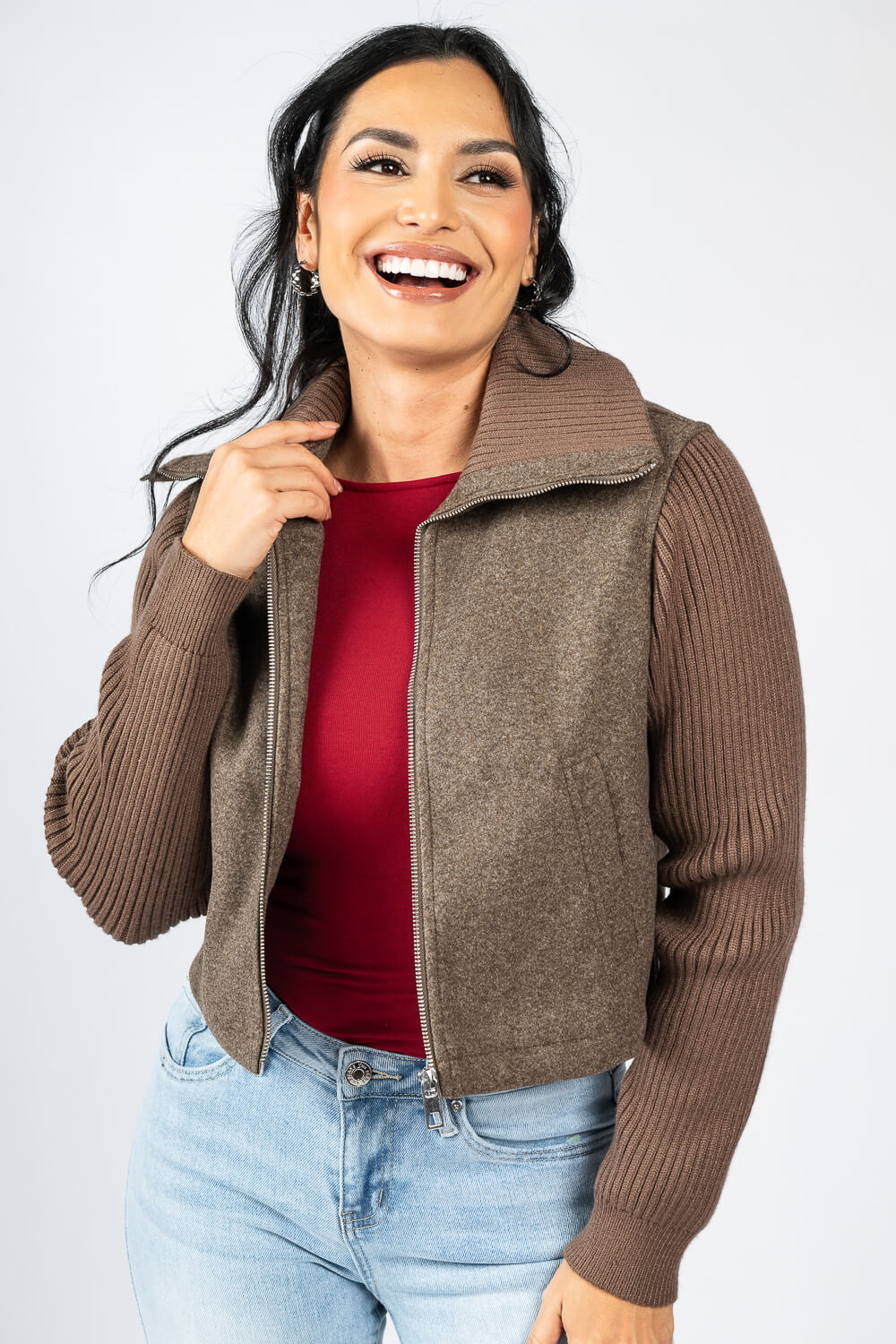 Chaqueta imitación lana con mangas en tela contrastante